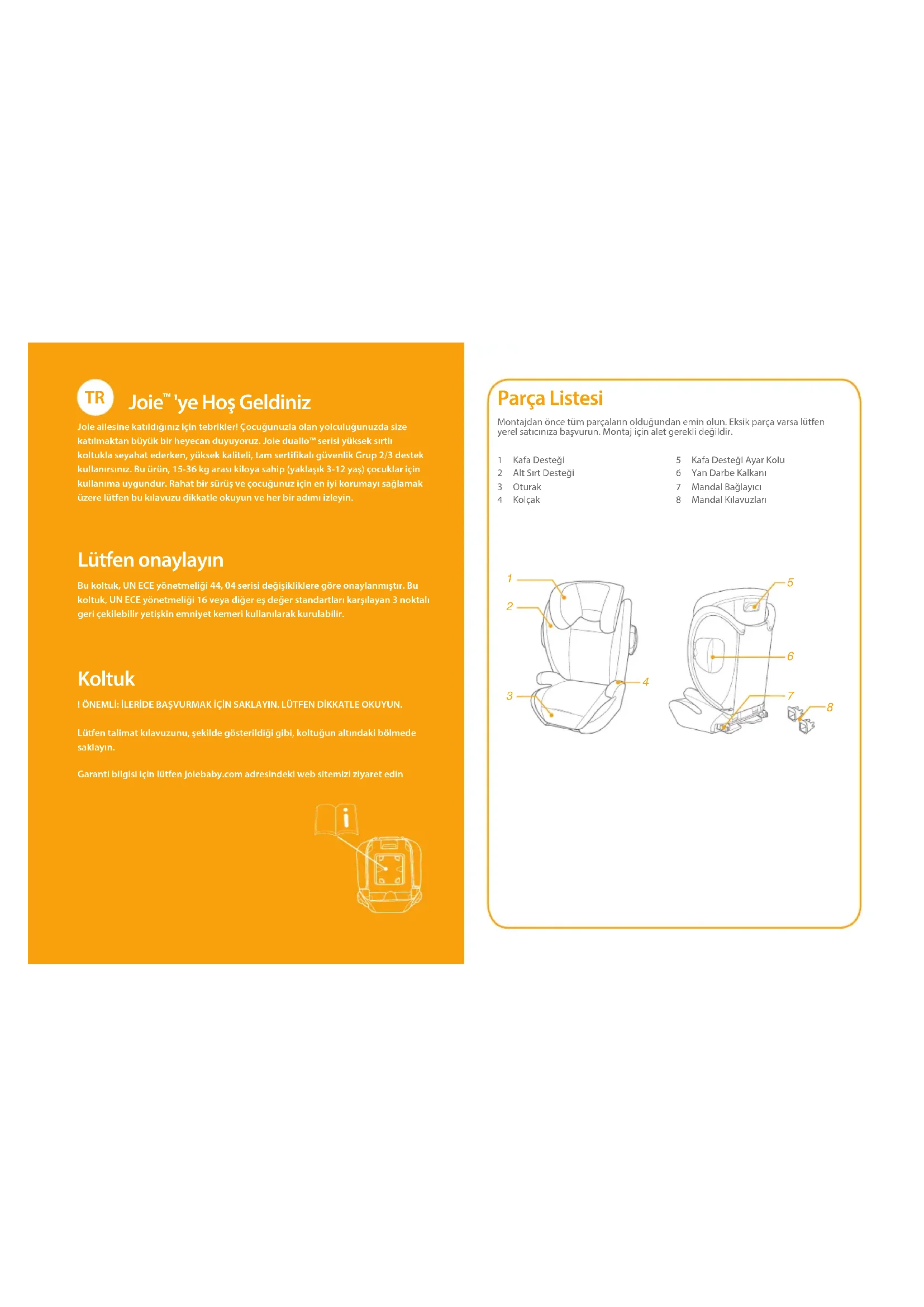 'ye Hoş Geldiniz Joie ailesine katıldığınız için tebrikler! Çocuğunuzla olan yolculuğunuzda size katılmaktan büyük bir heyecan duyuyoruz. Joie duallo™ serisi yüksek sırtlı koltukla seyahat ederken, yüksek kaliteli, tam sertifikalı güvenlik Grup 2/3 destek kullanırsınız. Bu ürün, 15-36 kg arası kiloya sahip (yaklaşık 3-12 yaş) çocuklar için kullanıma uygundur. Rahat bir sürüş ve çocuğunuz için en iyi korumayı sağlamak üzere lütfen bu kılavuzu dikkatle okuyun ve her bir adımı izleyin. Lütfen onaylayın Bu koltuk, UN ECE yönetmeliği 44, 04 serisi değişikliklere göre onaylanmıştır. Bu koltuk, UN ECE yönetmeliği 16 veya diğer eş değer standartları karşılayan 3 noktalı geri çekilebilir yetişkin emniyet kemeri kullanılarak kurulabilir. Koltuk ! ÖNEMLİ: İLERİDE BAŞVURMAK İÇİN SAKLAYIN. LÜTFEN DİKKATLE OKUYUN.Lütfen talimat kılavuzunu, şekilde gösterildiği gibi, koltuğun altındaki bölmede saklayın.Garanti bilgisi için lütfen joiebaby.com adresindeki web sitemizi ziyaret edin