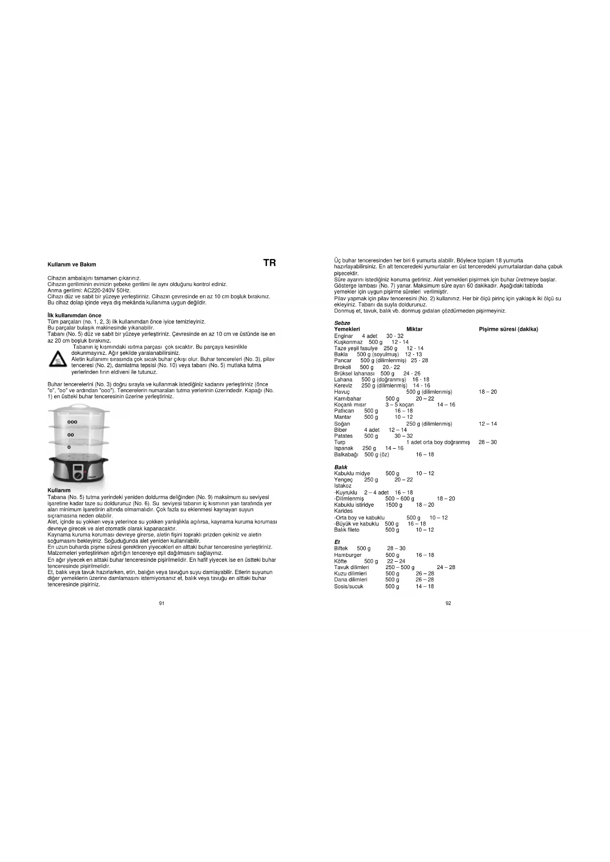 Üç buhar tenceresinden her biri 6 yumurta alabilir. Böylece toplam 18 yumurta hazırlayabilirsiniz. En alt tenceredeki yumurtalar en üst tenceredeki yumurtalardan daha çabuk pişecektir. Süre ayarını istediğiniz konuma getiriniz. Alet yemekleri pişirmek için buhar üretmeye başlar. Gösterge lambası (No. 7) yanar. Maksimum süre ayarı 60 dakikadır. Aşağıdaki tabloda yemekler için uygun pişirme süreleri verilmiştir. Pilav yapmak için pilav tenceresini (No. 2) kullanınız. Her bir ölçü pirinç için yaklaşık iki ölçü su ekleyiniz. Tabanı da suyla doldurunuz. Donmuş et, tavuk, balık vb. donmuş gıdaları çözdürmeden pişirmeyiniz. Sebze Yemekleri Miktar Pişirme süresi (dakika) Enginar 4 adet 30 - 32 Kuşkonmaz 500 g 12 - 14 Taze yeşil fasulye 250 g 12 - 14 Bakla 500 g (soyulmuş) 12 - 13 Pancar 500 g (dilimlenmiş) 25 - 28 Brokoli 500 g 20.- 22 Brüksel lahanası 500 g 24 - 26 Lahana 500 g (doğranmış) 16 - 18 Kereviz 250 g (dilimlenmiş) 14 - 16 Havuç 500 g (dilimlenmiş) 18 – 20 Karnıbahar 500 g 20 – 22 Koçanlı mısır 3 – 5 koçan 14 – 16 Patlıcan 500 g 16 – 18 Mantar 500 g 10 – 12 Soğan 250 g (dilimlenmiş) 12 – 14 Biber 4 adet 12 – 14 Patates 500 g 30 – 32 Turp 1 adet orta boy doğranmış 28 – 30 Ispanak 250 g 14 – 16 Balkabağı 500 g (öz) 16 – 18 Balık Kabuklu midye 500 g 10 – 12 Yengeç 250 g 20 – 22 Istakoz -Kuyruklu 2 – 4 adet 16 – 18 -Dilimlenmiş 500 – 600 g 18 – 20 Kabuklu istiridye 1500 g 18 – 20 Karides -Orta boy ve kabuklu 500 g 10 – 12 -Büyük ve kabuklu 500 g 16 – 18 Balık fileto 500 g 10 – 12