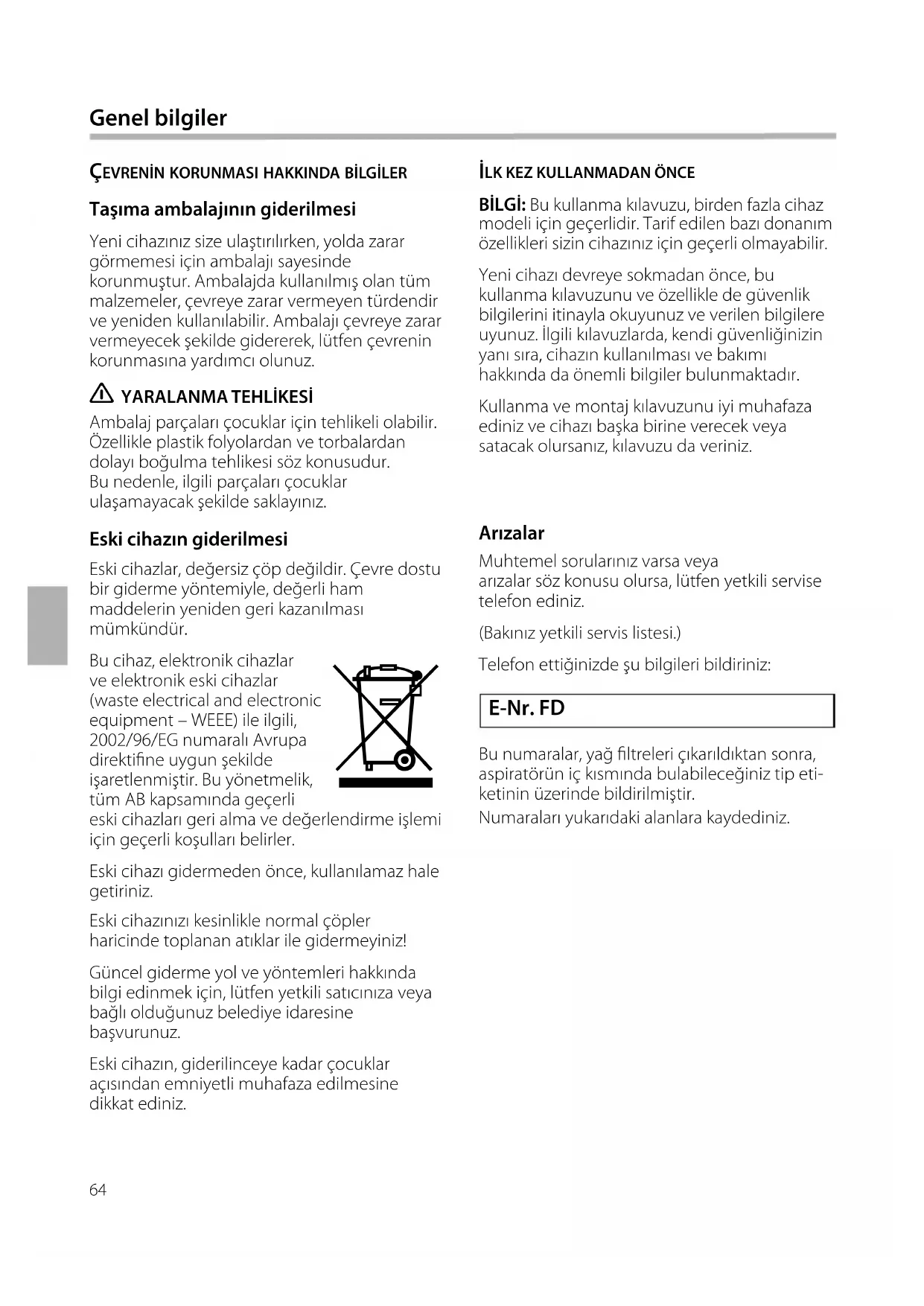 Ambalaj parçaları çocuklar için tehlikeli olabilir.Özellikle plastik folyolardan ve torbalardandolayı boğulma tehlikesi söz konusudur. Bu nedenle, ilgili parçaları çocuklarulaşamayacak şekilde saklayınız. Eski cihazın giderilmesi Eski cihazlar, değersiz çöp değildir. Çevre dostubir giderme yöntemiyle, değerli hammaddelerin yeniden geri kazanılmasımümkündür.Bu cihaz, elektronik cihazlar ve elektronik eski cihazlar(waste electrical and electronicequipment – WEEE) ile ilgili,2002/96/EG numaralı Avrupadirektine uygun şekildeişaretlenmiştir. Bu yönetmelik,tüm AB kapsamında geçerlieski cihazları geri alma ve değerlendirme işlemiiçin geçerli koşulları belirler.Eski cihazı gidermeden önce, kullanılamaz halegetiriniz.Eski cihazınızı kesinlikle normal çöplerharicinde toplanan atıklar ile gidermeyiniz!Güncel giderme yol ve yöntemleri hakkındabilgi edinmek için, lütfen yetkili satıcınıza veyabağlı olduğunuz belediye idaresinebaşvurunuz.Eski cihazın, giderilinceye kadar çocuklaraçısından emniyetli muhafaza edilmesinedikkat ediniz. Arızalar Muhtemel sorularınız varsa veya arızalar söz konusu olursa, lütfen yetkili servisetelefon ediniz.(Bakınız yetkili servis listesi.)Telefon ettiğinizde şu bilgileri bildiriniz:Bu numaralar, yağ ltreleri çıkarıldıktan sonra,aspiratörün iç kısmında bulabileceğiniz tip eti-ketinin üzerinde bildirilmiştir.Numaraları yukarıdaki alanlara kaydediniz.