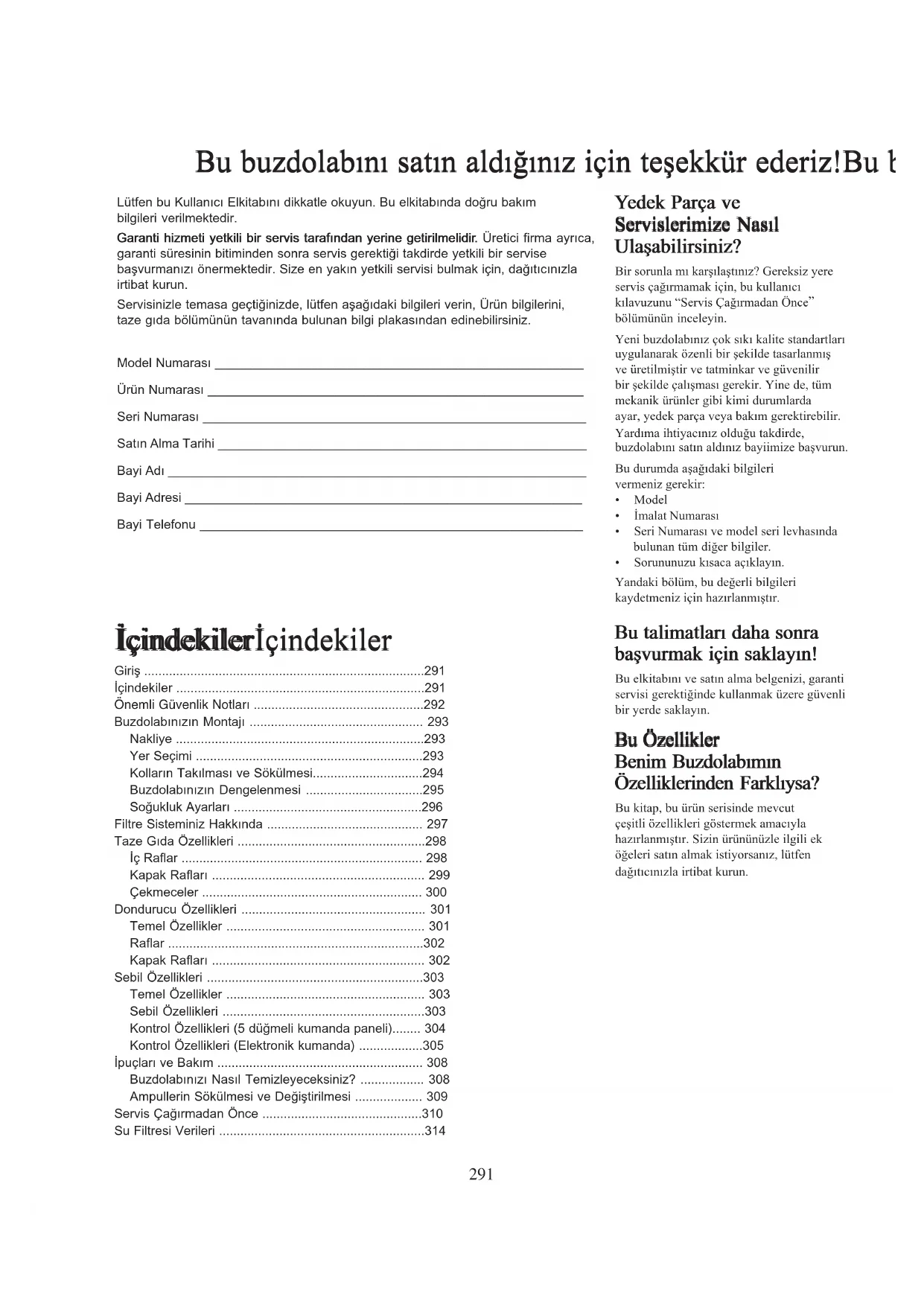 - Sorununuzu kýsaca açýklayýn. Yandaki bölüm, bu deðerli bilgileri kaydetmeniz için hazýrlanmýþtýr. Bu ÖzelliklerBu Özellikler Bu ÖzelliklerBu Özellikler Bu Özellikler Benim BuzdolabýmýnBenim Buzdolabýmýn Benim BuzdolabýmýnBenim Buzdolabýmýn Benim Buzdolabýmýn Özelliklerinden Farklýysa?Özelliklerinden Farklýysa? Özelliklerinden Farklýysa?Özelliklerinden Farklýysa? Özelliklerinden Farklýysa? Bu kitap, bu ürün serisinde mevcut çeþitli özellikleri göstermek amacýyla hazýrlanmýþtýr. Sizin ürününüzle ilgili ek öðeleri satýn almak istiyorsanýz, lütfen daðýtýcýnýzla irtibat kurun. Bu talimatlarý daha sonraBu talimatlarý daha sonra Bu talimatlarý daha sonraBu talimatlarý daha sonra Bu talimatlarý daha sonra baþvurmak için saklayýn!baþvurmak için saklayýn! baþvurmak için saklayýn!baþvurmak için saklayýn! baþvurmak için saklayýn! Bu elkitabýný ve satýn alma belgenizi, garanti servisi gerektiðinde kullanmak üzere güvenli bir yerde saklayýn.292 Önemli Güvenlik NotlarýÖnemli Güvenlik Notlarý Önemli Güvenlik NotlarýÖnemli Güvenlik Notlarý Önemli Güvenlik Notlarý Özellikler ÞemasýÖzellikler Þemasý Özellikler ÞemasýÖzellikler Þemasý Özellikler Þemasý