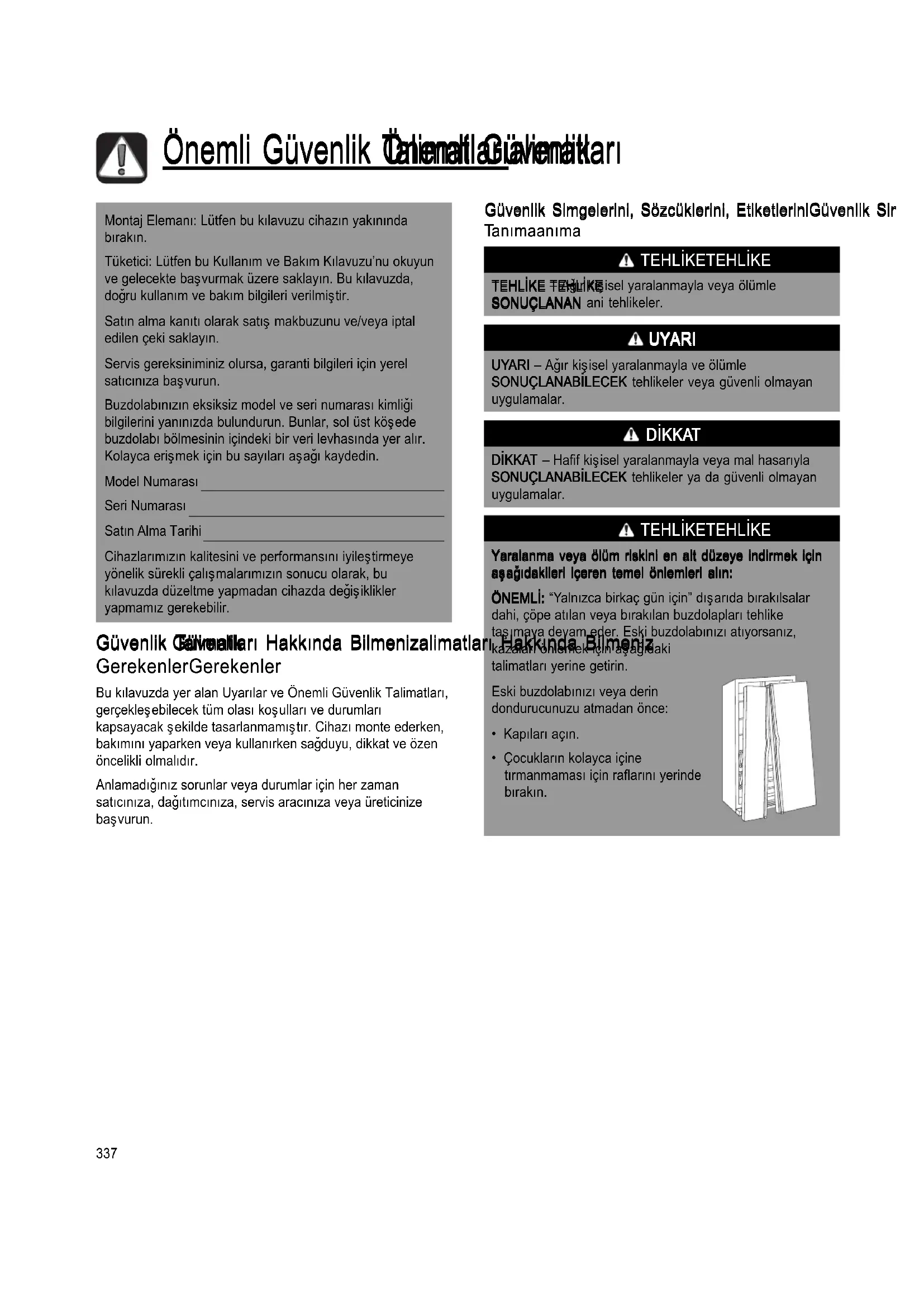 alimatlarýalimatlarý alimatlarýalimatlarý alimatlarý Montaj Elemaný: Lütfen bu kýlavuzu cihazýn yakýnýnda býrakýn. Tüketici: Lütfen bu Kullaným ve Bakým Kýlavuzu’nu okuyun ve gelecekte baþvurmak üzere saklayýn. Bu kýlavuzda, doðru kullaným ve bakým bilgileri verilmiþtir. Satýn alma kanýtý olarak satýþ makbuzunu ve/veya iptal edilen çeki saklayýn. Servis gereksiniminiz olursa, garanti bilgileri için yerel satýcýnýza baþvurun. Buzdolabýnýzýn eksiksiz model ve seri numarasý kimliði bilgilerini yanýnýzda bulundurun. Bunlar, sol üst köþede buzdolabý bölmesinin içindeki bir veri levhasýnda yer alýr. Kolayca eriþmek için bu sayýlarý aþaðý kaydedin. Model Numarasý Seri Numarasý Satýn Alma Tarihi Cihazlarýmýzýn kalitesini ve performansýný iyileþtirmeye yönelik sürekli çalýþmalarýmýzýn sonucu olarak, bu kýlavuzda düzeltme yapmadan cihazda deðiþiklikler yapmamýz gerekebilir. Güvenlik Güvenlik Güvenlik Güvenlik Güvenlik