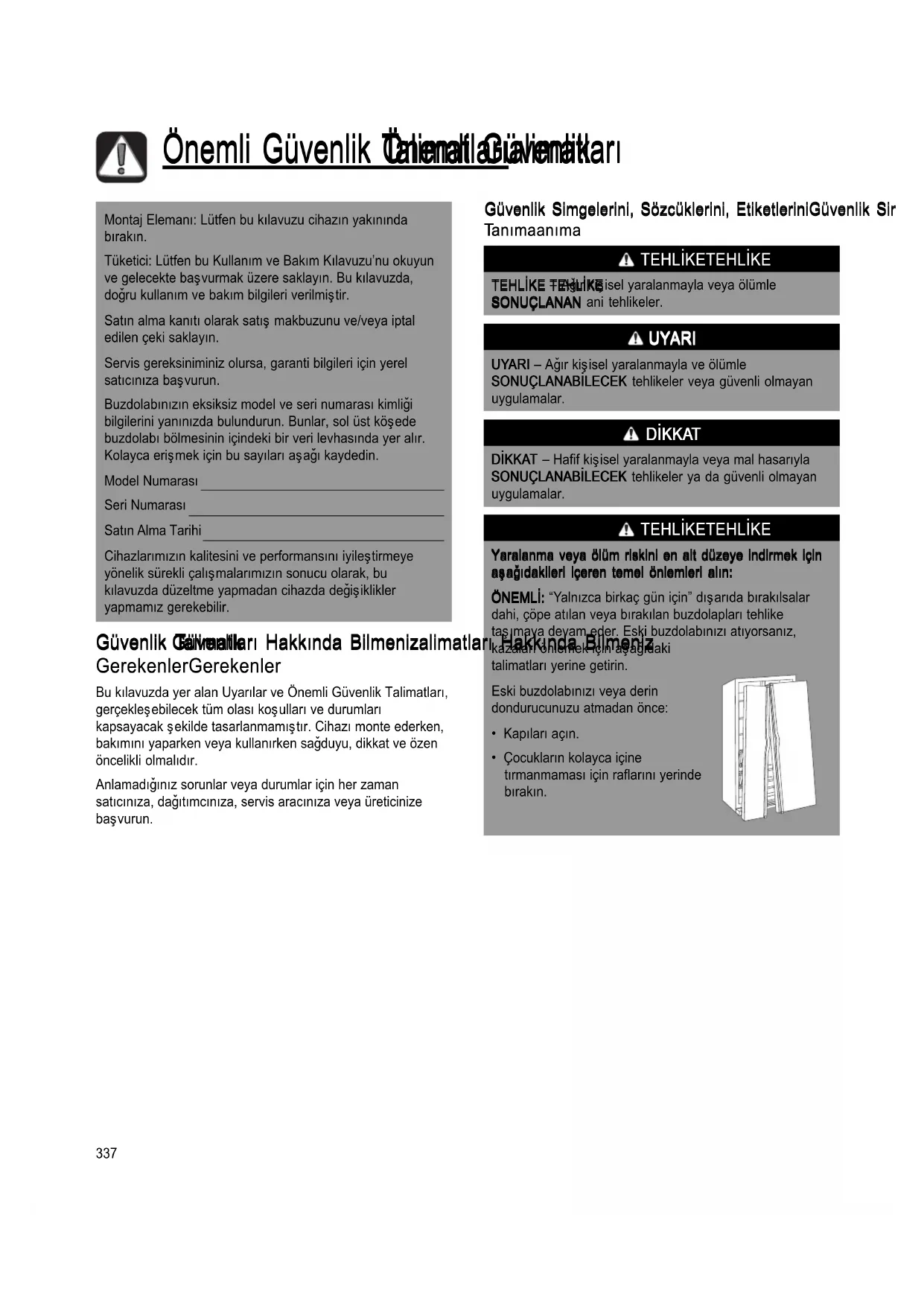 | Yiyecekler yüzüncü | Kapi dioğru seksilde kapatilmıyor. | Buzdolabi dizdurmamaktadir. Buzdolabinizi ayntl duzeyete getirme yontemi hakinda ayntüll bilgi icin bzk: sayfa 342. |