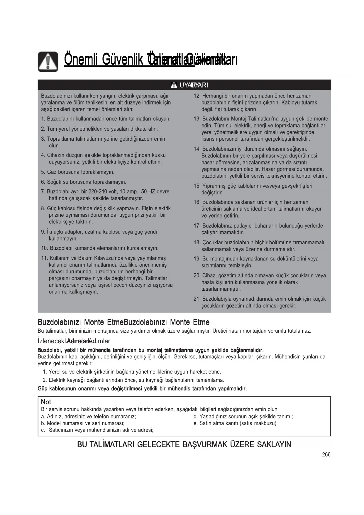 OLASI NEDENLER Buzdolabý, buz çözme modundadýr. Kumanda ayarlarý çok düþük ayarlanmýþ. Buzdolabýnýn fiþi prize takýlmamýþ. Kumanda çalýþmýyor. Sigorta atmýþ veya devre kesicinin sýfýrlanmasý gerekiyor olabilir. Elektrik kesintisi olmuþ. Buzdolabý bozuluyor. Kondansatör bobinleri kirlenmiþ. Buzdolabý veya derin dondurucu kumanda elemanlarý çok yüksek ayarlanmýþ. Kapý doðru þekilde kapanmýyor. Kumanda elemanlarýnýn ayarlanmasý gerekiyor. Kondansatör bobinleri kirlenmiþ. Arka hava ýzgarasýnýn önü kapanmýþ. Kapý sýk sýk açýlmýþ veya uzun süreler açýk býrakýlmýþ. Yiyecek kýsa süre önce yerleþtirilmiþ. Bölme kirmlenmiþ veya bölmede koku yapan yiyecek var. Doðru kapanýp kapanmadýðýna bakmak için contalarý kontrol edin. Nem oraný yüksek. Kumanda elemanlarýnýn ayarlanmasý gerekiyor. SORUNSORUN SORUNSORUN SORUN Derin dondurucuDerin dondurucu Derin dondurucuDerin dondurucu Derin dondurucu kumanda birimi vekumanda birimi ve kumanda birimi vekumanda birimi ve kumanda birimi ve ýþýklarý açýk, amaýþýklarý açýk, ama ýþýklarý açýk, amaýþýklarý açýk, ama ýþýklarý açýk, ama kompresör çalýþmýyorkompresör çalýþmýyor kompresör çalýþmýyorkompresör çalýþmýyor kompresör çalýþmýyor Sebzelik çekmesiSebzelik çekmesi Sebzelik çekmesiSebzelik çekmesi Sebzelik çekmesi sýcaklýðý çok ýlýksýcaklýðý çok ýlýk sýcaklýðý çok ýlýksýcaklýðý çok ýlýk sýcaklýðý çok ýlýk Buzdolabý çalýþmýyorBuzdolabý çalýþmýyor Buzdolabý çalýþmýyorBuzdolabý çalýþmýyor Buzdolabý çalýþmýyor Buzdolabý halaBuzdolabý hala Buzdolabý halaBuzdolabý hala Buzdolabý hala çalýþmýyorçalýþmýyor çalýþmýyorçalýþmýyor çalýþmýyor