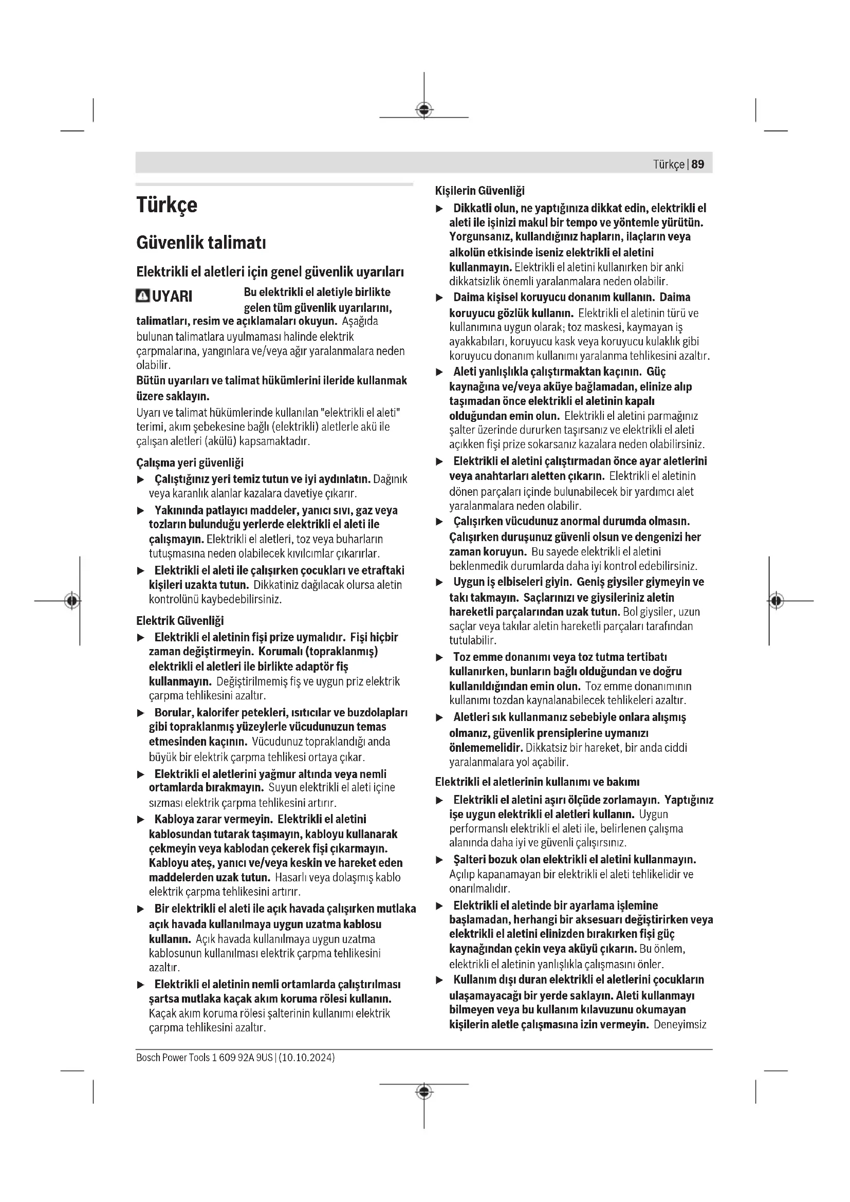 Τα ηλεκτρικά εργαλεία, οι μπαταρίες, τα εξαρτή- ματα και οι συσκευασίες πρέπει να ανακυκλώνο- νται με τρόπο φιλικό προς το περιβάλλον. Μην ρίχνετε τα ηλεκτρικά εργαλεία και τις μπατα- ρίες στα απορρίμματα του σπιτιού σας! Μόνο για χώρες τηςΕΕ: Τα άχρηστα ηλεκτρικά εργαλεία και οι χαλασμένες ή χρησιμο- ποιημένες μπαταρίες πρέπει να αποσύρονται ξεχωριστά. Χρη- σιμοποιείτε τα προβλεπόμενα συστήματα συλλογής. Εάν οι παλαιές ηλεκτρικές και ηλεκτρονικές συσκευές απορρί- πτονται με ακατάλληλο τρόπο, μπορεί να έχουν επιβλαβείς επι- πτώσεις στο περιβάλλον και την ανθρώπινη υγεία λόγω της πι- θανής παρουσίας επικίνδυνων ουσιών. Μπαταρίες/Επαναφορτιζόμενες μπαταρίες: Li-Ion: Προσέξτε παρακαλώ τις υποδείξεις στην ενότητα Μεταφορά (βλέπε «Μεταφορά», Σελίδα88). 1 609 92A 9US | (10.10.2024) Bosch Power ToolsTürkçe | 89 Türkçe Güvenlik talimatı Elektrikli el aletleri için genel güvenlik uyarıları UYARI Bu elektrikli el aletiyle birlikte gelen tüm güvenlik uyarılarını, talimatları, resim ve açıklamaları okuyun. Aşağıda bulunan talimatlara uyulmaması halinde elektrik çarpmalarına, yangınlara ve/veya ağır yaralanmalara neden olabilir. Bütün uyarıları ve talimat hükümlerini ileride kullanmak üzere saklayın. Uyarı ve talimat hükümlerinde kullanılan "elektrikli el aleti" terimi, akım şebekesine bağlı (elektrikli) aletlerle akü ile çalışan aletleri (akülü) kapsamaktadır. Çalışma yeri güvenliği u Çalıştığınız yeri temiz tutun ve iyi aydınlatın. Dağınık veya karanlık alanlar kazalara davetiye çıkarır. u Yakınında patlayıcı maddeler, yanıcı sıvı, gaz veya tozların bulunduğu yerlerde elektrikli el aleti ile çalışmayın. Elektrikli el aletleri, toz veya buharların tutuşmasına neden olabilecek kıvılcımlar çıkarırlar. u Elektrikli el aleti ile çalışırken çocukları ve etraftaki kişileri uzakta tutun. Dikkatiniz dağılacak olursa aletin kontrolünü kaybedebilirsiniz. Elektrik Güvenliği u Elektrikli el aletinin fişi prize uymalıdır. Fişi hiçbir zaman değiştirmeyin. Korumalı (topraklanmış) elektrikli el aletleri ile birlikte adaptör fiş kullanmayın. Değiştirilmemiş fiş ve uygun priz elektrik çarpma tehlikesini azaltır. u Borular, kalorifer petekleri, ısıtıcılar ve buzdolapları gibi topraklanmış yüzeylerle vücudunuzun temas etmesinden kaçının. Vücudunuz topraklandığı anda büyük bir elektrik çarpma tehlikesi ortaya çıkar. u Elektrikli el aletlerini yağmur altında veya nemli ortamlarda bırakmayın. Suyun elektrikli el aleti içine sızması elektrik çarpma tehlikesini artırır. u Kabloya zarar vermeyin. Elektrikli el aletini kablosundan tutarak taşımayın, kabloyu kullanarak çekmeyin veya kablodan çekerek fişi çıkarmayın. Kabloyu ateş, yanıcı ve/veya keskin ve hareket eden maddelerden uzak tutun. Hasarlı veya dolaşmış kablo elektrik çarpma tehlikesini artırır. u Bir elektrikli el aleti ile açık havada çalışırken mutlaka açık havada kullanılmaya uygun uzatma kablosu kullanın. Açık havada kullanılmaya uygun uzatma kablosunun kullanılması elektrik çarpma tehlikesini azaltır. u Elektrikli el aletinin nemli ortamlarda çalıştırılması şartsa mutlaka kaçak akım koruma rölesi kullanın. Kaçak akım koruma rölesi şalterinin kullanımı elektrik çarpma tehlikesini azaltır. Kişilerin Güvenliği u Dikkatli olun, ne yaptığınıza dikkat edin, elektrikli el aleti ile işinizi makul bir tempo ve yöntemle yürütün. Yorgunsanız, kullandığınız hapların, ilaçların veya alkolün etkisinde iseniz elektrikli el aletini kullanmayın. Elektrikli el aletini kullanırken bir anki dikkatsizlik önemli yaralanmalara neden olabilir. u Daima kişisel koruyucu donanım kullanın. Daima koruyucu gözlük kullanın. Elektrikli el aletinin türü ve kullanımına uygun olarak; toz maskesi, kaymayan iş ayakkabıları, koruyucu kask veya koruyucu kulaklık gibi koruyucu donanım kullanımı yaralanma tehlikesini azaltır. u Aleti yanlışlıkla çalıştırmaktan kaçının. Güç kaynağına ve/veya aküye bağlamadan, elinize alıp taşımadan önce elektrikli el aletinin kapalı olduğundan emin olun. Elektrikli el aletini parmağınız şalter üzerinde dururken taşırsanız ve elektrikli el aleti açıkken fişi prize sokarsanız kazalara neden olabilirsiniz. u Elektrikli el aletini çalıştırmadan önce ayar aletlerini veya anahtarları aletten çıkarın. Elektrikli el aletinin dönen parçaları içinde bulunabilecek bir yardımcı alet yaralanmalara neden olabilir. u Çalışırken vücudunuz anormal durumda olmasın. Çalışırken duruşunuz güvenli olsun ve dengenizi her zaman koruyun. Bu sayede elektrikli el aletini beklenmedik durumlarda daha iyi kontrol edebilirsiniz. u Uygun iş elbiseleri giyin. Geniş giysiler giymeyin ve takı takmayın. Saçlarınızı ve giysileriniz aletin hareketli parçalarından uzak tutun. Bol giysiler, uzun saçlar veya takılar aletin hareketli parçaları tarafından tutulabilir. u Toz emme donanımı veya toz tutma tertibatı kullanırken, bunların bağlı olduğundan ve doğru kullanıldığından emin olun. Toz emme donanımının kullanımı tozdan kaynalanabilecek tehlikeleri azaltır. u Aletleri sık kullanmanız sebebiyle onlara alışmış olmanız, güvenlik prensiplerine uymanı