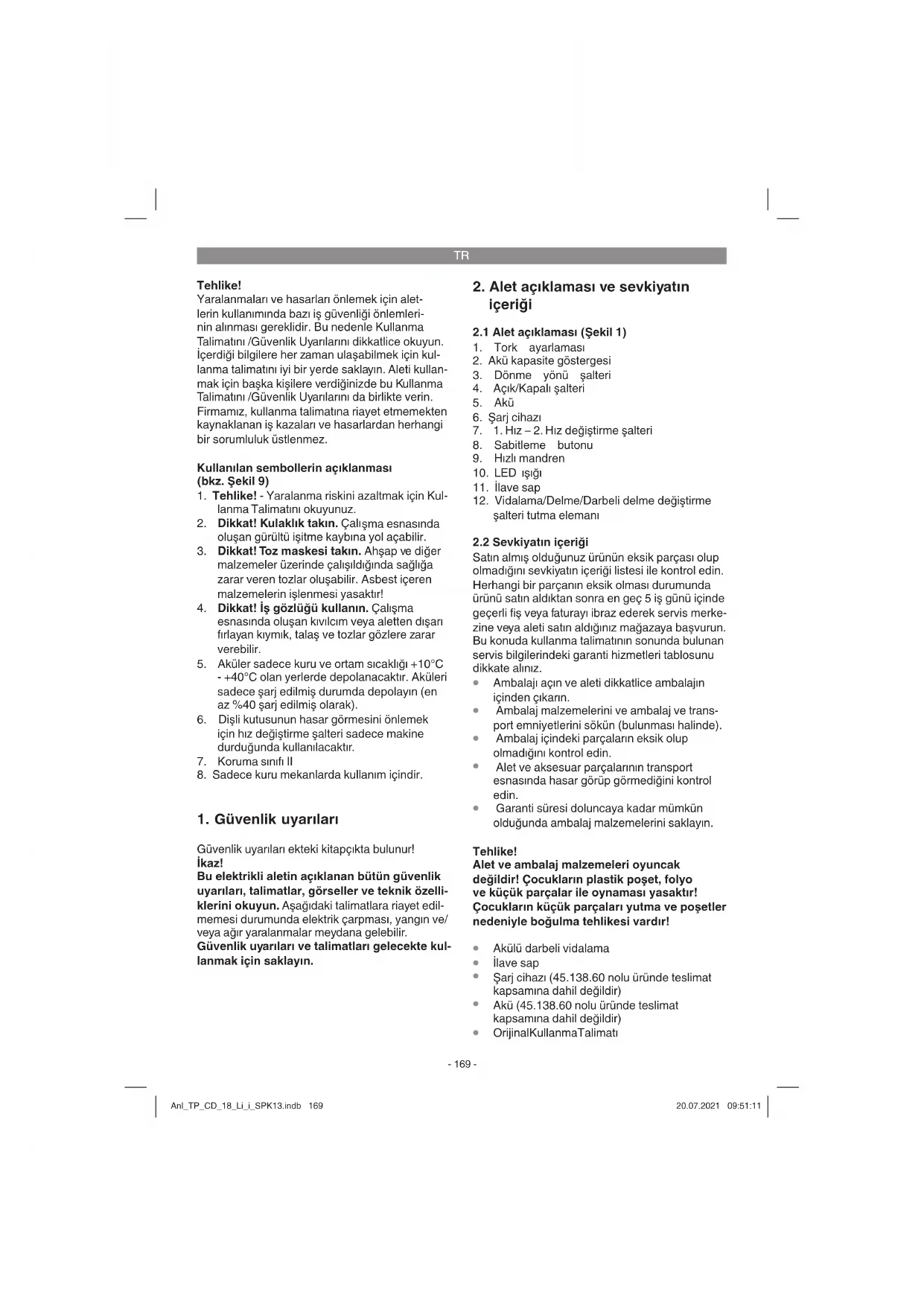İş eldiveni takın. Dikkat! Kalan riskler Bu elektrikli aleti, kullanma talimatına uygun şekilde kullansanız dahi yine de bazı riskler mevcut kalır. Bu elektrikli aletin yapı türü ve Anl_TP_CD_18_Li_i_SPK13.indb 170Anl_TP_CD_18_Li_i_SPK13.indb 170 20.07.2021 09:51:1120.07.2021 09:51:11TR