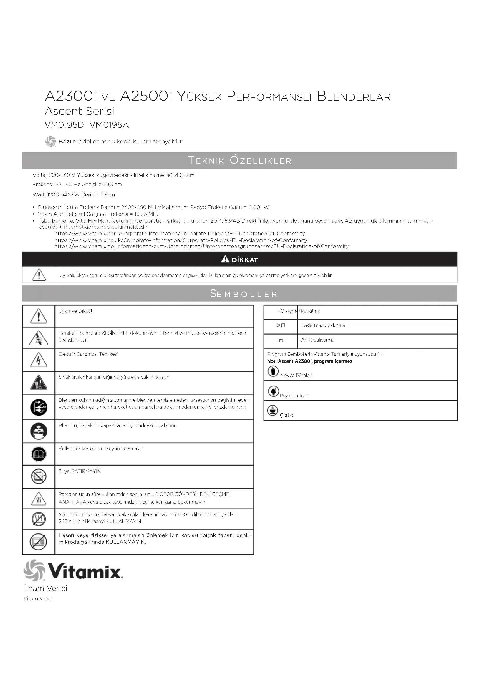 Başlatma/Durdurma Anlık ÇalıştırmaProgram Semboller (Vtamx Tarfleryle uyumludur) - Not: Ascent A2300i, program içermez Meyve Püreler Buzlu Tatlılar Çorba VM0195D VM0195A Bazı modeller her ülkede kullanılamayablr İlham Verc vtamx.com DİKKAT Uyumluluktan sorumlu kş tarafından açıkça onaylanmamış değşklkler, kullanıcının bu ekpmanı çalıştırma yetksn geçersz kılablr.130 gü v e n l İ ku l l a n İm İç İn ön e m l İ ta l İm at l a r UYARI: Vitamix® blenderınızı kullanırken ciddi yaralanma riskini önlemek için aşağıdakileri içeren temel güvenlik önlemlerini uygulayın. BLENDERI ÇALIŞTIRMADAN ÖNCE TÜM TALİMATLARI, ÖNLEMLERİ VE UYARILARI OKUYUN.GÜVENLİ KULLANIMA YÖNELİK ÖNEMLİ TALİMATLAR Bu ürün YALNIZCA EVDE KULLANIMA yöneliktir ve ticari amaçla kullanım için tasarlanmamıştır. Çalışırken Vitamix blender cihazının başından ayrılmayın. Parçaların onarımı, bakıma alınması veya değiştirilmesi Vitamix ya da yetkili Vitamix servis temsilcisi tarafından gerçekleştirilmelidir. BİLDİRİM: ÖNEMLİ TEDBİRLERİN VE GÜVENLİ KULLANIMA YÖNELİK ÖNEMLİ TALİMATLARIN UYGULANMAMASI, VITAMIX BLENDERINIZIN HATALI BİR ŞEKİLDE KULLANILDIĞI ANLAMINA GELİR, GARANTİNİZİ GEÇERSİZ KILABİLİR VE CİDDİ YARALANMALARA NEDEN OLABİLİR.