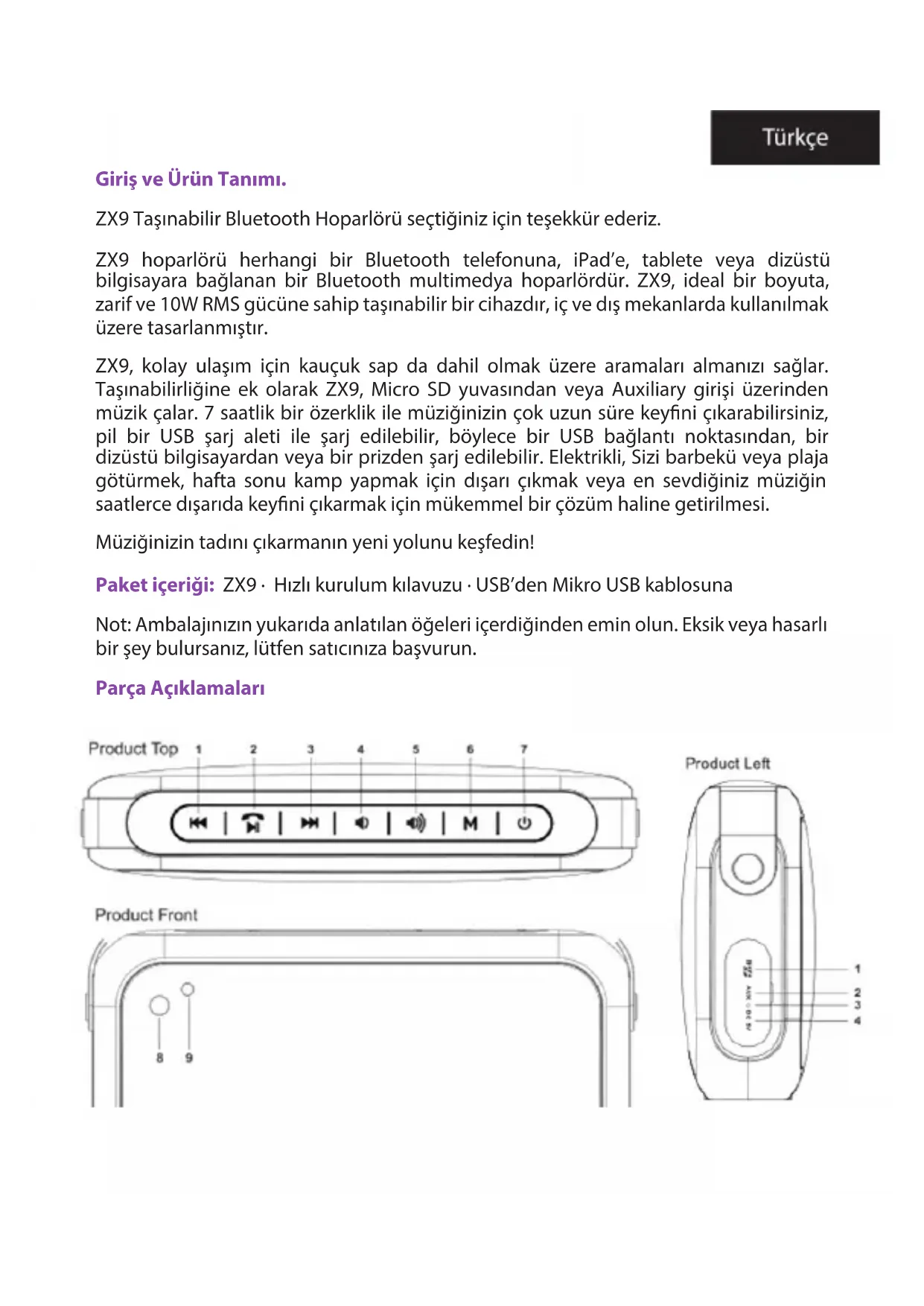 batérie a vykonajte pravidelné nabíjanie. Technická podpora Navštívte našu webovú stránku www.billowtechnology.com, kde nájdete viac informácií o inštalácii a kongurácii tohto produktu.Giriş ve Ürün Tanımı. ZX9 Taşınabilir Bluetooth Hoparlörü seçtiğiniz için teşekkür ederiz. ZX9 hoparlörü herhangi bir Bluetooth telefonuna, iPad’e, tablete veya dizüstü bilgisayara bağlanan bir Bluetooth multimedya hoparlördür. ZX9, ideal bir boyuta, zarif ve 10W RMS gücüne sahip taşınabilir bir cihazdır, iç ve dış mekanlarda kullanılmak üzere tasarlanmıştır. ZX9, kolay ulaşım için kauçuk sap da dahil olmak üzere aramaları almanızı sağlar. Taşınabilirliğine ek olarak ZX9, Micro SD yuvasından veya Auxiliary girişi üzerinden müzik çalar. 7 saatlik bir özerklik ile müziğinizin çok uzun süre keyni çıkarabilirsiniz, pil bir USB şarj aleti ile şarj edilebilir, böylece bir USB bağlantı noktasından, bir dizüstü bilgisayardan veya bir prizden şarj edilebilir. Elektrikli, Sizi barbekü veya plaja götürmek, hafta sonu kamp yapmak için dışarı çıkmak veya en sevdiğiniz müziğin saatlerce dışarıda keyni çıkarmak için mükemmel bir çözüm haline getirilmesi. Müziğinizin tadını çıkarmanın yeni yolunu keşfedin! Paket içeriği: ZX9 · Hızlı kurulum kılavuzu · USB’den Mikro USB kablosuna Not: Ambalajınızın yukarıda anlatılan öğeleri içerdiğinden emin olun. Eksik veya hasarlı bir şey bulursanız, lütfen satıcınıza başvurun. Parça Açıklamaları1. Önceki şarkı