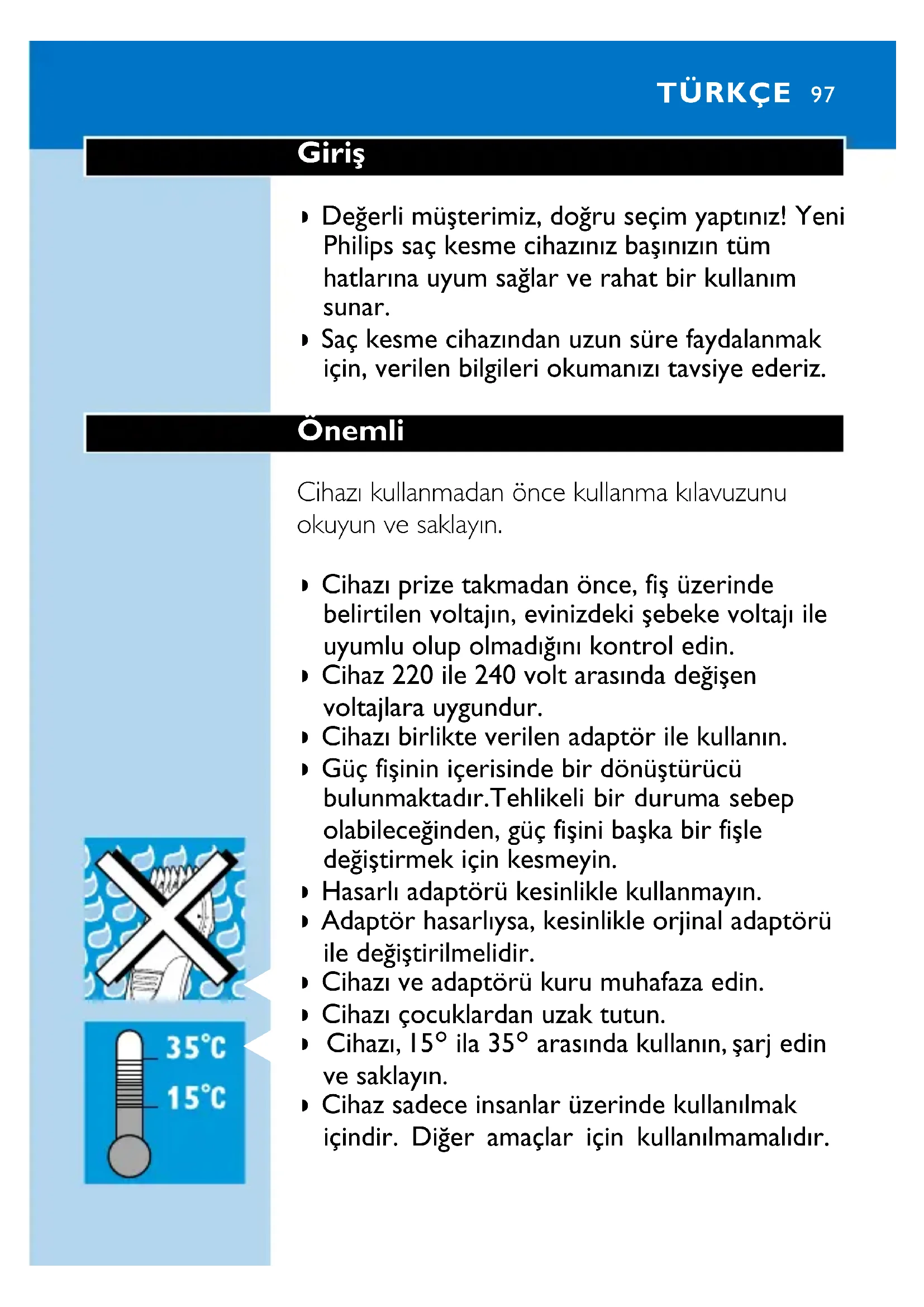 BV Philips. 96Giriş ◗ Değerli müşterimiz, doğru seçim yaptınız! Yeni Philips saç kesme cihazınız başınızın tüm hatlarına uyum sağlar ve rahat bir kullanım sunar. ◗ Saç kesme cihazından uzun süre faydalanmak için, verilen bilgileri okumanızı tavsiye ederiz. Önemli Cihazı kullanmadan önce kullanma kılavuzunu okuyun ve saklayın. ◗ Cihazı prize takmadan önce, fiş üzerinde belirtilen voltajın, evinizdeki şebeke voltajı ile uyumlu olup olmadığını kontrol edin. ◗ Cihaz 220 ile 240 volt arasında değişen voltajlara uygundur. ◗ Cihazı birlikte verilen adaptör ile kullanın. ◗ Güç fişinin içerisinde bir dönüştürücü bulunmaktadır.Tehlikeli bir duruma sebep olabileceğinden, güç fişini başka bir fişle değiştirmek için kesmeyin. ◗ Hasarlı adaptörü kesinlikle kullanmayın. ◗ Adaptör hasarlıysa, kesinlikle orjinal adaptörü ile değiştirilmelidir.