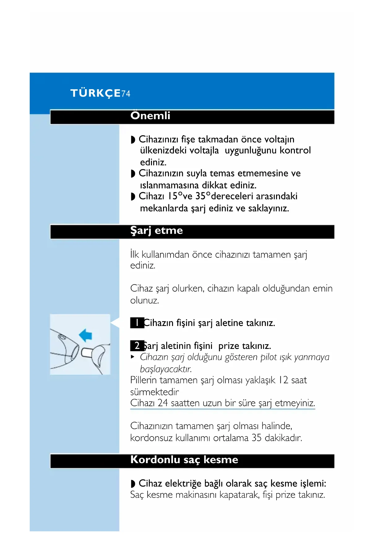 Cihazın şarj olduğunu gösteren pilot ışık yanmaya başlayacaktır. Pillerin tamamen şarj olması yaklaşık 12 saat sürmektedir Cihazı 24 saatten uzun bir süre şarj etmeyiniz. Cihazınızın tamamen şarj olması halinde, kordonsuz kullanımı ortalama 35 dakikadır. Kordonlu saç kesme ◗ Cihaz elektriğe bağlı olarak saç kesme işlemi: Saç kesme makinasını kapatarak, fişi prize takınız. TÜRKÇE74tekrar çalıştırmadan önce birkaç saniye bekleyiniz. Eğer piller tamamı ile boşalmışsa, cihazı çalıştırmadan önce birkaç dakika bekleyiniz. Şarj piliniz tamamen doluyken cihazınızı elektrikle kullanmamanız tavsiye edilir. Saçı Kesime Hazırlamak Tarak aparatı ile saç kesme