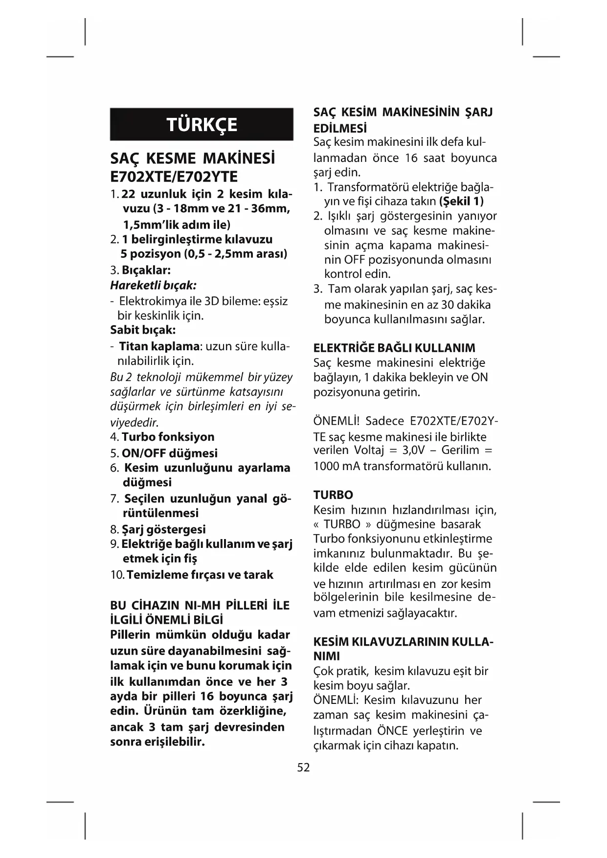 Saç kesme makinesini elektriğe bağlayın, 1 dakika bekleyin ve ON pozisyonuna getirin. ÖNEMLİ! Sadece E702XTE/E702Y- TE saç kesme makinesi ile birlikte verilen Voltaj = 3,0V – Gerilim = 1000 mA transformatörü kullanın. TURBO Kesim hızının hızlandırılması için, « TURBO » düğmesine basarak Turbo fonksiyonunu etkinleştirme imkanınız bulunmaktadır. Bu şe- kilde elde edilen kesim gücünün ve hızının artırılması en zor kesim bölgelerinin bile kesilmesine de- vam etmenizi sağlayacaktır.