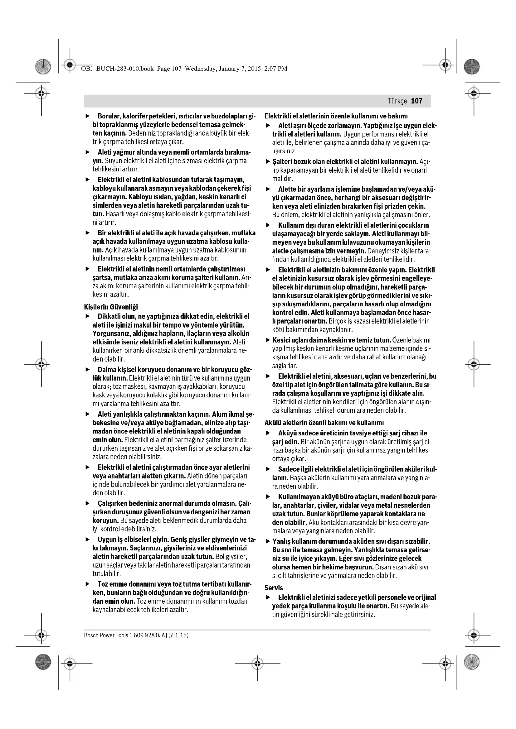 Elektrikli el aletinin bağlantı fişi prize uymalıdır. Fişi hiç- bir zaman değiştirmeyin. Koruyucu topraklanmış elek- trikli el aletleri ile birlikte adaptör fiş kullanmayın. Değiş- tirilmemiş fiş ve uygun priz elektrik çarpma tehlikesini azaltır. UYARI OBJ_BUCH-283-010.book Page 106 Wednesday, January 7, 2015 2:07 PMTürkçe | 107 Bosch Power Tools 1 609 92A 0JA | (7.1.15) Borular, kalorifer petekleri, ısıtıcılar ve buzdolapları gi- bi topraklanmış yüzeylerle bedensel temasa gelmek- ten kaçının. Bedeniniz topraklandığı anda büyük bir elek- trik çarpma tehlikesi ortaya çıkar. Aleti yağmur altında veya nemli ortamlarda bırakma- yın. Suyun elektrikli el aleti içine sızması elektrik çarpma tehlikesini artırır. Elektrikli el aletini kablosundan tutarak taşımayın, kabloyu kullanarak asmayın veya kablodan çekerek fişi çıkarmayın. Kabloyu ısıdan, yağdan, keskin kenarlı ci- simlerden veya aletin hareketli parçalarından uzak tu- tun. Hasarlı veya dolaşmış kablo elektrik çarpma tehlikesi- ni artırır. Bir elektrikli el aleti ile açık havada çalışırken, mutlaka açık havada kullanılmaya uygun uzatma kablosu kulla- nın. Açık havada kullanılmaya uygun uzatma kablosunun kullanılması elektrik çarpma tehlikesini azaltır. Elektrikli el aletinin nemli ortamlarda çalıştırılması şartsa, mutlaka arıza akımı koruma şalteri kullanın. Arı- za akımı koruma şalterinin kullanımı elektrik çarpma tehli- kesini azaltır. Kişilerin Güvenliği Dikkatli olun, ne yaptığınıza dikkat edin, elektrikli el aleti ile işinizi makul bir tempo ve yöntemle yürütün. Yorgunsanız, aldığınız hapların, ilaçların veya alkolün etkisinde iseniz elektrikli el aletini kullanmayın. Aleti kullanırken bir anki dikkatsizlik önemli yaralanmalara ne- den olabilir. Daima kişisel koruyucu donanım ve bir koruyucu göz- lük kullanın. Elektrikli el aletinin türü ve kullanımına uygun olarak; toz maskesi, kaymayan iş ayakkabıları, koruyucu kask veya koruyucu kulaklık gibi koruyucu donanım kullanı- mı yaralanma tehlikesini azalttır. Aleti yanlışlıkla çalıştırmaktan kaçının. Akım ikmal şe- bekesine ve/veya aküye bağlamadan, elinize alıp taşı- madan önce elektrikli el aletinin kapalı olduğundan emin olun. Elektrikli el aletini parmağınız şalter üzerinde dururken taşırsanız ve alet açıkken fişi prize sokarsanız ka- zalara neden olabilirsiniz. Elektrikli el aletini çalıştırmadan önce ayar aletlerini veya anahtarları aletten çıkarın. Aletin dönen parçaları içinde bulunabilecek bir yardımcı alet yaralanmalara ne- den olabilir. Çalışırken bedeniniz anormal durumda olmasın. Çalı- şırken duruşunuz güvenli olsun ve dengenizi her zaman koruyun. Bu sayede aleti beklenmedik durumlarda daha iyi kontrol edebilirsiniz. Uygun iş elbiseleri giyin. Geniş giysiler giymeyin ve ta- kı takmayın. Saçlarınızı, giysileriniz ve eldivenlerinizi aletin hareketli parçalarından uzak tutun. Bol giysiler, uzun saçlar veya takılar aletin hareketli parçaları tarafından tutulabilir. Toz emme donanımı veya toz tutma tertibatı kullanır- ken, bunların bağlı olduğundan ve doğru kullanıldığın- dan emin olun. Toz emme donanımının kullanımı tozdan kaynalanabilecek tehlikeleri azaltır. Elektrikli el aletlerinin özenle kullanımı ve bakımı Aleti aşırı ölçede zorlamayın. Yaptığınız işe uygun elek- trikli el aletleri kullanın. Uygun performanslı elektrikli el aleti ile, belirlenen çalışma alanında daha iyi ve güvenli ça- lışırsınız. Şalteri bozuk olan elektrikli el aletini kullanmayın. Açı- lıp kapanamayan bir elektrikli el aleti tehlikelidir ve onarıl- malıdır. Alette bir ayarlama işlemine başlamadan ve/veya akü- yü çıkarmadan önce, herhangi bir aksesuarı değiştirir- ken veya aleti elinizden bırakırken fişi prizden çekin. Bu önlem, elektrikli el aletinin yanlışlıkla çalışmasını önler. Kullanım dışı duran elektrikli el aletlerini çocukların ulaşamayacağı bir yerde saklayın. Aleti kullanmayı bil- meyen veya bu kullanım kılavuzunu okumayan kişilerin aletle çalışmasına izin vermeyin. Deneyimsiz kişiler tara- fından kullanıldığında elektrikli el aletleri tehlikelidir. Elektrikli el aletinizin bakımını özenle yapın. Elektrikli el aletinizin kusursuz olarak işlev görmesini engelleye- bilecek bir durumun olup olmadığını, hareketli parça- ların kusursuz olarak işlev görüp görmediklerini ve sıkı- şıp sıkışmadıklarını, parçaların hasarlı olup olmadığını kontrol edin. Aleti kullanmaya başlamadan önce hasar- lı parçaları onartın. Birçok iş kazası elektrikli el aletlerinin kötü bakımından kaynaklanır. Kesici uçları daima keskin ve temiz tutun. Özenle bakımı yapılmış keskin kenarlı kesme uçlarının malzeme içinde sı- kışma tehlikesi daha azdır ve daha rahat kullanım olanağı sağlarlar. Elektrikli el aletini, aksesuarı, uçları ve benzerlerini, bu özel tip alet için öngörülen talimata göre kullanın. Bu sı- rada çalışma koşullarını ve yaptığınız işi dikkate alın. Elektrikli el aletlerinin kendileri için öngörülen alanın dışın- da kullanılması tehlikeli durumlara neden olabilir. Akülü aletlerin özenli bakımı ve kullanımı Aküyü sadece üreticinin tavsiye ettiği şarj cihazı ile şarj edin. Bir akünün şarjına uygun olarak üretilmiş şarj ci- hazı başka bir akünün şarjı için kullanılırsa yangın tehlikesi ortaya çıkar. Sadece ilgili elektrikli el aleti için öngörülen aküleri kul- lanın. Başka akülerin kullanımı yaralanmalara ve yangınla- ra neden olabilir. Kullanılmayan aküyü büro ataçları, madeni bozuk para- lar, anahtarlar, çiviler, vidalar veya metal nesnelerden uzak tutun. Bunlar köprüleme yaparak kontaklara ne- den olabilir. Akü kontakları arasındaki bir 