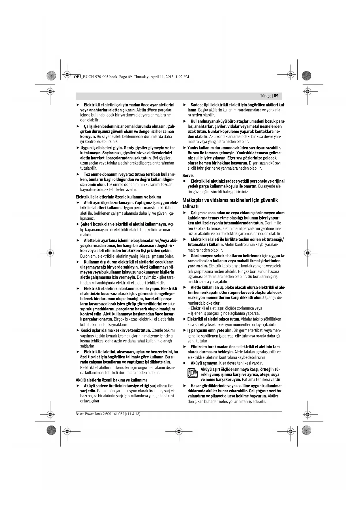 Τα ηλεκτρικά εργαλεία, οι μπαταρίες, τα εξαρτήματα και οι συσκευασίες πρέπει να ανακυκλώνονται με τρόπο φιλικό προς το περιβάλλον. Μην ρίχνετε τα ηλεκτρικά εργαλεία και τις μπαταρίες στα απορ- ρίμματα του σπιτιού σας! Μόνο για χώρες της ΕΕ: Σύμφωνα με την Κοινοτική Οδηγία 2012/19/EE τα άχρηστα ηλεκτρικά εργα- λεία και σύμφωνα με την Κοινοτική Οδηγία 2006/66/EΚ οι χαλασμένες ή αναλωμένες μπαταρίες δεν είναι πλέον υποχρεωτικό να συλλέγονται ξεχωριστά για να ανακυκλωθούν με τρόπο φιλικό προς το περιβάλλον. Μπαταρίες/Επαναφορτιζόμενες μπαταρίες: Li-Ion: Παρακαλούμε να δώσετε προσοχή στις υποδείξεις στο κεφάλαιο «Μεταφορά», σελίδα 68. Τηρούμε το δικαίωμα αλλαγών. Türkçe Güvenlik Talimatı Elektrikli El Aletleri İçin Genel Uyarı Talimatı Bütün uyarıları ve talimat hükümlerini oku- yun. Açıklanan uyarılara ve talimat hükümlerine uyulmadığı takdirde elektrik çarpmalarına, yangınlara ve/veya ağır yaralanmalara neden olunabilir. Bütün uyarıları ve talimat hükümlerini ileride kullanmak üzere saklayın. Uyarı ve talimat hükümlerinde kullanılan “Elektrikli El Aleti” kavramı, akım şebekesine bağlı (şebeke bağlantı kablosu ile) aletlerle akü ile çalışan aletleri (akım şebekesine bağlantısı ol- mayan aletler) kapsamaktadır. Çalışma yeri güvenliği Çalıştığınız yeri temiz tutun ve iyi aydınlatın. Çalıştığınız yer düzensiz ise ve iyi aydınlatılmamışsa kazalar ortaya çı- kabilir. Yakınında patlayıcı maddeler, yanıcı sıvı, gaz veya toz- ların bulunduğu yerlerde elektrikli el aleti ile çalışma- yın. Elektrikli el aletleri, toz veya buharların tutuşmasına neden olabilecek kıvılcımlar çıkarırlar. Elektrikli el aleti ile çalışırken çocukları ve başkalarını uzakta tutun. Dikkatiniz dağılacak olursa aletin kontrolünü kaybedebilirsiniz. Elektrik Güvenliği Elektrikli el aletinin bağlantı fişi prize uymalıdır. Fişi hiçbir zaman değiştirmeyin. Koruyucu topraklanmış elektrikli el aletleri ile birlikte adaptör fiş kullanmayın. Değiştirilmemiş fiş ve uygun priz elektrik çarpma tehlikesi- ni azaltır. Borular, kalorifer petekleri, ısıtıcılar ve buzdolapları gi- bi topraklanmış yüzeylerle bedensel temasa gelmek- ten kaçının. Bedeniniz topraklandığı anda büyük bir elek- trik çarpma tehlikesi ortaya çıkar. Aleti yağmur altında veya nemli ortamlarda bırakma- yın. Suyun elektrikli el aleti içine sızması elektrik çarpma tehlikesini artırır. Elektrikli el aletini kablosundan tutarak taşımayın, kabloyu kullanarak asmayın veya kablodan çekerek fişi çıkarmayın. Kabloyu ısıdan, yağdan, keskin kenarlı ci- simlerden veya aletin hareketli parçalarından uzak tu- tun. Hasarlı veya dolaşmış kablo elektrik çarpma tehlikesi- ni artırır. Bir elektrikli el aleti ile açık havada çalışırken, mutlaka açık havada kullanılmaya uygun uzatma kablosu kulla- nın. Açık havada kullanılmaya uygun uzatma kablosunun kullanılması elektrik çarpma tehlikesini azaltır. Elektrikli el aletinin nemli ortamlarda çalıştırılması şartsa, mutlaka arıza akımı koruma şalteri kullanın. Arı- za akımı koruma şalterinin kullanımı elektrik çarpma tehli- kesini azaltır. Kişilerin Güvenliği Dikkatli olun, ne yaptığınıza dikkat edin, elektrikli el aleti ile işinizi makul bir tempo ve yöntemle yürütün. Yorgunsanız, aldığınız hapların, ilaçların veya alkolün etkisinde iseniz elektrikli el aletini kullanmayın. Aleti kullanırken bir anki dikkatsizlik önemli yaralanmalara ne- den olabilir. Daima kişisel koruyucu donanım ve bir koruyucu göz- lük kullanın. Elektrikli el aletinin türü ve kullanımına uygun olarak; toz maskesi, kaymayan iş ayakkabıları, koruyucu kask veya koruyucu kulaklık gibi koruyucu donanım kullanı- mı yaralanma tehlikesini azalttır. Aleti yanlışlıkla çalıştırmaktan kaçının. Akım ikmal şe- bekesine ve/veya aküye bağlamadan, elinize alıp taşı- madan önce elektrikli el aletinin kapalı olduğundan emin olun. Elektrikli el aletini parmağınız şalter üzerinde dururken taşırsanız ve alet açıkken fişi prize sokarsanız ka- zalara neden olabilirsiniz. UYARI OBJ_BUCH-970-005.book Page 68 Thursday, April 11, 2013 1:02 PMTürkçe | 69 Bosch Power Tools 2 609 141 052 | (11.4.13) Elektrikli el aletini çalıştırmadan önce ayar aletlerini veya anahtarları aletten çıkarın. Aletin dönen parçaları içinde bulunabilecek bir yardımcı alet yaralanmalara ne- den olabilir. Çalışırken bedeniniz anormal durumda olmasın. Çalı- şırken duruşunuz güvenli olsun ve dengenizi her zaman koruyun. Bu sayede aleti beklenmedik durumlarda daha iyi kontrol edebilirsiniz. Uygun iş elbiseleri giyin. Geniş giysiler giymeyin ve ta- kı takmayın. Saçlarınızı, giysileriniz ve eldivenlerinizi aletin hareketli parçalarından uzak tutun. Bol giysiler, uzun saçlar veya takılar aletin hareketli parçaları tarafından tutulabilir. Toz emme donanımı veya toz tutma tertibatı kullanır- ken, bunların bağlı olduğundan ve doğru kullanıldığın- dan emin olun. Toz emme donanımının kullanımı tozdan kaynalanabilecek tehlikeleri azaltır. Elektrikli el aletlerinin özenle kullanımı ve bakımı Aleti aşırı ölçede zorlamayın. Yaptığınız işe uygun elek- trikli el aletleri kullanın. Uygun performanslı elektrikli el aleti ile, belirlenen çalışma a