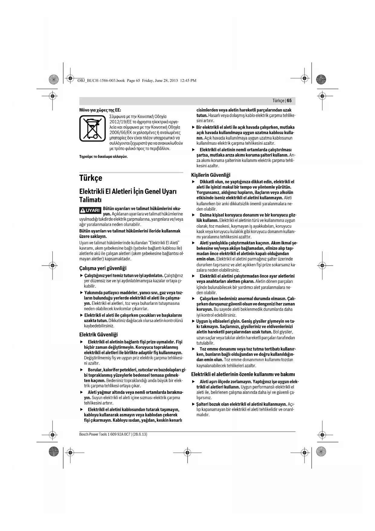 Επιλογή εξαρτημάτων/ παρελκομένων – 159 Στόχος ενέργειας Εικόνα Δώστε προσοχή Σελίδα OBJ_BUCH-1586-003.book Page 64 Friday, June 28, 2013 12:45 PMTürkçe | 65 Bosch Power Tools 1 609 92A 0C7 | (28.6.13) Μόνο για χώρες της ΕΕ: Σύμφωνα με την Κοινοτική Οδηγία 2012/19/EE τα άχρηστα ηλεκτρικά εργα- λεία και σύμφωνα με την Κοινοτική Οδηγία 2006/66/EΚ οι χαλασμένες ή αναλωμένες μπαταρίες δεν είναι πλέον υποχρεωτικό να συλλέγονται ξεχωριστά για να ανακυκλωθούν με τρόπο φιλικό προς το περιβάλλον. Τηρούμε το δικαίωμα αλλαγών. Türkçe Elektrikli El Aletleri İçin Genel Uyarı Talimatı Bütün uyarıları ve talimat hükümlerini oku- yun. Açıklanan uyarılara ve talimat hükümlerine uyulmadığı takdirde elektrik çarpmalarına, yangınlara ve/veya ağır yaralanmalara neden olunabilir. Bütün uyarıları ve talimat hükümlerini ileride kullanmak üzere saklayın. Uyarı ve talimat hükümlerinde kullanılan “Elektrikli El Aleti” kavramı, akım şebekesine bağlı (şebeke bağlantı kablosu ile) aletlerle akü ile çalışan aletleri (akım şebekesine bağlantısı ol- mayan aletler) kapsamaktadır. Çalışma yeri güvenliği Çalıştığınız yeri temiz tutun ve iyi aydınlatın. Çalıştığınız yer düzensiz ise ve iyi aydınlatılmamışsa kazalar ortaya çı- kabilir. Yakınında patlayıcı maddeler, yanıcı sıvı, gaz veya toz- ların bulunduğu yerlerde elektrikli el aleti ile çalışma- yın. Elektrikli el aletleri, toz veya buharların tutuşmasına neden olabilecek kıvılcımlar çıkarırlar. Elektrikli el aleti ile çalışırken çocukları ve başkalarını uzakta tutun. Dikkatiniz dağılacak olursa aletin kontrolünü kaybedebilirsiniz. Elektrik Güvenliği Elektrikli el aletinin bağlantı fişi prize uymalıdır. Fişi hiçbir zaman değiştirmeyin. Koruyucu topraklanmış elektrikli el aletleri ile birlikte adaptör fiş kullanmayın. Değiştirilmemiş fiş ve uygun priz elektrik çarpma tehlikesi- ni azaltır. Borular, kalorifer petekleri, ısıtıcılar ve buzdolapları gi- bi topraklanmış yüzeylerle bedensel temasa gelmek- ten kaçının. Bedeniniz topraklandığı anda büyük bir elek- trik çarpma tehlikesi ortaya çıkar. Aleti yağmur altında veya nemli ortamlarda bırakma- yın. Suyun elektrikli el aleti içine sızması elektrik çarpma tehlikesini artırır. Elektrikli el aletini kablosundan tutarak taşımayın, kabloyu kullanarak asmayın veya kablodan çekerek fişi çıkarmayın. Kabloyu ısıdan, yağdan, keskin kenarlı cisimlerden veya aletin hareketli parçalarından uzak tutun. Hasarlı veya dolaşmış kablo elektrik çarpma tehlike- sini artırır. Bir elektrikli el aleti ile açık havada çalışırken, mutlaka açık havada kullanılmaya uygun uzatma kablosu kulla- nın. Açık havada kullanılmaya uygun uzatma kablosunun kullanılması elektrik çarpma tehlikesini azaltır. Elektrikli el aletinin nemli ortamlarda çalıştırılması şartsa, mutlaka arıza akımı koruma şalteri kullanın. Arı- za akımı koruma şalterinin kullanımı elektrik çarpma tehli- kesini azaltır. Kişilerin Güvenliği Dikkatli olun, ne yaptığınıza dikkat edin, elektrikli el aleti ile işinizi makul bir tempo ve yöntemle yürütün. Yorgunsanız, aldığınız hapların, ilaçların veya alkolün etkisinde iseniz elektrikli el aletini kullanmayın. Aleti kullanırken bir anki dikkatsizlik önemli yaralanmalara ne- den olabilir. Daima kişisel koruyucu donanım ve bir koruyucu göz- lük kullanın. Elektrikli el aletinin türü ve kullanımına uygun olarak; toz maskesi, kaymayan iş ayakkabıları, koruyucu kask veya koruyucu kulaklık gibi koruyucu donanım kullanı- mı yaralanma tehlikesini azalttır. Aleti yanlışlıkla çalıştırmaktan kaçının. Akım ikmal şe- bekesine ve/veya aküye bağlamadan, elinize alıp taşı- madan önce elektrikli el aletinin kapalı olduğundan emin olun. Elektrikli el aletini parmağınız şalter üzerinde dururken taşırsanız ve alet açıkken fişi prize sokarsanız ka- zalara neden olabilirsiniz. Elektrikli el aletini çalıştırmadan önce ayar aletlerini veya anahtarları aletten çıkarın. Aletin dönen parçaları içinde bulunabilecek bir yardımcı alet yaralanmalara ne- den olabilir. Çalışırken bedeniniz anormal durumda olmasın. Çalı- şırken duruşunuz güvenli olsun ve dengenizi her zaman koruyun. Bu sayede aleti beklenmedik durumlarda daha iyi kontrol edebilirsiniz. Uygun iş elbiseleri giyin. Geniş giysiler giymeyin ve ta- kı takmayın. Saçlarınızı, giysileriniz ve eldivenlerinizi aletin hareketli parçalarından uzak tutun. Bol giysiler, uzun saçlar veya takılar aletin hareketli parçaları tarafından tutulabilir. Toz emme donanımı veya toz tutma tertibatı kullanır- ken, bunların bağlı olduğundan ve doğru kullanıldığın- dan emin olun. Toz emme donanımının kullanımı tozdan kaynalanabilecek tehlikeleri azaltır. Elektrikli el aletlerinin özenle kullanımı ve bakımı Aleti aşırı ölçede zorlamayın. Yaptığınız işe uygun elek- trikli el aletleri kullanın. Uygun performanslı elektrikli el aleti ile, belirlenen çalışma alanında daha iyi ve güvenli ça- lışırsınız. Şalteri bozuk olan elektrikli el aletini kullanmayın. Açı- lıp kapanamayan bir elektrikli el aleti tehlikelidir ve onarıl- malıdır. UYARI OBJ_BUCH-1586-003.book Page 65 Friday, June 28, 2013 12:45 PM66 | Türkçe 1 609 92A 0C7 | (28.6.13) Bosch Power Tools Alette bir ayarlama işlemine başlamadan ve/veya akü- yü çıkarmadan önce, herhangi bir aksesuarı değiştirir- ken veya aleti elinizden bırakırken fişi prizden çekin. Bu önlem