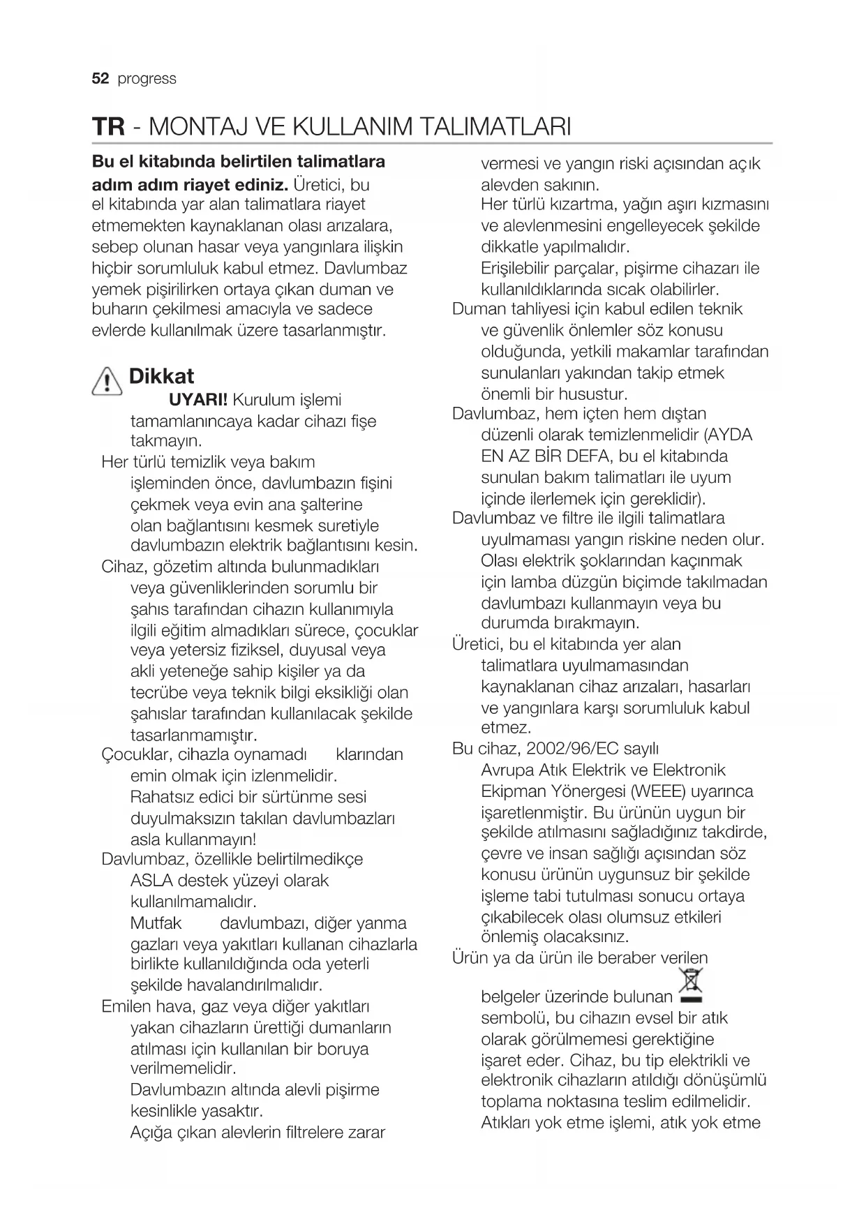 Bu el kitabında belirtilen talimatlara adım adım riayet ediniz. Üretici, bu el kitabında yar alan talimatlara riayet etmemekten kaynaklanan olası arızalara, sebep olunan hasar veya yangınlara ilişkin hiçbir sorumluluk kabul etmez. Davlumbaz yemek pişirilirken ortaya çıkan duman ve buharın çekilmesi amacıyla ve sadece evlerde kullanılmak üzere tasarlanmıştır. Dikkat UYARI! Kurulum işlemi tamamlanıncaya kadar cihazı fişe takmayın. Her türlü temizlik veya bakım işleminden önce, davlumbazın fişini çekmek veya evin ana şalterine olan bağlantısını kesmek suretiyle davlumbazın elektrik bağlantısını kesin. Cihaz, gözetim altında bulunmadıkları veya güvenliklerinden sorumlu bir şahıs tarafından cihazın kullanımıyla ilgili eğitim almadıkları sürece, çocuklar veya yetersiz fiziksel, duyusal veya akli yeteneğe sahip kişiler ya da tecrübe veya teknik bilgi eksikliği olan şahıslar tarafından kullanılacak şekilde tasarlanmamıştır. Çocuklar, cihazla oynamadı klarından emin olmak için izlenmelidir. Rahatsız edici bir sürtünme sesi duyulmaksızın takılan davlumbazları asla kullanmayın! Davlumbaz, özellikle belirtilmedikçe ASLA destek yüzeyi olarak kullanılmamalıdır. Mutfak davlumbazı, diğer yanma gazları veya yakıtları kullanan cihazlarla birlikte kullanıldığında oda yeterli şekilde havalandırılmalıdır. Emilen hava, gaz veya diğer yakıtları yakan cihazların ürettiği dumanların atılması için kullanılan bir boruya verilmemelidir. Davlumbazın altında alevli pişirme kesinlikle yasaktır. Açığa çıkan alevlerin filtrelere zarar vermesi ve yangın riski açısından aç
