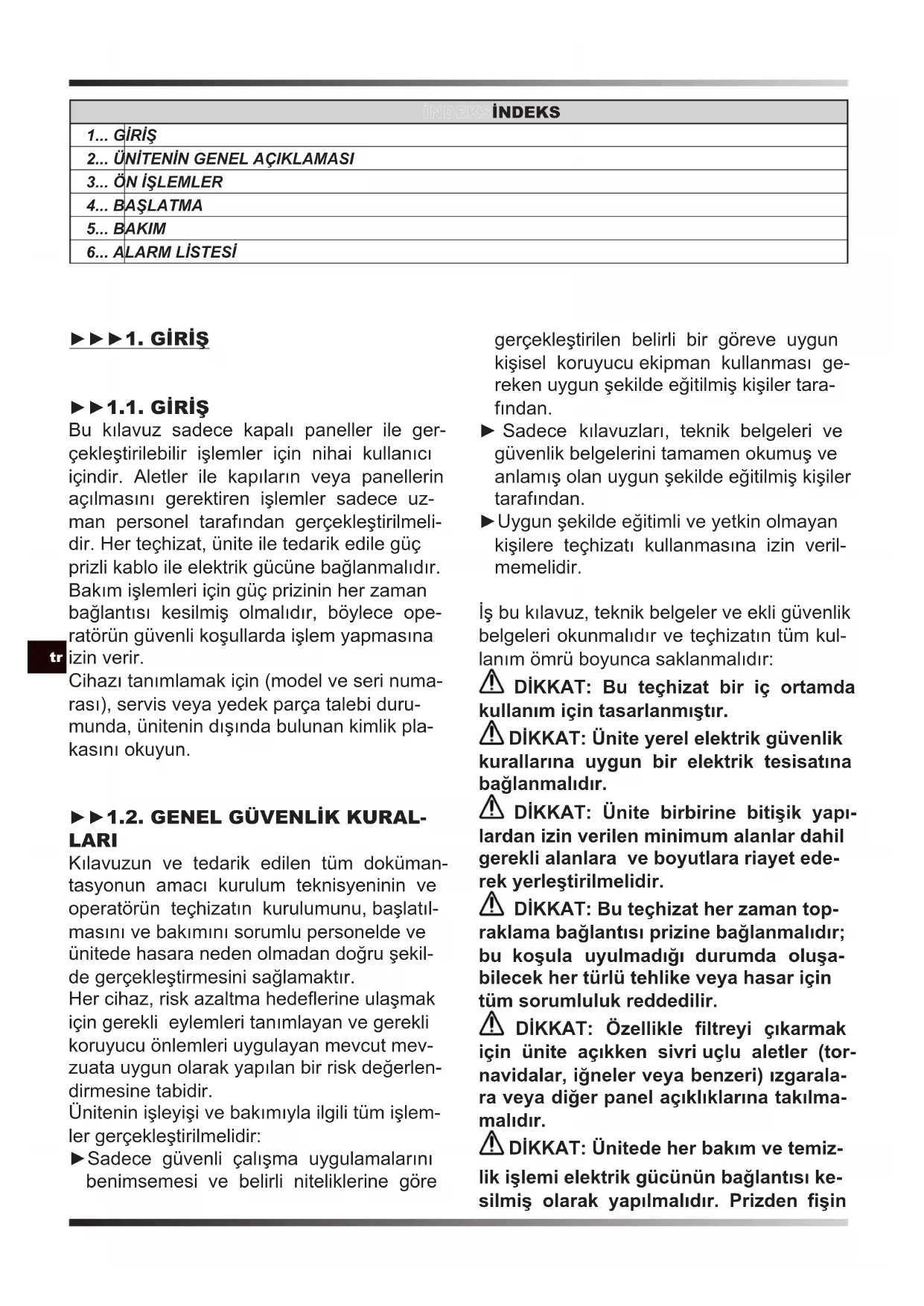 ►►►1. GİRİŞ ►►1.1. GİRİŞ Bu kılavuz sadece kapalı paneller ile ger- çekleştirilebilir işlemler için nihai kullanıcı içindir. Aletler ile kapıların veya panellerin açılmasını gerektiren işlemler sadece uz- man personel tarafından gerçekleştirilmeli- dir. Her teçhizat, ünite ile tedarik edile güç prizli kablo ile elektrik gücüne bağlanmalıdır. Bakım işlemleri için güç prizinin her zaman bağlantısı kesilmiş olmalıdır, böylece ope- ratörün güvenli koşullarda işlem yapmasına izin verir. Cihazı tanımlamak için (model ve seri numa- rası), servis veya yedek parça talebi duru- munda, ünitenin dışında bulunan kimlik pla- kasını okuyun.