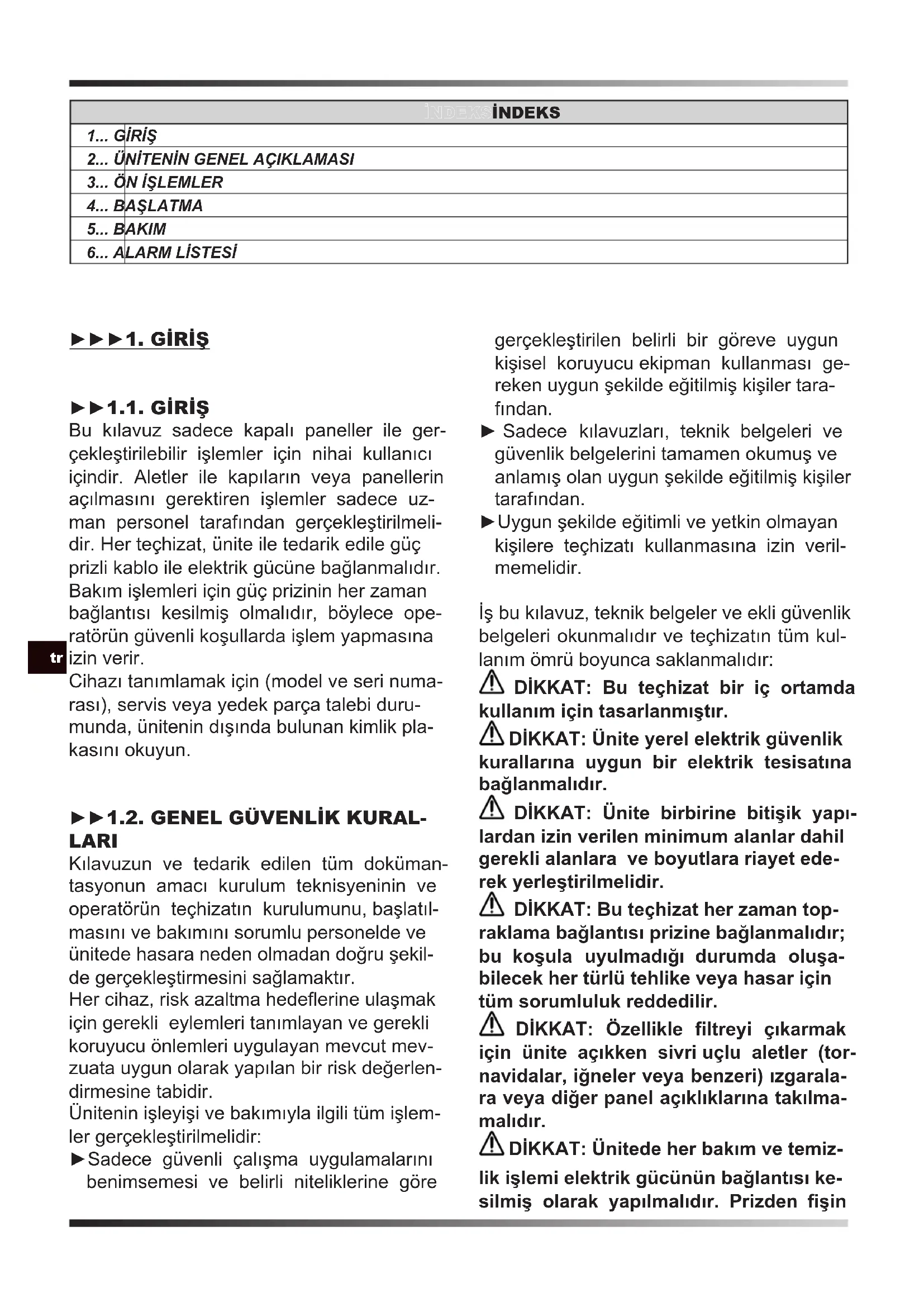 LARI Kılavuzun ve tedarik edilen tüm doküman- tasyonun amacı kurulum teknisyeninin ve operatörün teçhizatın kurulumunu, başlatıl- masını ve bakımını sorumlu personelde ve ünitede hasara neden olmadan doğru şekil- de gerçekleştirmesini sağlamaktır. Her cihaz, risk azaltma hedeerine ulaşmak için gerekli eylemleri tanımlayan ve gerekli koruyucu önlemleri uygulayan mevcut mev- zuata uygun olarak yapılan bir risk değerlen- dirmesine tabidir. Ünitenin işleyişi ve bakımıyla ilgili tüm işlem- ler gerçekleştirilmelidir: ►Sadece güvenli çalışma uygulamalarını benimsemesi ve belirli niteliklerine göre gerçekleştirilen belirli bir göreve uygun kişisel koruyucu ekipman kullanması ge- reken uygun şekilde eğitilmiş kişiler tara- fından. ► Sadece kılavuzları, teknik belgeleri ve güvenlik belgelerini tamamen okumuş ve anlamış olan uygun şekilde eğitilmiş kişiler tarafından. ►Uygun şekilde eğitimli ve yetkin olmayan kişilere teçhizatı kullanmasına izin veril- memelidir. İş bu kılavuz, teknik belgeler ve ekli güvenlik belgeleri okunmalıdır ve teçhizatın tüm kul- lanım ömrü boyunca saklanmalıdır: DİKKAT: Bu teçhizat bir iç ortamda kullanım için tasarlanmıştır. DİKKAT: Ünite yerel elektrik güvenlik kurallarına uygun bir elektrik tesisatına bağlanmalıdır. DİKKAT: Ünite birbirine bitişik yapı- lardan izin verilen minimum alanlar dahil gerekli alanlara ve boyutlara riayet ede- rek yerleştirilmelidir. DİKKAT: Bu teçhizat her zaman top- raklama bağlantısı prizine bağlanmalıdır; bu koşula uyulmadığı durumda oluşa- bilecek her türlü tehlike veya hasar için tüm sorumluluk reddedilir. DİKKAT: Özellikle filtreyi çıkarmak için ünite açıkken sivri uçlu aletler (tor- navidalar, iğneler veya benzeri) ızgarala- ra veya diğer panel açıklıklarına takılma- malıdır. DİKKAT: Ünitede her bakım ve temiz- lik işlemi elektrik gücünün bağlantısı ke- silmiş olarak yapılmalıdır. Prizden fişinen