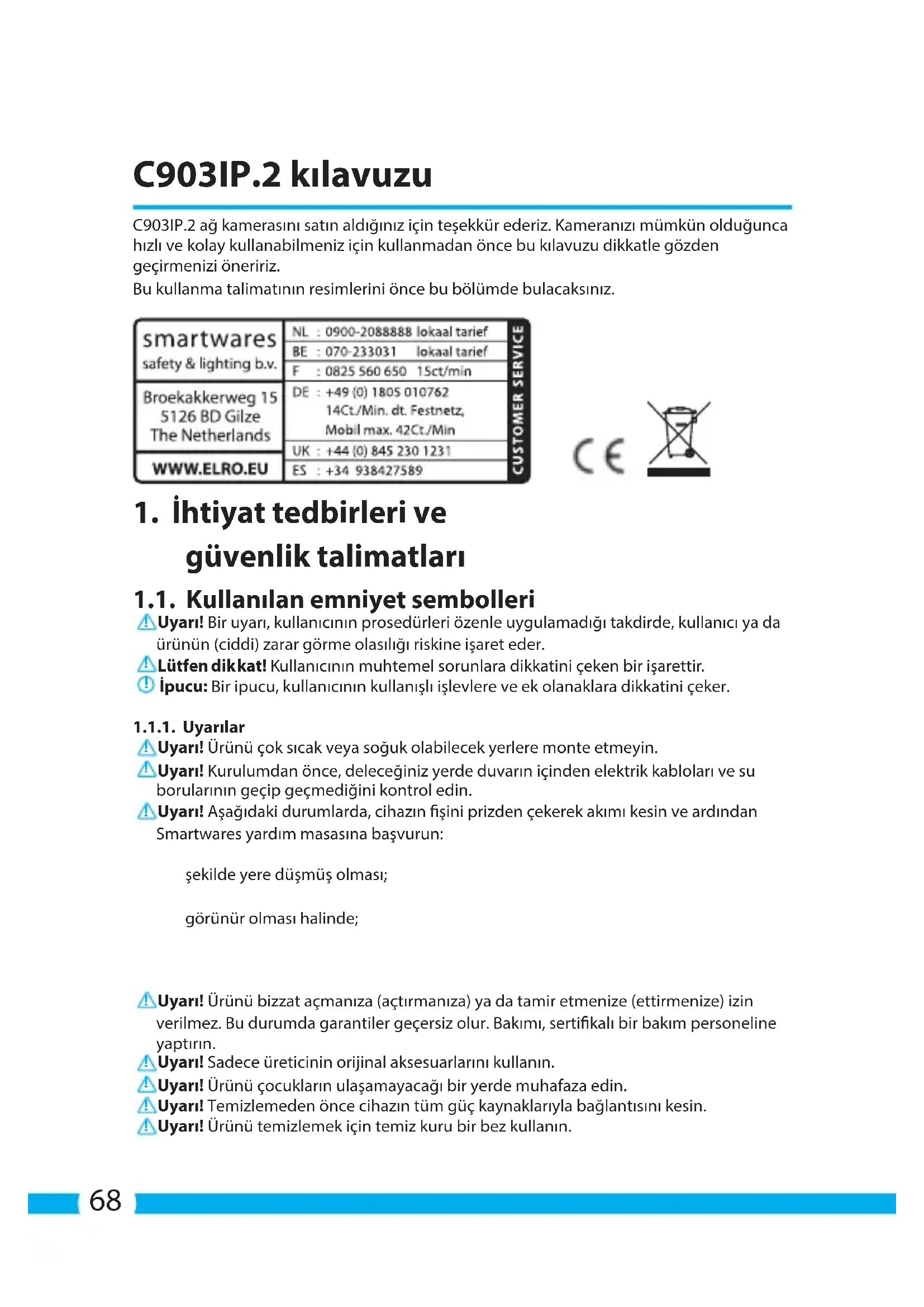 Este dispositivo tiene una garantía limitada de 3 año. Consulte las condiciones de la garantía en: www.elro.eu.68 C903IP.2 kılavuzu C903IP.2 ağ kamerasını satın aldığınız için teşekkür ederiz. Kameranızı mümkün olduğunca hızlı ve kolay kullanabilmeniz için kullanmadan önce bu kılavuzu dikkatle gözden geçirmenizi öneririz. Bu kullanma talimatının resimlerini önce bu bölümde bulacaksınız.
