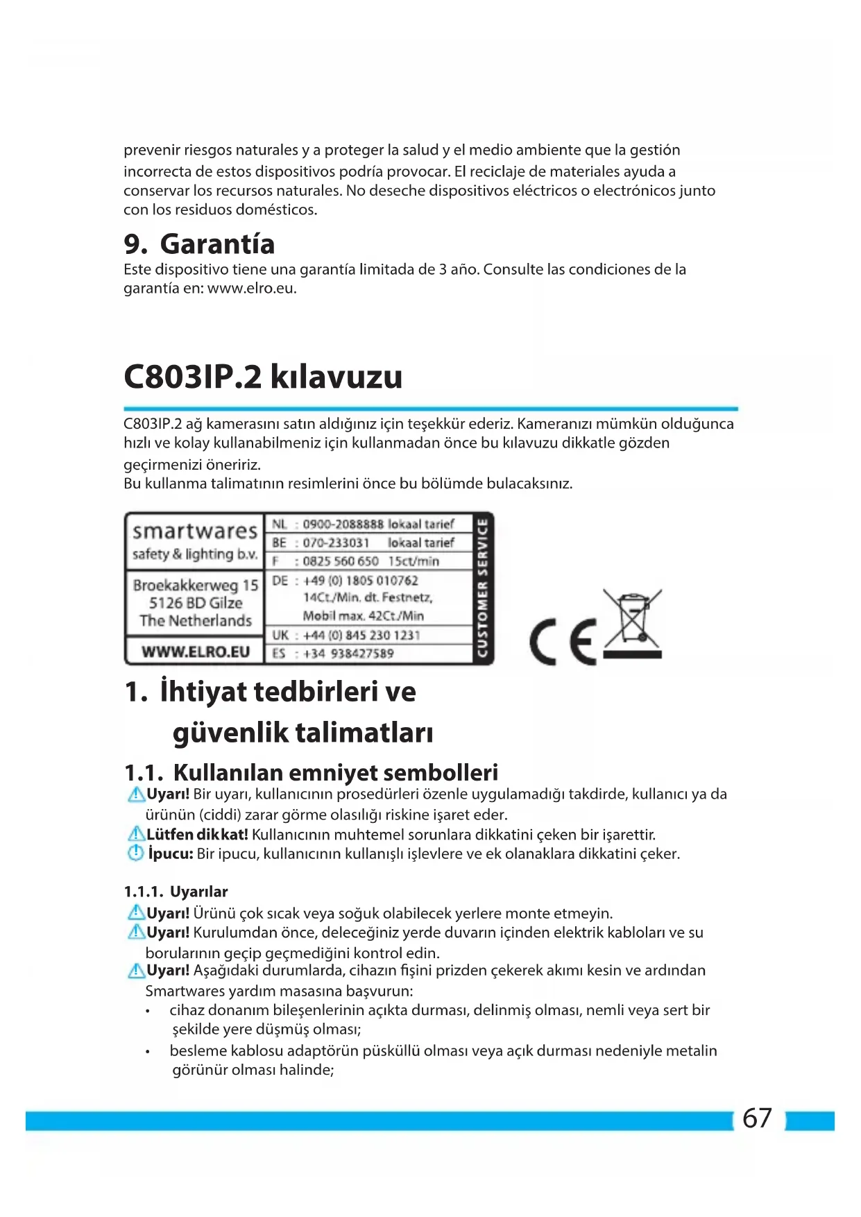 Este dispositivo tiene una garantía limitada de 3 año. Consulte las condiciones de la garantía en: www.elro.eu. C803IP.2 kılavuzu C803IP.2 ağ kamerasını satın aldığınız için teşekkür ederiz. Kameranızı mümkün olduğunca hızlı ve kolay kullanabilmeniz için kullanmadan önce bu kılavuzu dikkatle gözden geçirmenizi öneririz. Bu kullanma talimatının resimlerini önce bu bölümde bulacaksınız.