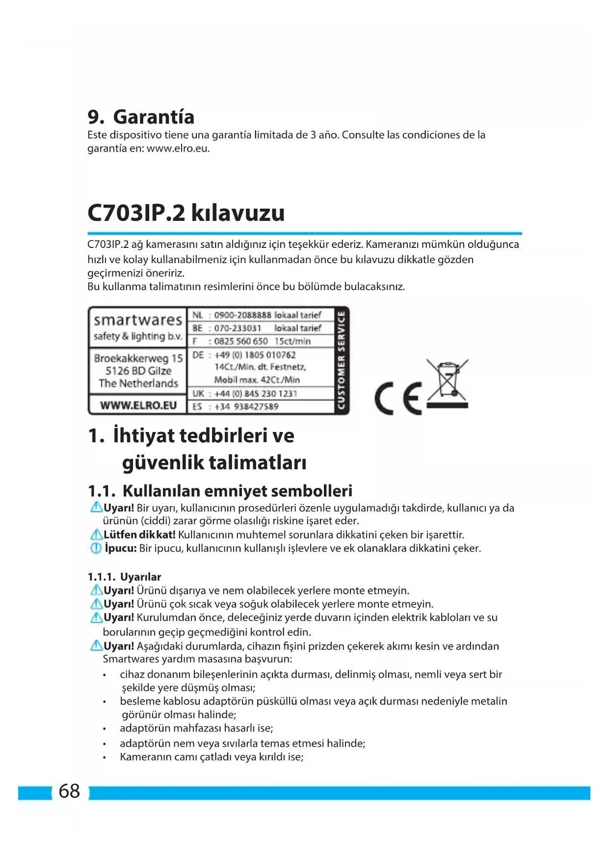 Este dispositivo tiene una garantía limitada de 3 año. Consulte las condiciones de la garantía en: www.elro.eu. C703IP.2 kılavuzu C703IP.2 ağ kamerasını satın aldığınız için teşekkür ederiz. Kameranızı mümkün olduğunca hızlı ve kolay kullanabilmeniz için kullanmadan önce bu kılavuzu dikkatle gözden geçirmenizi öneririz. Bu kullanma talimatının resimlerini önce bu bölümde bulacaksınız.