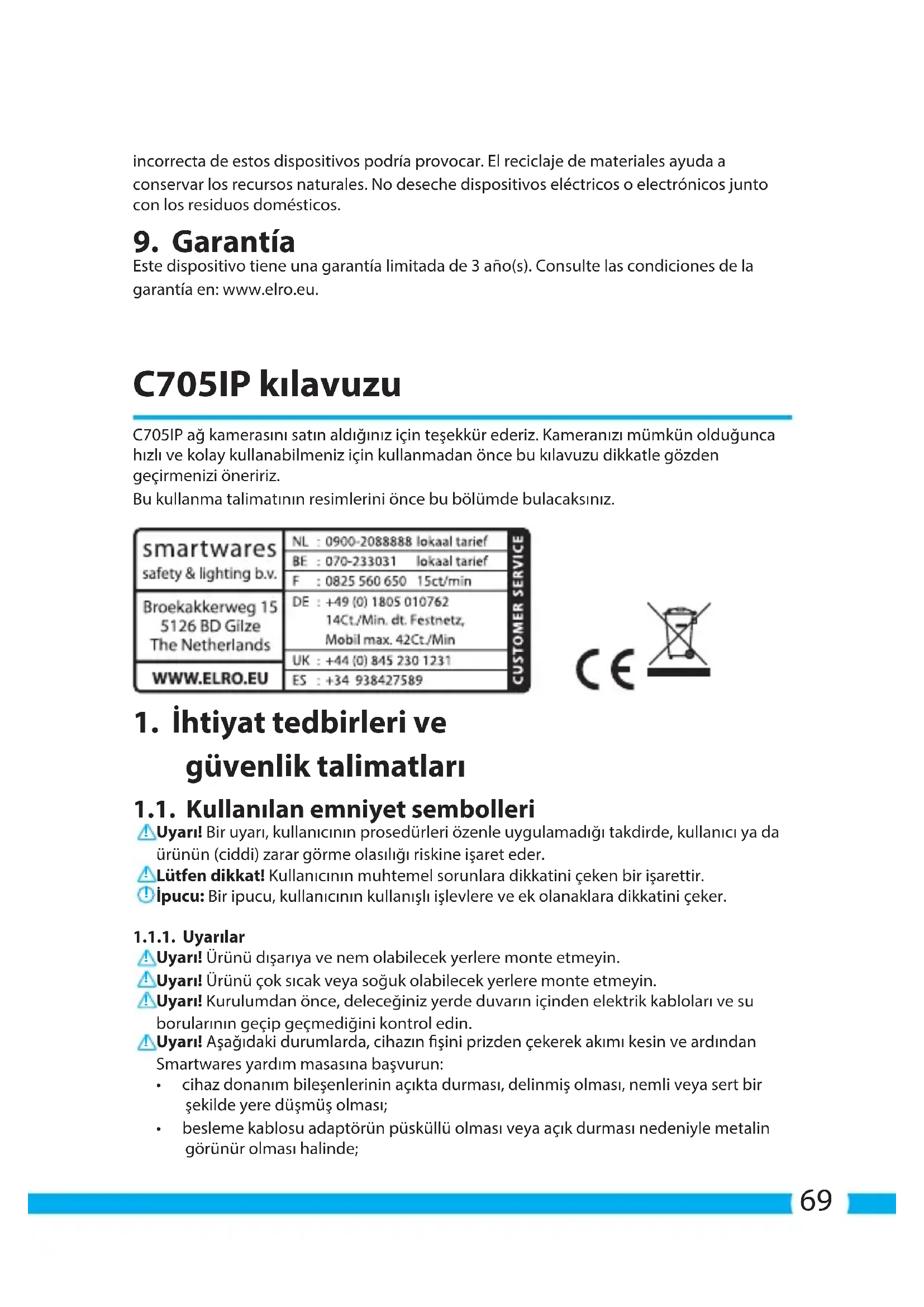 Este dispositivo tiene una garantía limitada de 3 año(s). Consulte las condiciones de la garantía en: www.elro.eu. C705IP kılavuzu C705IP ağ kamerasını satın aldığınız için teşekkür ederiz. Kameranızı mümkün olduğunca hızlı ve kolay kullanabilmeniz için kullanmadan önce bu kılavuzu dikkatle gözden geçirmenizi öneririz. Bu kullanma talimatının resimlerini önce bu bölümde bulacaksınız.
