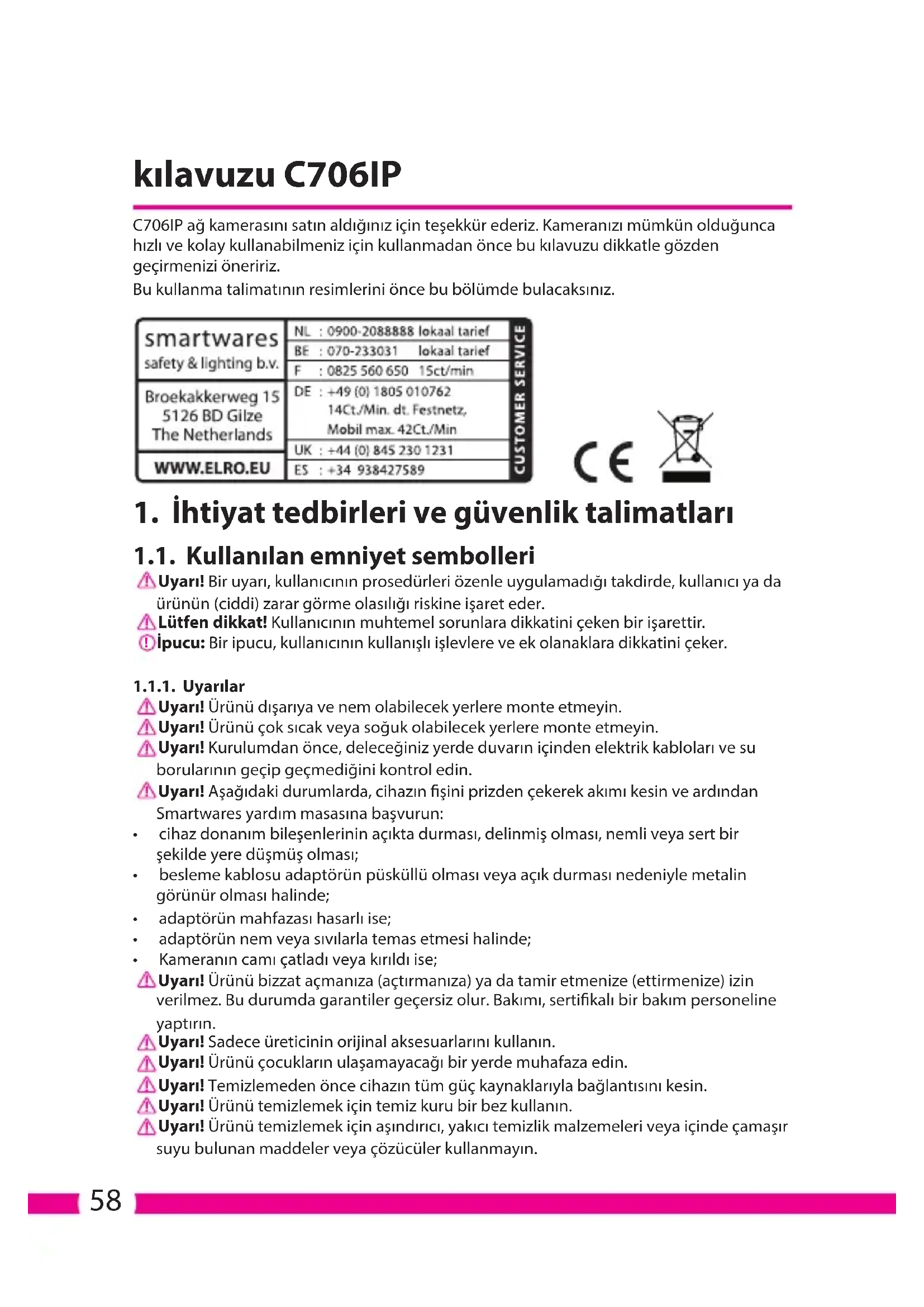 Este dispositivo tiene una garantía limitada de 3 año(s). Consulte las condiciones de la garantía en: www.elro.eu.58 kılavuzu C706IP C706IP ağ kamerasını satın aldığınız için teşekkür ederiz. Kameranızı mümkün olduğunca hızlı ve kolay kullanabilmeniz için kullanmadan önce bu kılavuzu dikkatle gözden geçirmenizi öneririz. Bu kullanma talimatının resimlerini önce bu bölümde bulacaksınız.