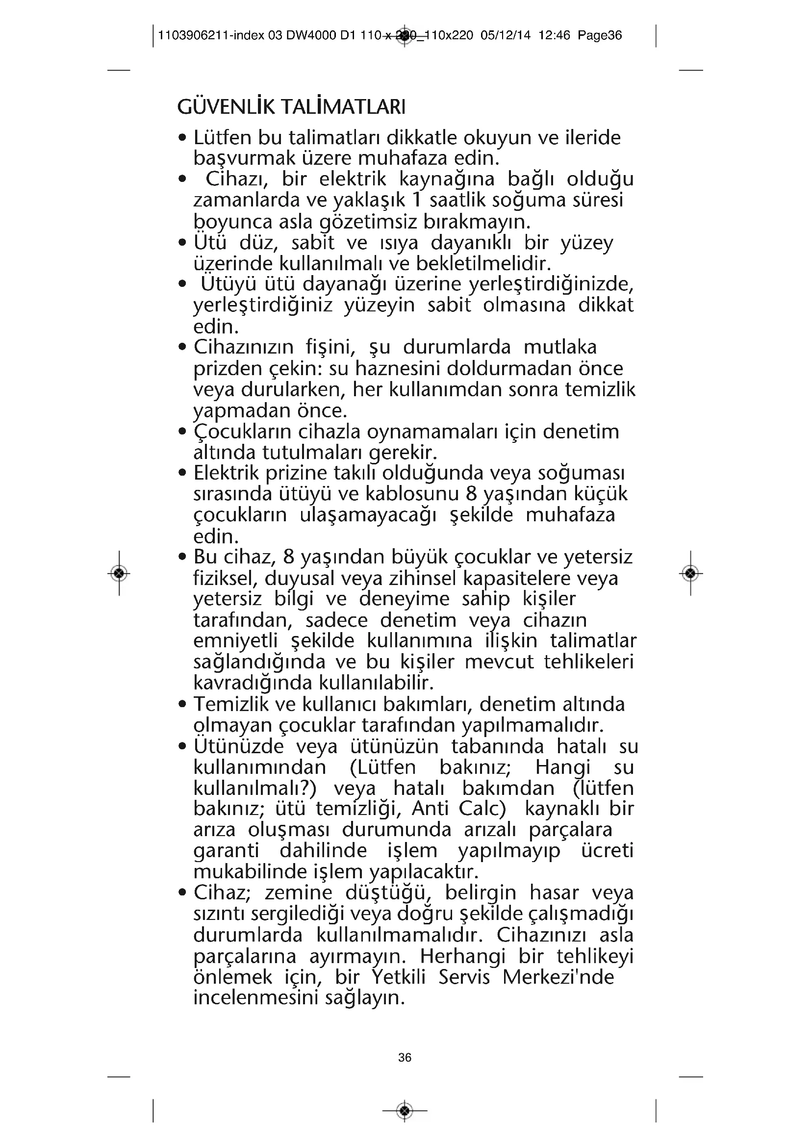- Cihaz; zemine düştüğü, belirgin hasar veya sızıntı sergilediği veya doğru şekilde çalışmadığı durumlarda kullanılmamalıdır. Cihazınızı asla parçalarına ayırmayın. Herhangi bir tehlikeyi önlemek için, bir Yetkili Servis Merkezi'nde incelenmesini sağlayın. 1103906211-index 03 DW4000 D1 110 x 220_110x220 05/12/14 12:46 Page3637