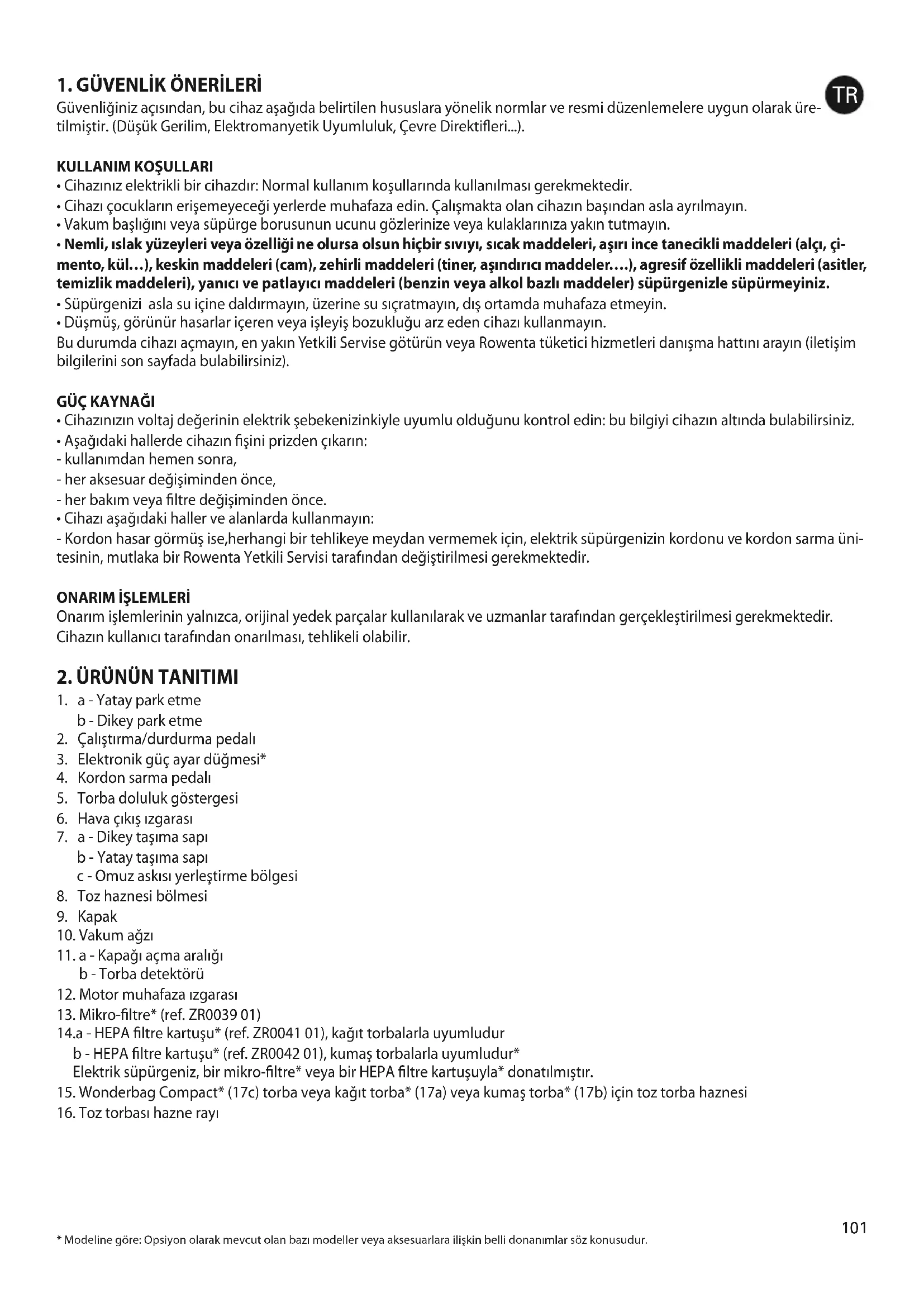 14.a - HEPA filtre kartuşu* (ref. ZR0041 01), kağıt torbalarla uyumludur b - HEPA filtre kartuşu* (ref. ZR0042 01), kumaş torbalarla uyumludur* Elektrik süpürgeniz, bir mikro-filtre* veya bir HEPA filtre kartuşuyla* donatılmıştır.