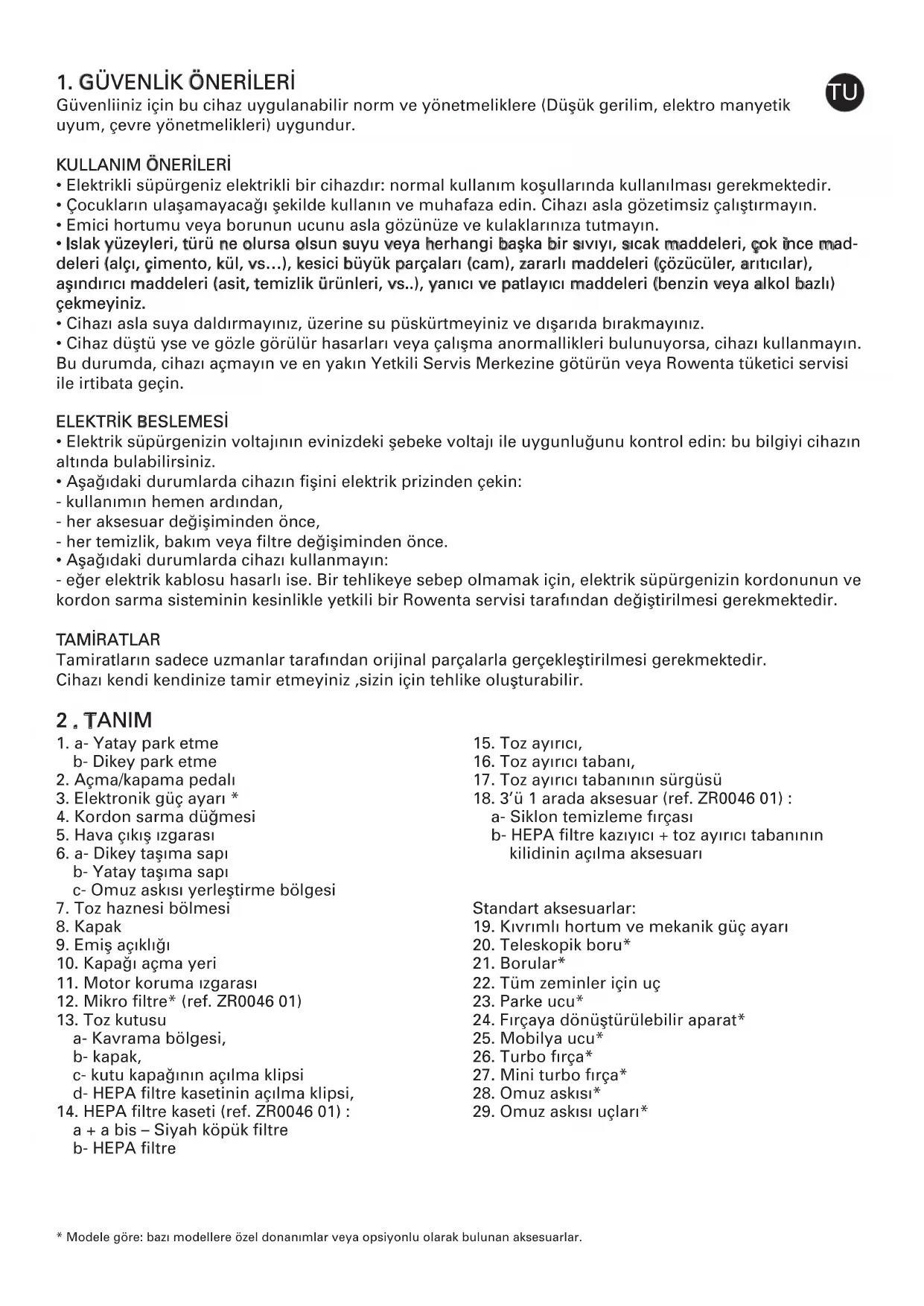 AMİRATLAR Tamiratların sadece uzmanlar tarafından orijinal parçalarla gerçekleştirilmesi gerekmektedir. Cihazı kendi kendinize tamir etmeyiniz ,sizin için tehlike oluşturabilir. 2 . TANIM