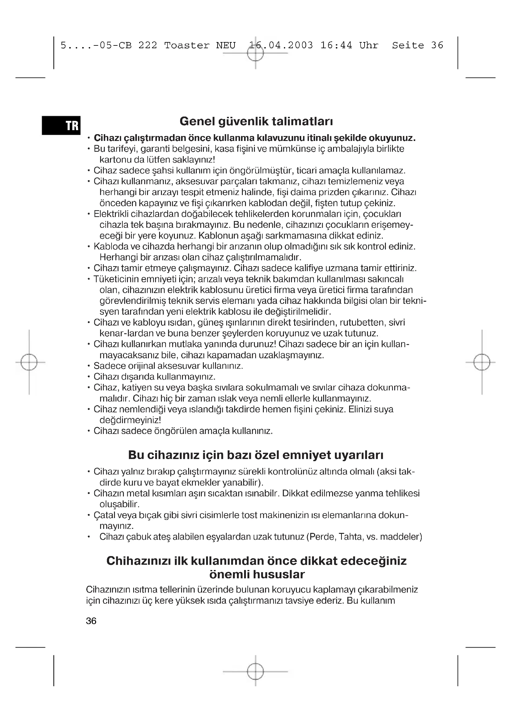 Cihazı çabuk ateş alabilen eşyalardan uzak tutunuz (Perde, Tahta, vs. maddeler) Chihazınızı ilk kullanımdan önce dikkat edeceğiniz önemli hususlar Cihazınızın ısıtma tellerinin üzerinde bulunan koruyucu kaplamayı çıkarabilmeniz için cihazınızı üç kere yüksek ısıda çalıştırmanızı tavsiye ederiz. Bu kullanım 5....-05-CB 222 Toaster NEU 16.04.2003 16:44 Uhr Seite 3637