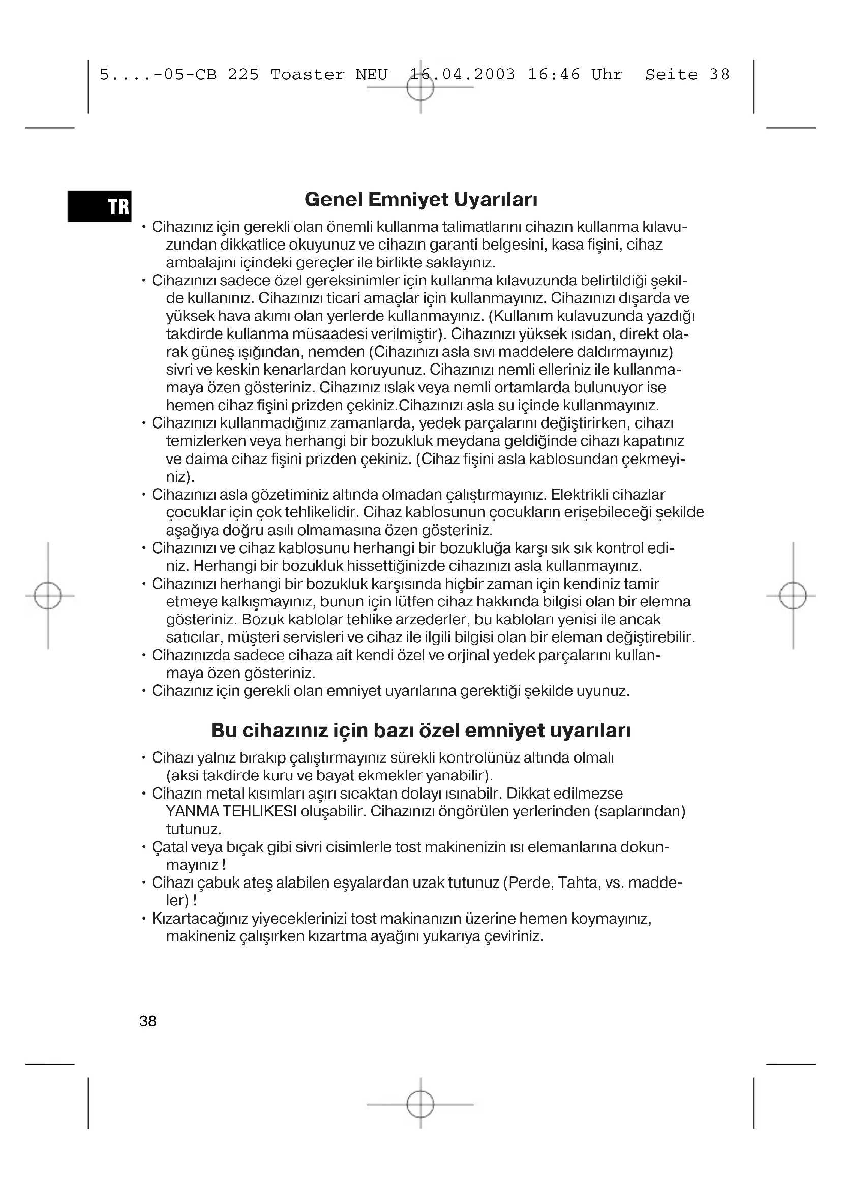 - Kızartacağınız yiyeceklerinizi tost makinanızın üzerine hemen koymayınız, makineniz çalışırken kızartma ayağını yukarıya çeviriniz. 5....-05-CB 225 Toaster NEU 16.04.2003 16:46 Uhr Seite 3839