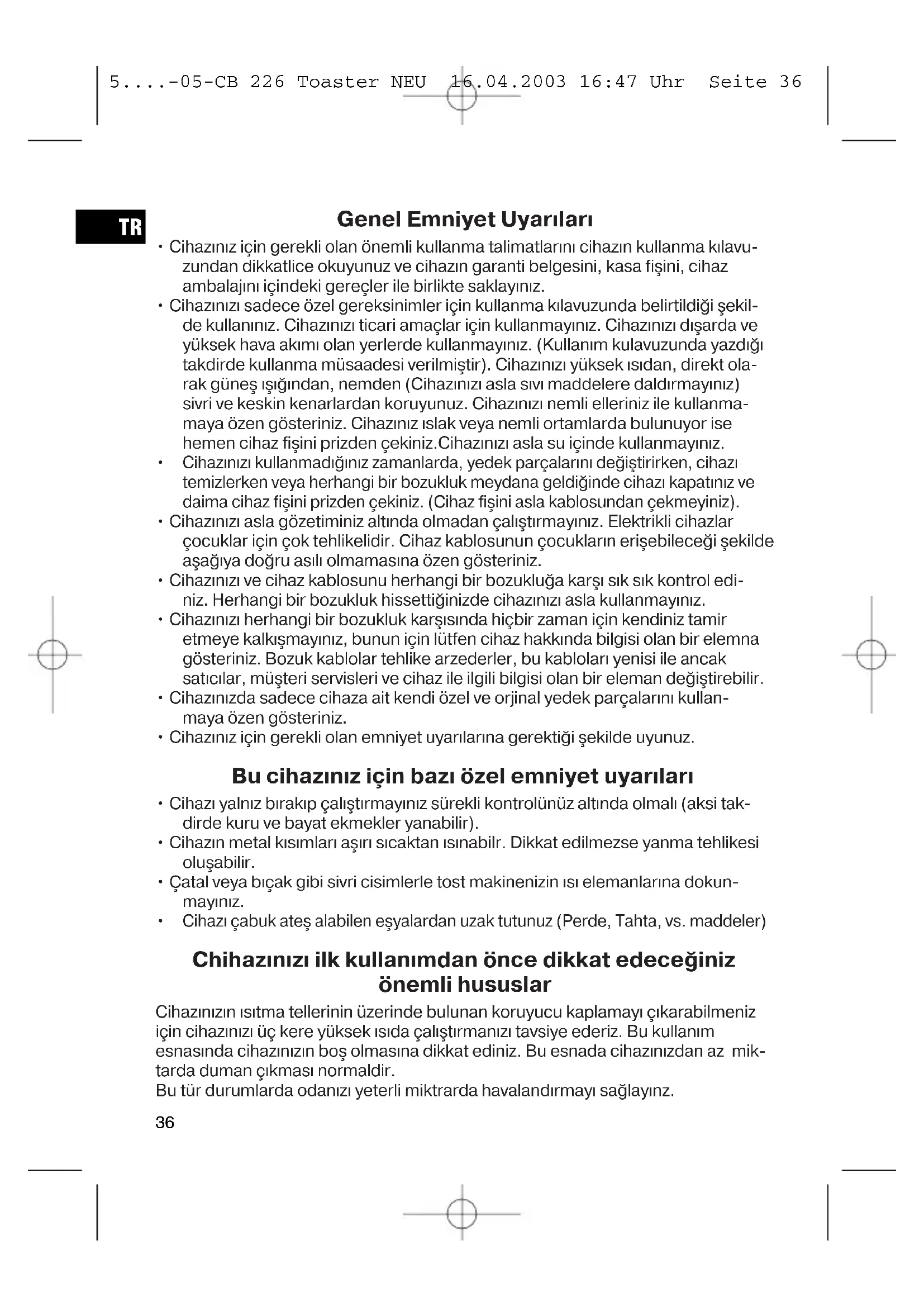 Cihazı çabuk ateş alabilen eşyalardan uzak tutunuz (Perde, Tahta, vs. maddeler) Chihazınızı ilk kullanımdan önce dikkat edeceğiniz önemli hususlar Cihazınızın ısıtma tellerinin üzerinde bulunan koruyucu kaplamayı çıkarabilmeniz için cihazınızı üç kere yüksek ısıda çalıştırmanızı tavsiye ederiz. Bu kullanım esnasında cihazınızın boş olmasına dikkat ediniz. Bu esnada cihazınızdan az mik- tarda duman çıkması normaldir. Bu tür durumlarda odanızı yeterli miktrarda havalandırmayı sağlayınz. 5....-05-CB 226 Toaster NEU 16.04.2003 16:47 Uhr Seite 3637