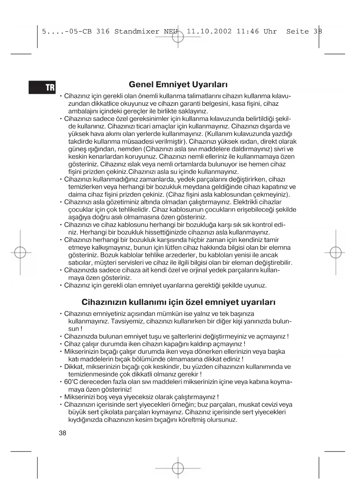 - Cihazınızın içerisinde sert yiyecekleri örneğin; buz parçaları, muskat cevizi veya büyük sert çikolata parçaları kıymayınız. Cihazınız içerisinde sert yiyecekleri kıydığınızda cihazınızın kesim bıçağını köreltmiş olursunuz. 5....-05-CB 316 Standmixer NEU 11.10.2002 11:46 Uhr Seite 3839