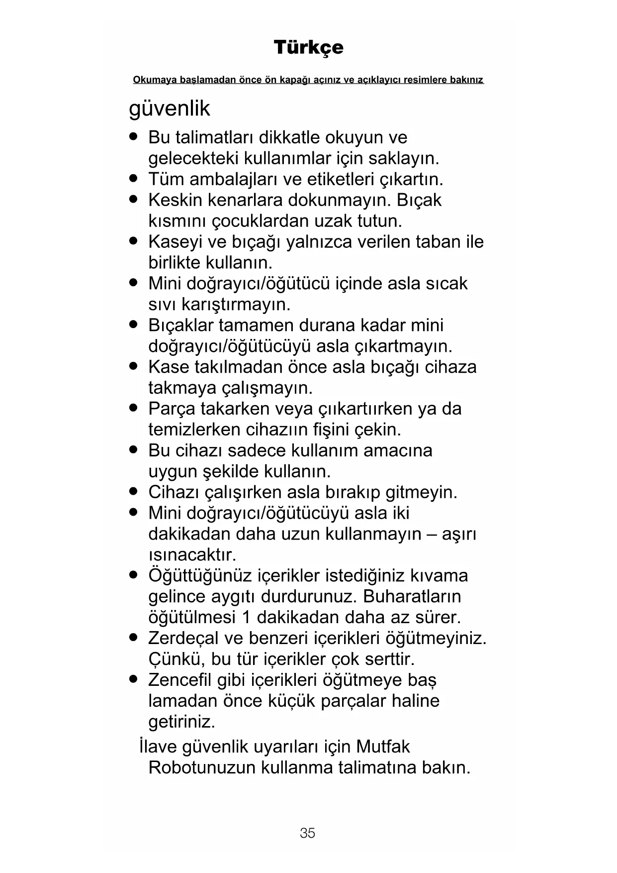 Zencefil gibi içerikleri öòütmeye ba… lamadan önce küçük parçalar haline getiriniz. İlave güvenlik uyarıları için Mutfak Robotunuzun kullanma talimatına bakın. Türkçe Okumaya ba…lamadan önce ön kapaòı açınız ve açıklayıcı resimlere bakınız36 English Mini doğrayıcı/öğütücüyü baharatlar, bitkiler, kuru yemiş, bebek mamaları, salata sosları, pişmiş meyveler, bisküvi, ekmek ve kahve çekirdeği için kullanabilirsiniz.