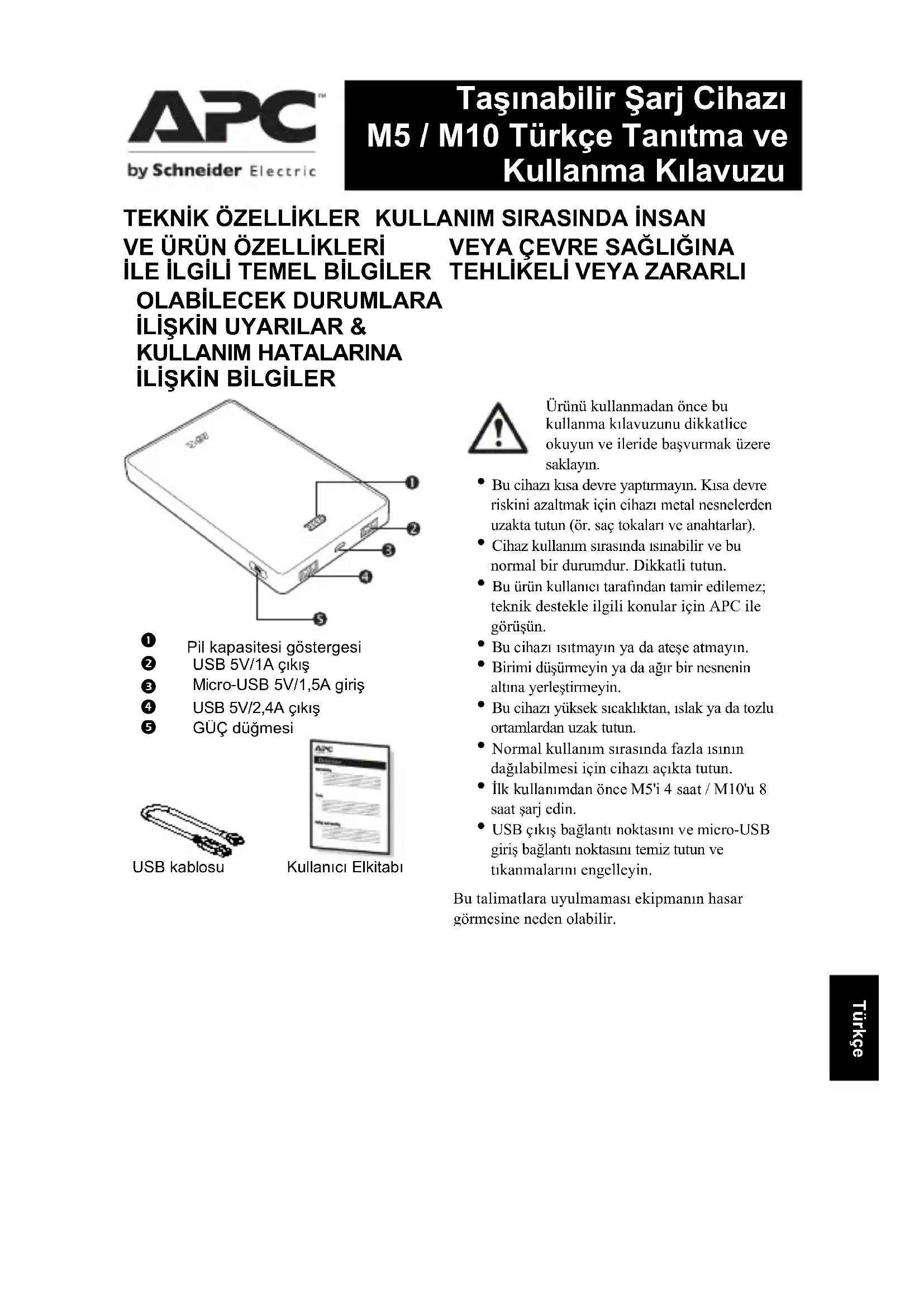 Taşınabilir Şarj Cihazı M5 / M10 Türkçe Tanıtma ve Kullanma Kılavuzu TEKNİK ÖZELLİKLER KULLANIM SIRASINDA İNSAN VE ÜRÜN ÖZELLİKLERİ VEYA ÇEVRE SAĞLIĞINA İLE İLGİLİ TEMEL BİLGİLER TEHLİKELİ VEYA ZARARLI