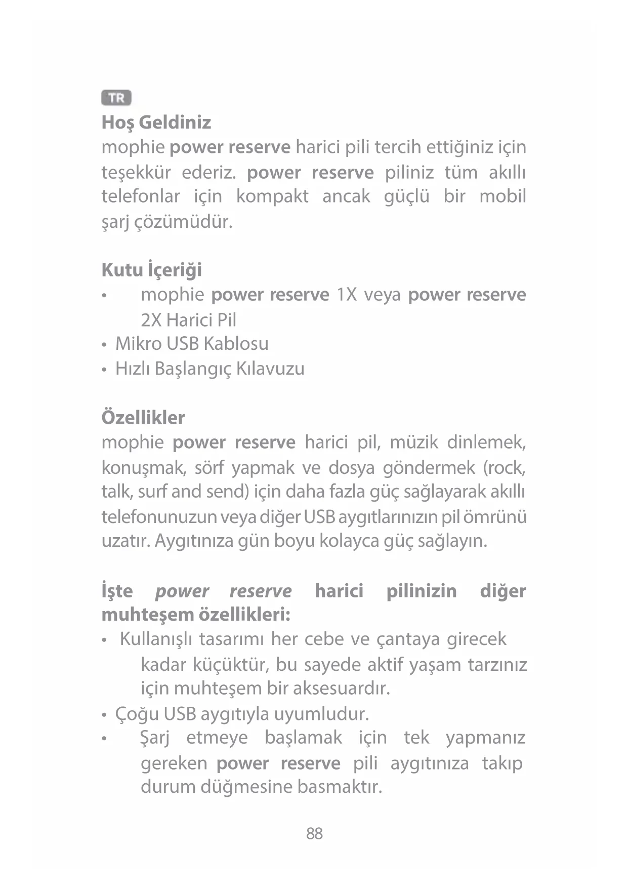 - Hızlı Başlangıç Kılavuzu Özellikler mophie power reserve harici pil, müzik dinlemek, konuşmak, sörf yapmak ve dosya göndermek (rock, talk, surf and send) için daha fazla güç sağlayarak akıllı telefonunuzun veya diğer USB aygıtlarınızın pil ömrünü uzatır. Aygıtınıza gün boyu kolayca güç sağlayın. İşte power reserve harici pilinizin diğer muhteşem özellikleri: