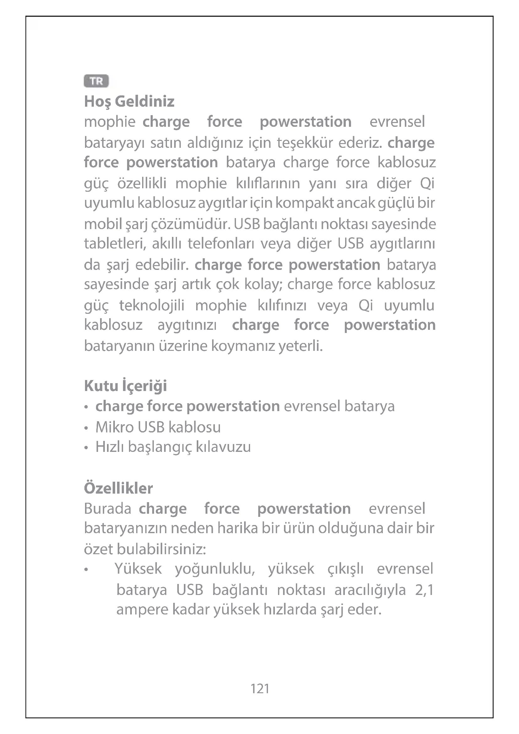mophie charge force powerstation evrensel bataryayı satın aldığınız için teşekkür ederiz. charge force powerstation batarya charge force kablosuz güç özellikleri mophie kılıflarının yanı sıra diğer Qi uyumlu kablosuz aygıtlar için kompakt ancak güçlü bir mobil şarj çözümüdür. USB bağlantı noktası sayesinde tabletleri, akıllı telefonları veya diğer USB aygıtlarını da şarj edebilir. charge force powerstation batarya sayesinde şarj artık çok kolay; charge force kablosuz güç teknolojili mophie kılıfınızı veya Qi uyumlu kablosuz aygıtınızı charge force powerstation bataryanın üzerine koymanız yeterli.