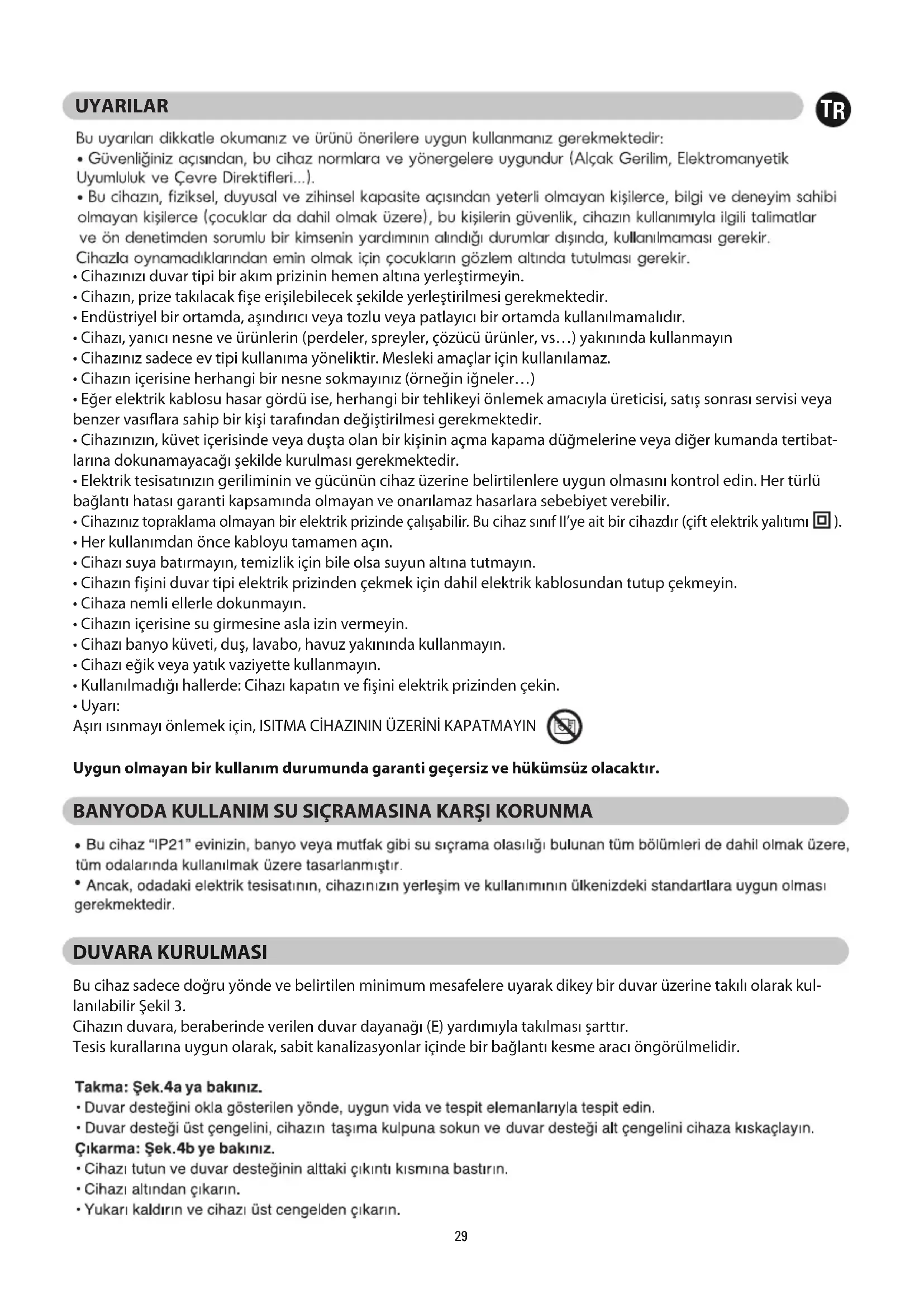 - Uyarı: Aşırı ısınmayı önlemek için, ISITMA CİHAZININ ÜZERİNİ KAPATMAYIN Uygun olmayan bir kullanım durumunda garanti geçersiz ve hükümsüz olacaktır.