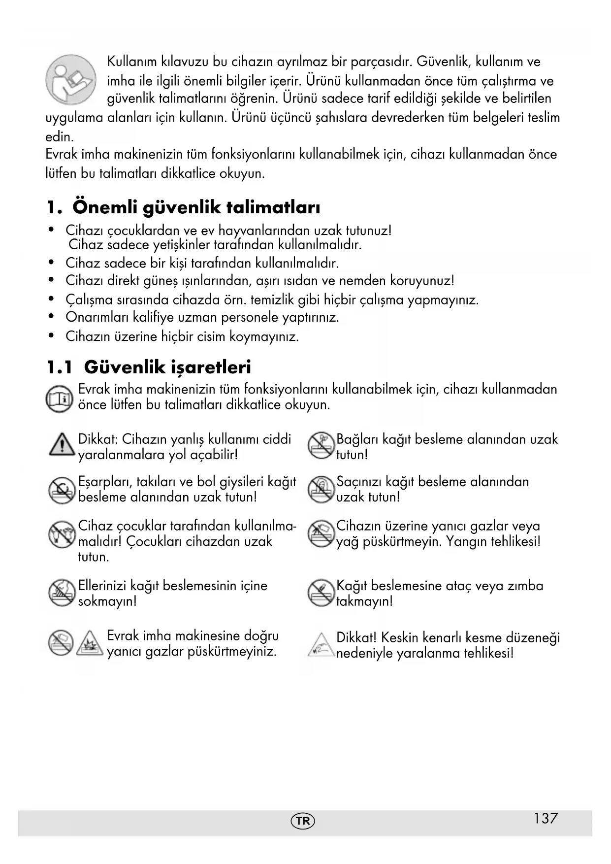 Evrak imha makinenizin tüm fonksiyonlarını kullanabilmek için, cihazı kullanmadan önce lütfen bu talimatları dikkatlice okuyun. Dikkat: Cihazın yanlış kullanımı ciddi yaralanmalara yol açabilir! Bağları kağıt besleme alanından uzak tutun! Eşarpları, takıları ve bol giysileri kağıt besleme alanından uzak tutun! Saçınızı kağıt besleme alanından uzak tutun! Cihaz çocuklar tarafından kullanılma- malıdır! Çocukları cihazdan uzak tutun. Cihazın üzerine yanıcı gazlar veya yağ püskürtmeyin. Yangın tehlikesi! Ellerinizi kağıt beslemesinin içine sokmayın! Kağıt beslemesine ataç veya zımba takmayın! Evrak imha makinesine doğru yanıcı gazlar püskürtmeyiniz. Dikkat! Keskin kenarlı kesme düzeneği nedeniyle yaralanma tehlikesi!138