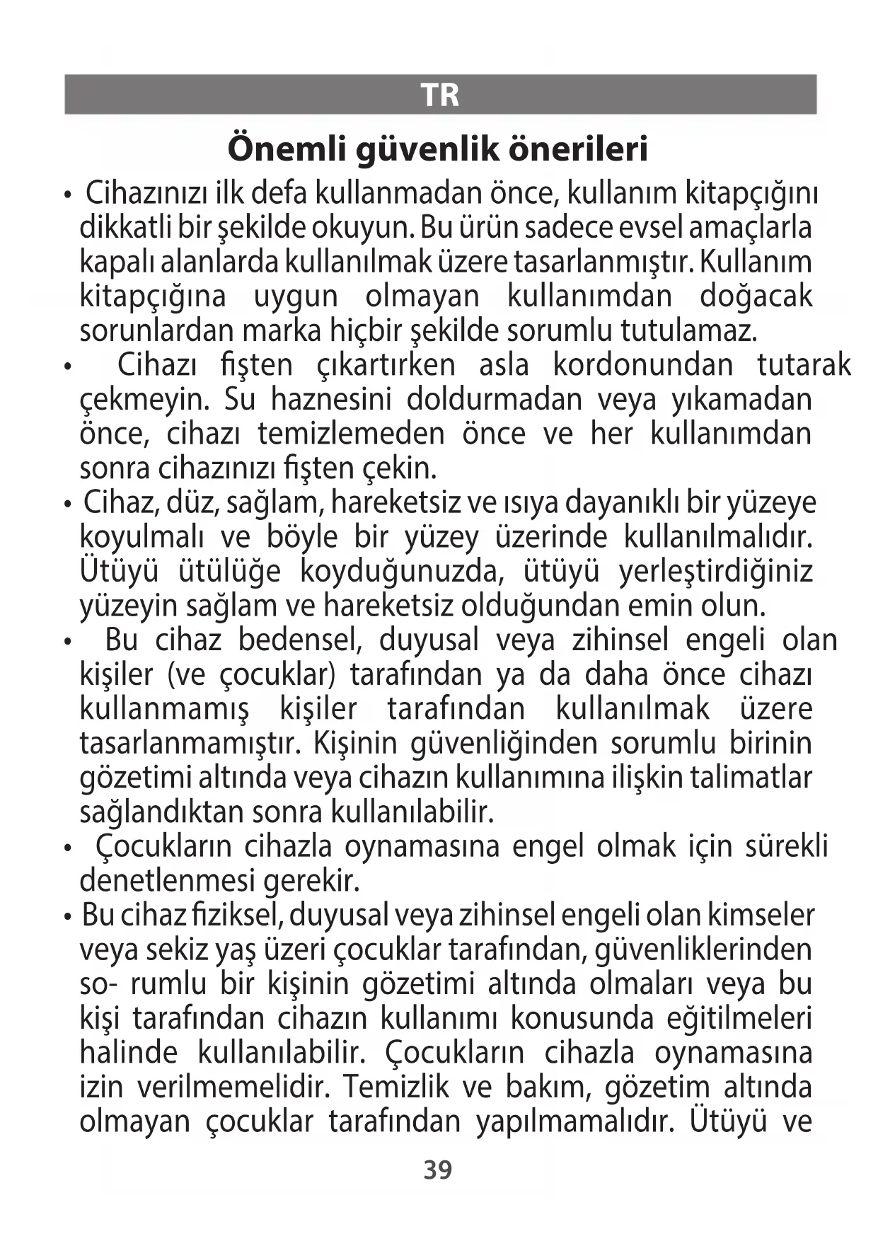 - Bu cihaz ziksel, duyusal veya zihinsel engeli olan kimseler veya sekiz yaş üzeri çocuklar tarafından, güvenliklerinden so- rumlu bir kişinin gözetimi altında olmaları veya bu kişi tarafından cihazın kullanımı konusunda eğitilmeleri halinde kullanılabilir. Çocukların cihazla oynamasına izin verilmemelidir. Temizlik ve bakım, gözetim altında olmayan çocuklar tarafından yapılmamalıdır. Ütüyü ve 39kablosunu, çalışırken veya soğuma sırasında 8 yaşından küçük çocukların ulaşamayacakları yerlerde muhafaza edin.
