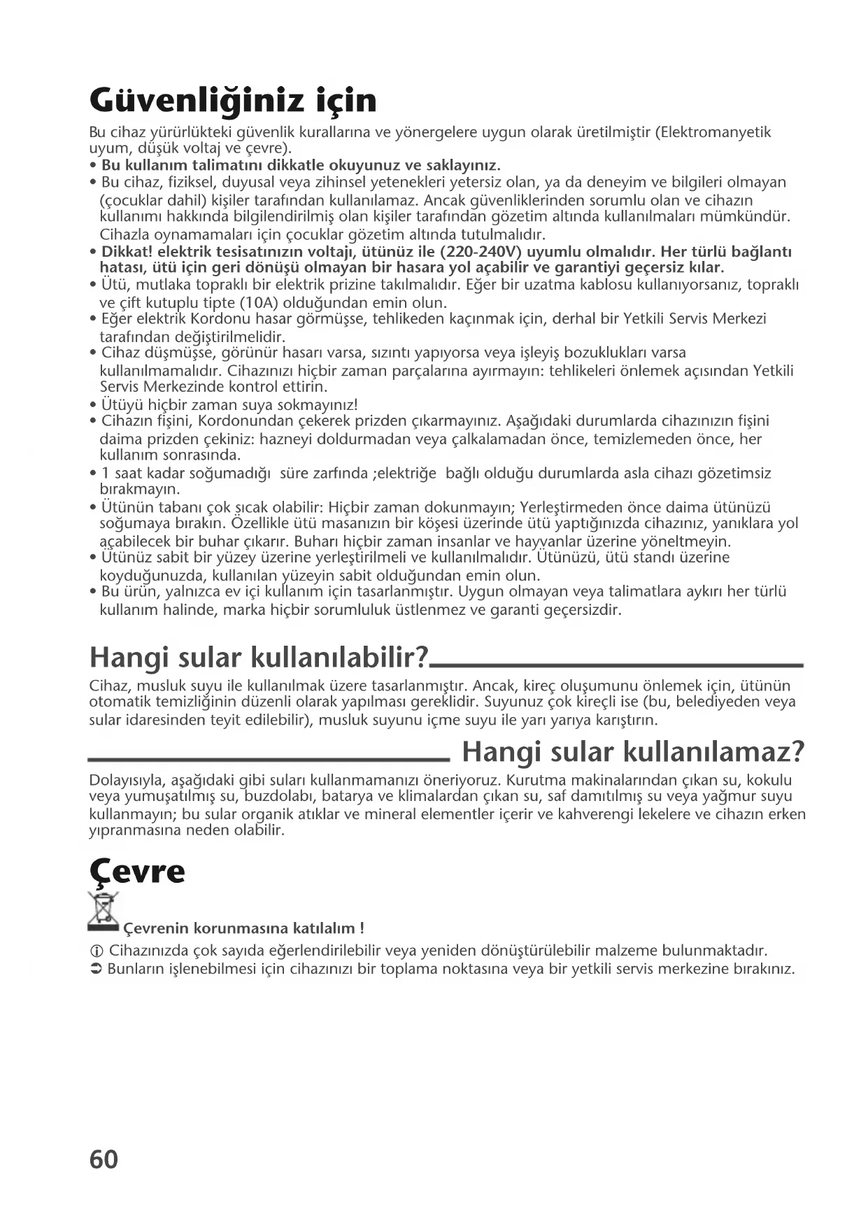 - Bu ürün, yaln›zca ev içi kullan›m için tasarlanm›flt›r. Uygun olmayan veya talimatlara ayk›r› her türlü kullan›m halinde, marka hiçbir sorumluluk üstlenmez ve garanti geçersizdir. Hangi sular kullan›labilir? Cihaz, musluk suyu ile kullan›lmak üzere tasarlanm›flt›r. Ancak, kireç oluflumunu önlemek için, ütünün otomatik temizli¤inin düzenli olarak yap›lmas› gereklidir. Suyunuz çok kireçli ise (bu, belediyeden veya sular idaresinden teyit edilebilir), musluk suyunu içme suyu ile yar› yar›ya kar›flt›r›n. Hangi sular kullan›lamaz? Dolay›s›yla, afla¤›daki gibi sular› kullanmaman›z› öneriyoruz. Kurutma makinalarından ç›kan su, kokulu veya yumuflat›lm›fl su, buzdolab›, batarya ve klimalardan ç›kan su, saf dam›t›lm›fl su veya ya¤mur suyu kullanmay›n; bu sular organik at›klar ve mineral elementler içerir ve kahverengi lekelere ve cihaz›n erken y›pranmas›na neden olabilir. Çevre Çevrenin korunmasına katılalım ! i Cihazınızda çok sayıda e¤erlendirilebilir veya yeniden dönüfltürülebilir malzeme bulunmaktadır. ‹ Bunların ifllenebilmesi için cihazınızı bir toplama noktasına veya bir yetkili servis merkezine bırakınız.
