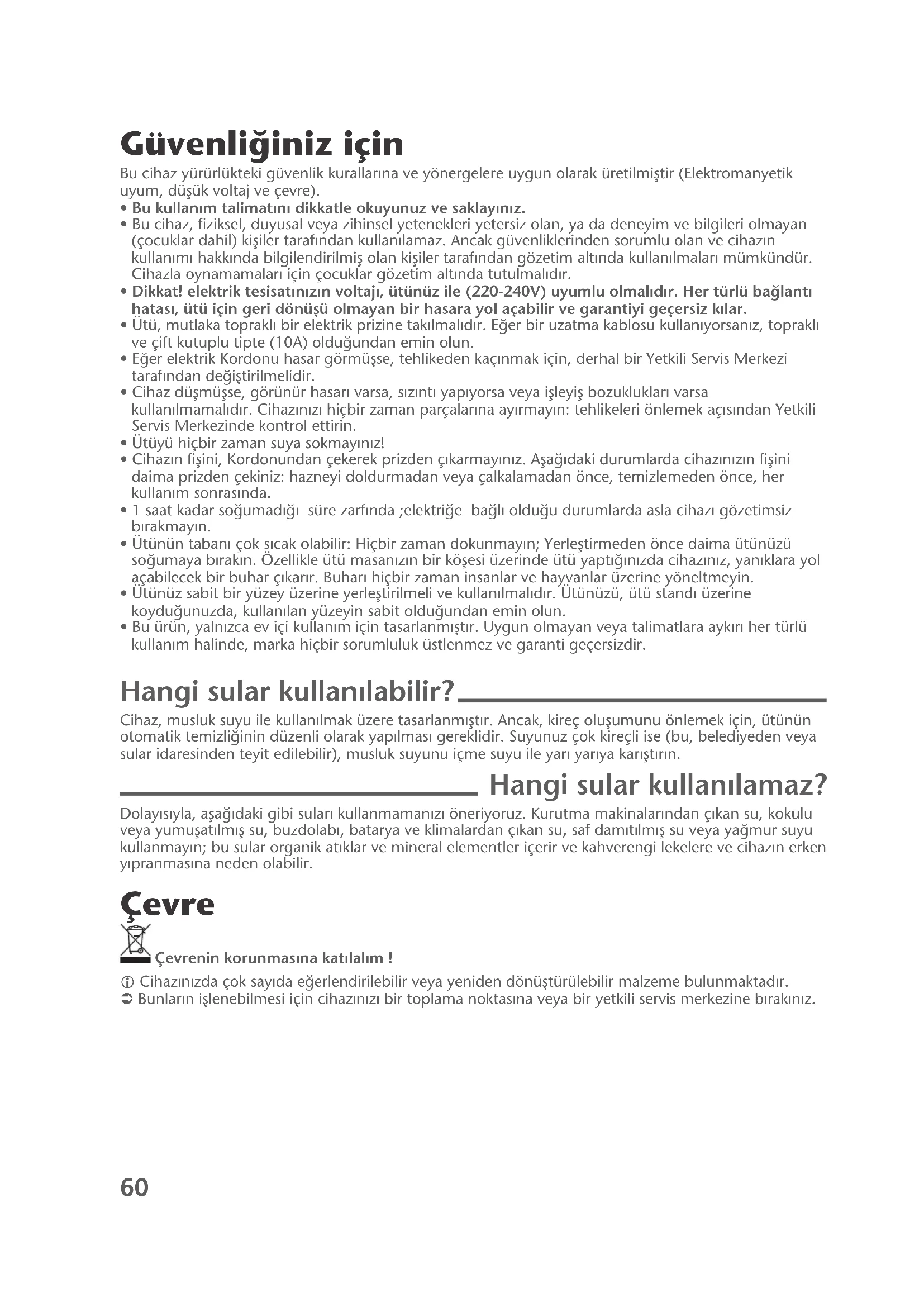 - Bu ürün, yaln›zca ev içi kullan›m için tasarlanm›flt›r. Uygun olmayan veya talimatlara ayk›r› her türlü kullan›m halinde, marka hiçbir sorumluluk üstlenmez ve garanti geçersizdir. Hangi sular kullan›labilir? Cihaz, musluk suyu ile kullan›lmak üzere tasarlanm›flt›r. Ancak, kireç oluflumunu önlemek için, ütünün otomatik temizli¤inin düzenli olarak yap›lmas› gereklidir. Suyunuz çok kireçli ise (bu, belediyeden veya sular idaresinden teyit edilebilir), musluk suyunu içme suyu ile yar› yar›ya kar›flt›r›n. Hangi sular kullan›lamaz? Dolay›s›yla, afla¤›daki gibi sular› kullanmaman›z› öneriyoruz. Kurutma makinalarından ç›kan su, kokulu veya yumuflat›lm›fl su, buzdolab›, batarya ve klimalardan ç›kan su, saf dam›t›lm›fl su veya ya¤mur suyu kullanmay›n; bu sular organik at›klar ve mineral elementler içerir ve kahverengi lekelere ve cihaz›n erken y›pranmas›na neden olabilir. Çevre Çevrenin korunmasına katılalım ! Cihazınızda çok sayıda e¤erlendirilebilir veya yeniden dönüfltürülebilir malzeme bulunmaktadır. Bunların ifllenebilmesi için cihazınızı bir toplama noktasına veya bir yetkili servis merkezine bırakınız.