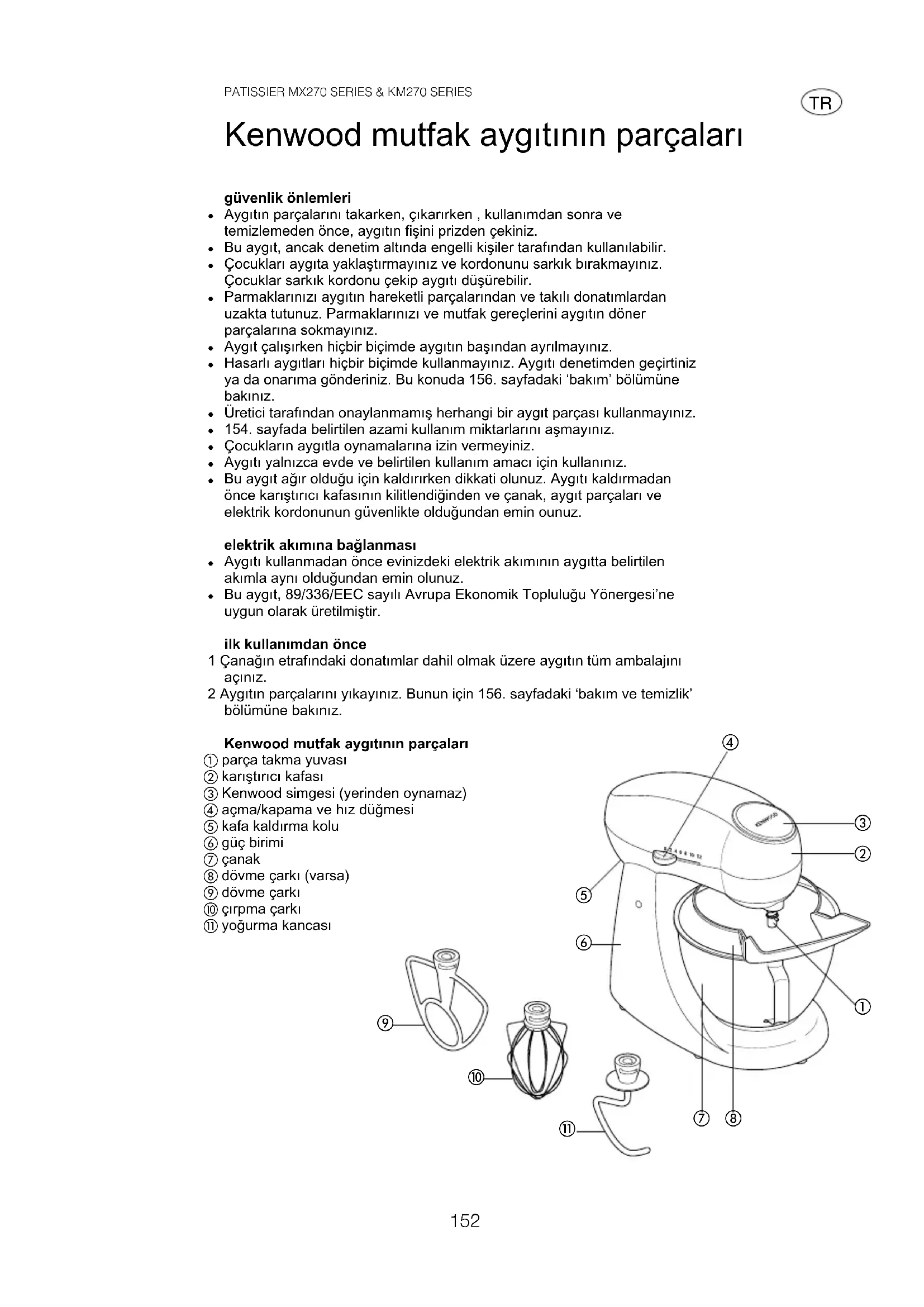 Bu aygıt, 89/336/EEC sayılı Avrupa Ekonomik Topluluğu Yönergesi’ne uygun olarak üretilmiştir. ilk kullanımdan önce 1 Çanağın etrafındaki donatımlar dahil olmak üzere aygıtın tüm ambalajını açınız. 2 Aygıtın parçalarını yıkayınız. Bunun için 156. sayfadaki ‘bakım ve temizlik’ bölümüne bakınız. Kenwood mutfak aygıtının parçaları parça takma yuvası karıştırıcı kafası Kenwood simgesi (yerinden oynamaz) açma/kapama ve hız düğmesi kafa kaldırma kolu güç birimi çanak dövme çarkı (varsa) dövme çarkı çırpma çarkı yoğurma kancası