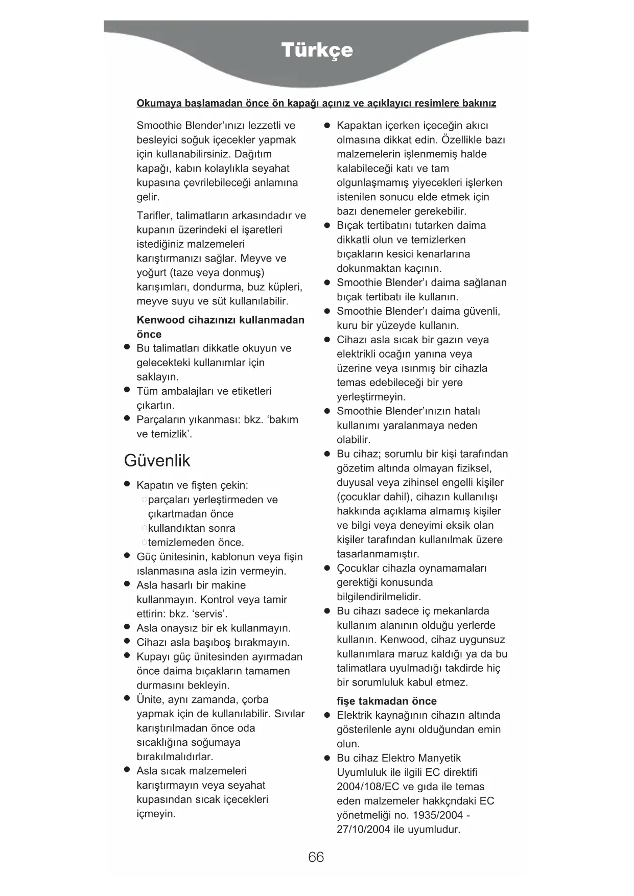 İÇİN ÖNEMLİ BİLGİ. Kullanım ömrünün sonunda ürün evsel atıklarla birlikte atılmamalıdır. Ürün yerel yetkililerce belirlenmiş atık toplama merkezine veya bu hizmeti sağlayan bir satıcıya götürülmelidir. Ev aletlerinin ayrı bir şekilde atılması çevre üzerindeki olası negatif etkileri azaltır ve aynı zamanda mümkün olan malzemelerin geri dönüşümünü sağlayarak önemli enerji ve kaynak tasarrufu sağlar. Ev aletlerinin ayrı olarak atılması gerekliliğini hatırlatmak amacıyla üzeri çarpı ile işaretlenmiş çöp kutusu resmi kullanılmıştır. 68tarifler Kahvaltı Smoothieleri breakfast 2GO 1 kişilik (300ml) 2 buz küpü 60ml yağsız süt 50g az yağlı yoğurt 2cm’lik dilimler halinde kesilmiş 50g muz 2cm’lik parçalar halinde kesilmiş 75g elma 5ml buğday tohumu 5ml akışkan bal 1 Buz küplerini, sütü ve yoğurdu kupaya yerleştirin. Sonra muzu, elmayı ve buğday tohumunu ekleyin. Karıştırmadan önce iyice çalkalayın. 25 saniyeliğine ‘low’ (düşük) hıza sonra da 20 saniyeliğine ‘high’ (yüksek) hıza ayarlayın. Tadını kontrol edin ve gerekirse bal ekleyin. kırmızı greyfurt yulafı 1 kişilik (250ml) 150ml kırmızı greyfurt suyu 50ml doğal tam yağlı yoğurt 2cm’lik dilimler halinde kesilmiş 50g muz 1 çorba kaşığı yulaf lapası 1 çorba kaşığı akışkan bal 1 Greyfurt suyunu ve yoğurdu kupaya ekleyin. Sonra muzu ve yulaf lapasını ekleyin. Karıştırmadan önce iyice çalkalayın. 2 15 saniyeliğine ‘high’ (yüksek) hıza ayarlayın. Tadını kontrol edin ve gerekirse bal ekleyin. nutty banana boost 1 kişilik (250ml) 75ml yarım yağlı süt 115g az yağlı fındıklı yoğurt 2cm’lik dilimler halinde kesilmiş 50g muz 3 yemeye hazır kuru kayısı, 1 cm’lik parçalar halinde kesilmiş 1 Sütü ve yoğurdu kupaya ekleyin. Sonra muzu ve kayısıyı ekleyin. Karıştırmadan önce iyice çalkalayın. 25 saniyeliğine ‘low’ (düşük) hıza sonra da 25 saniyeliğine ‘high’ (yüksek) hıza ayarlayın. 69Meyveli Smoothieler iced strawberry sensation 1 kişilik (250ml) 2 buz küpü 70ml elma suyu 60g kabuğu soyulmuş ve ikiye bölünmüş çilek 80g çekirdekleri ayrılmış ve 2cm’lik parçalar halinde kesilmiş kantalup kavun 5ml akışkan bal 1 Buz küplerini ve elma suyunu kupaya ekleyin. Sonra çilekleri ve kavunu ekleyin. 25 saniyeliğine ‘low’ (düşük) hıza sonra da 20 saniyeliğine ‘high’ (yüksek) hıza ayarlayın. Tadını kontrol edin ve gerekirse bal ekleyin. mango, ananas, çarkıfelek meyvesi sulu smoothie 1 kişilik (300ml) 150ml taze sıkılmış portakal suyu 2cm’lik parçalar halinde kesilmiş 85g olgun mango 2cm’lik parçalar halinde kesilmiş 65g ananas 1/2 çarkıfelek meyvesi 1 Portakal suyunu kupaya ekleyin. Sonra mangoyu, ananası ve çarkıfelek meyvesini ekleyin. 2 20 saniyeliğine ‘high’ (yüksek) hıza ayarlayın. papaya ve kayısı nektarı 1 kişilik (250ml) 100ml greyfurt suyu 100g süzülmüş şeftali parçası 70g çekirdekleri ayrılmış ve 2cm’lik parçalar halinde kesilmiş papaya 1 Greyfurt suyunu, şeftaliyi ve papayayı kupaya ekleyin. 2 15 saniyeliğine ‘high’ (yüksek) hıza ayarlayın. böğürtlenli smoothie 1 kişilik (250ml) 100ml kızılcık suyu 25ml elma suyu 75g ahududu 40g böğürtlen 1 Kızılcık ve elma suyunu kupaya ekleyin. Sonra böğürtlenleri ekleyin. 2 20 saniyeliğine ‘high’ (yüksek) hıza ayarlayın. ice cool fruity 1 kişilik (300ml) 2 buz küpü 100ml portakal suyu 2cm parçalar halinde kesilmiş 50g 1/2 kivi 75g kabuğu soyulmuş ve ikiye bölünmüş çilek 1 Buz küplerini ve portakal suyunu kupaya ekleyin. Sonra kiviyi ve çilekleri ekleyin. 25 saniyeliğine ‘low’ (düşük)’ hıza sonra da 20 saniyeliğine ‘high’ (yüksek) hıza ayarlayın. 70yaz meyveli smoothie 1 kişilik (250ml) 50g donmuş yaz meyvesi karışımı 200ml yarım yağlı süt 1 Meyveyi ve sütü kupaya ekleyin. 25 saniyeliğine ‘low’ (düşük) hıza sonra da 25 saniyeliğine ‘high’ (yüksek) hıza ayarlayın. Sebzeli Smoothieler minted lassi cooler 1 kişilik (250ml) 2 buz küpü 150ml doğal tam yağlı yoğurt Çekirdekleri alınmış ve 2cm’lik parçalar halinde kesilmiş 90g 1/4 soyulmuş salatalık 4 nane yaprağı 1 Buz küplerini, yoğurdu, salatalığı ve naneyi kupaya yerleştirin. 25 saniyeliğine ‘low’ (düşük) hıza sonra da 25 saniyeliğine ‘high’ (yüksek) hıza ayarlayın. avokadolu smoothie 1 kişilik (300ml) 200ml beyaz üzüm suyu 10ml limon suyu Çekirdeği çıkarılmış, soyulmuş ve 6 parçaya ayrılmış 50g 1/2 küçük avokado. Soyulmuş, göbeği alınmış ve 2cm’lik parçalar halinde kesilmiş 60g 1/2 olgun armut. isteğe göre birkaç damla acı sos 1 Üzüm ve limon suyunu, avokadoyu ve armudu kupaya yerleştirin 2 20 saniyeliğine ‘high’ (yüksek)’ hıza ayarlayın. pancarlı buzz 1 kişilik (250ml) 50ml taze sıkılmış portakal suyu 100ml elma suyu 15g rendelenmiş havuç Soyulmuş ve rendelenmiş 5g taze kök zencefil 2cm’lik parçalar halinde kesilmiş 50g pişirilmiş taze pancar. 1 Portakal ve elma suyunu kupaya ekleyin. Sonra havucu, zencefili ve pancarı ekleyin. 25 saniyeliğine ‘low’ (düşük) hıza sonra da 25 saniyeliğine ‘high’ (yüksek) hıza ayarlayın. 71Mixér můžete použít pro výrobu delikátních a výživných studených nápojů. Oddělující víko umožňuje snadno převést pracovní nádobu na cestovní nádobu. Na konci tohoto návodu naleznete výběr receptů a praktické značky na nádobě vám umožní namíchat ingredience podle vaší volby. Je možno kombinovat ovoce a jogurt (čerstvý nebo zmražený), zmrzlinu, kostky ledu a mléko. před použitím tohoto zařízení Kenwood