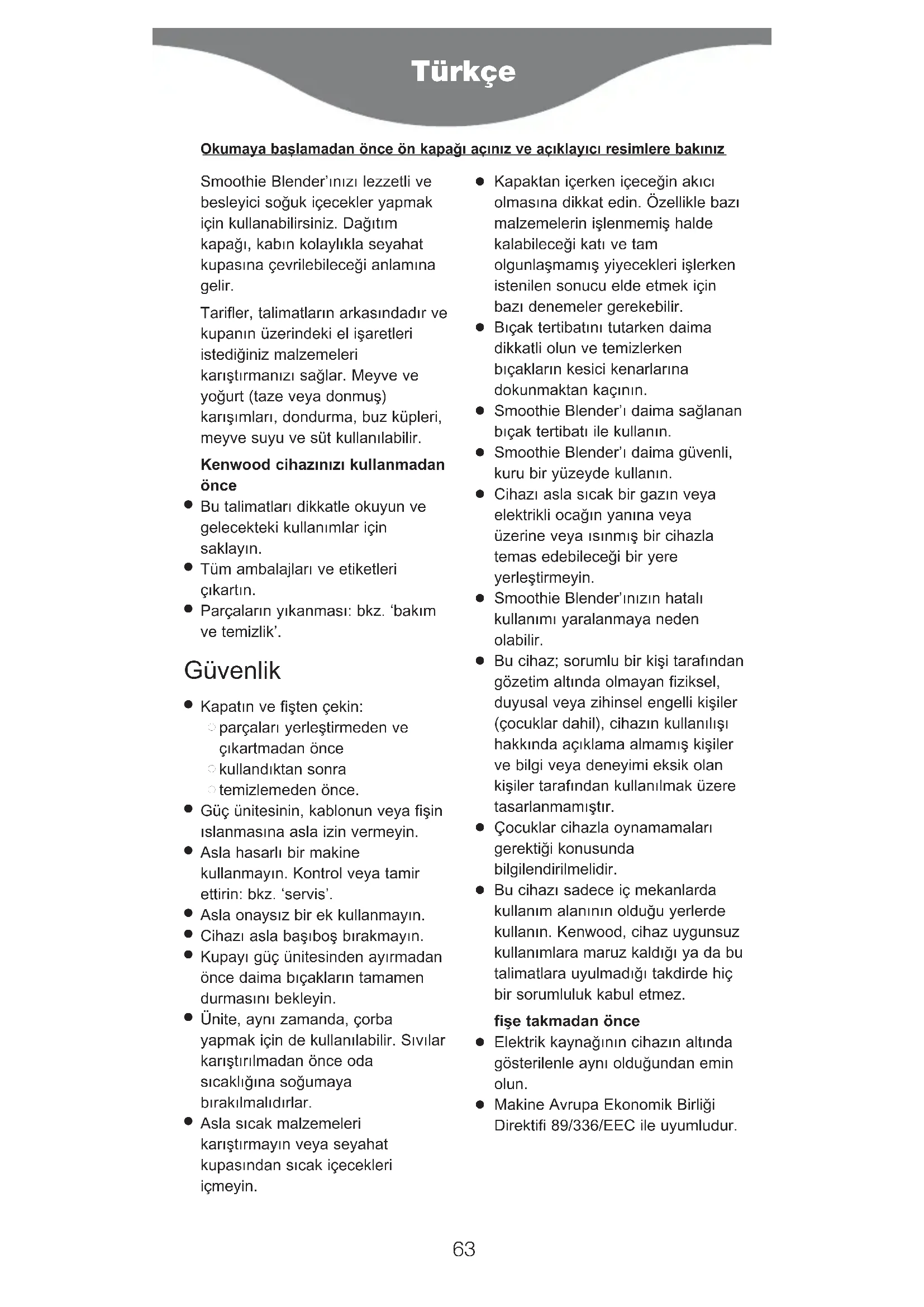 Bu cihazı sadece iç mekanlarda kullanım alanının olduğu yerlerde kullanın. Kenwood, cihaz uygunsuz kullanımlara maruz kaldığı ya da bu talimatlara uyulmadığı takdirde hiç bir sorumluluk kabul etmez. fişe takmadan önce