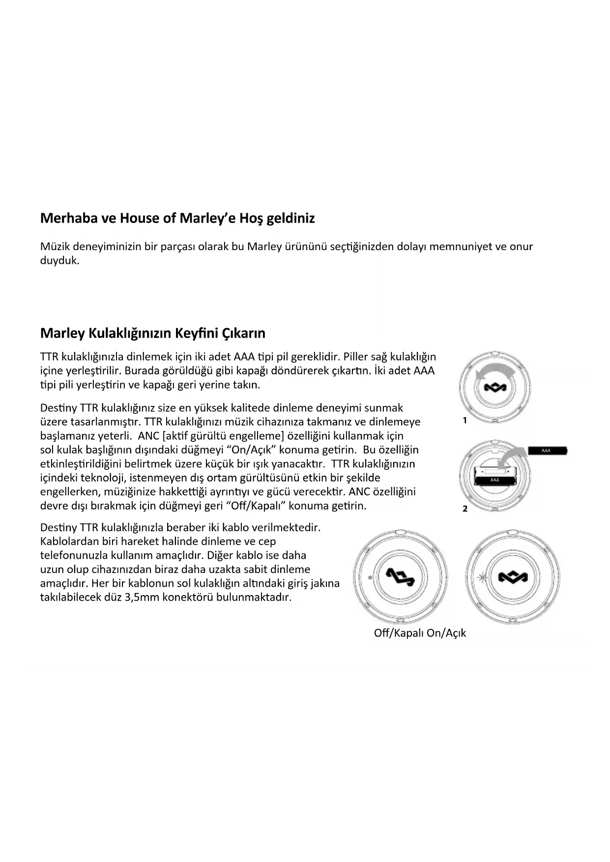 x3Bu işaret bu urunun AB genelinde diğer ev aklarıyla birlikte almaması gerekğini belirr. Kontrolsuz ağın cevre veya insan sağlığına olası zararları engellemek icin sorumlu bir şekilde geri donuşturulmesini ve malzeme kaynaklarının surdurebilir şekilde yeniden kullanılmasını sağlayın. Kullanılmış aygınızı iade etmek icin luen iade sistemlerini kullanın veya urunu san aldığınız perakende saş noktasıyla goruşun. Kendileri bu urunu cevreye zarar vermeyecek şekilde geri donuşturulmek uzere gerekli yere gonderebilirler. İki Yıl Sınırlı Garan The House Of Marley LLC şirke, bu ürünün malzeme ve işçiliğindeki kusurlar için, san alma tarihinden ibaren 2 yıl süresince sağlayacağı garan sağlar. Aşağıda belirlenler müstesna. The House Of Marley ürün garansi yanlış kullanım veya amacı dışında kullanım, kaza, onaysız herhangi bir aksesuarın takılması, ürünün değişrilmesi veya The House Of Marley şirkenin kontrolü dışındaki diğer başka koşullardan kaynaklanan hasarları kapsamaz. Bu garan, ürünün sadece İngiltere / Avrupa Birliği sınırları içinde san alınması ve çalışrılması durumunda geçerlidir. Tasarlanmış, ürelmiş, onaylanmış ve/veya yetkilendirilmiş olduğu Ülke dışındaki herhangi bir Ülkede çalışrılabilmesi için değişiklik veya uyarlama gerekren bir ürünün veya bu değişikliklerden dolayı hasar görmüş ürünlerin onarılması bu garannin kapsamına dahil değildir. The House Of Marley LLC şirke her türlü tesadü, dolaylı ve doğrudan meydana gelen hasarlardan sorumlu olmayacakr. Ürününüzle ilgili garan hizme alabilmek için lüen (san alma delili olarak )üzerinde tarih bulunan saş şinizle birlikte, ürünün san alındığı sacıya gidin. Sacı ürünü alır almaz, ürününüzün durumuna uygun olarak onaracak veya ürünü değişrecekr. Mağazaya gidemeyecek durumdaysanız, lüen The House Of Marley Müşteri Hizmetleriyle +44 203 441 1885 numaraları telefondan veya CS@thehouseofmarley.co.uk e-posta adresinden ileşime geçin. The House Of Marley PO Box 460, Tonbridge Kent TN9 9EW, UK The House Of Marley dışında başka bir sacının bu ürüne servis bakımı yapması bu garanyi geçersiz kılar. Bu garan kanuni haklarınızı etkilemez. Ürün grubumuzla ilgili daha fazla bilgi için lüen www.thehouseofmarley.com adresini ziyaret edin. Tüm Hakları Saklıdır. WEEE acıklamasıVitajte na webovej lokalite House of Marley Sme potešení a poctení tým, že ste si na počúvanie hudby vybrali tento výrobok značky Marley. Užite si slúchadlá značky Marley Do slúchadiel TTR treba vložiť dve batérie typu AAA. Batérie sa vkladajú do pravého slúchadla. Odmontujte dvierka: otáčajte nimi podľa obrázka. Vložte dve batérie typu AAA a nasaďte dvierka. Slúchadlá Desny TTR ponúkajú maximálnu kvalitu poslucháčskeho zážitku. Pripojte slúchadlá TTR k prístroju na prehrávanie a môžete začať. Ak chcete využiť funkciu ANC [akvne rušenie hluku], otočte gombík na vonkajšej strane ľavého krytu slúchadla do polohy On (Zapnuté). Rozsvie sa malá kontrolka, ktorá signalizuje zapnue funkcie. Technológia, ktorá je súčasťou slúchadiel TTR, bude akvne rušiť neželaný vonkajší hluk a zároveň vám poskytne presnosť a výkon, aké hudba vyžaduje. Ak chcete funkciu ANC vypnúť, otočte gombík do polohy O (Vypnuté). Slúchadlá Desny TTR sú vybavené dvoma káblikmi. Jeden káblik je určený na cesty na pripojenie mobilného telefónu. Druhý káblik je dlhší a používa sa na stacionárne počúvanie na pripojenie ku vzdialenejšiemu zvukovému zariadeniu. Každý káblik má priamy 3,5 mm konektor, ktorý možno pripojiť k vstupnej koncovke v dolnej čas ľavého slúchadla. “O” Position “On” Position Off On AAA AAA