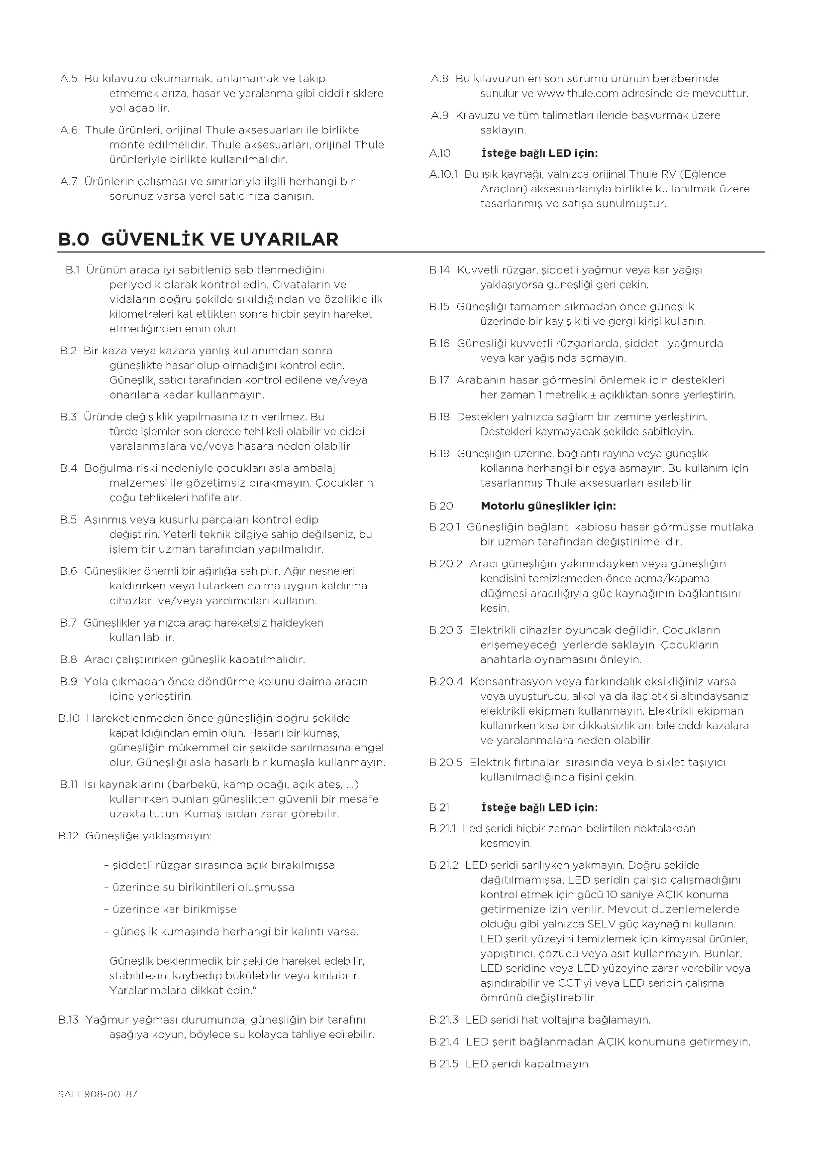 B.1 Ürünün araca iyi sabitlenip sabitlenmediğini periyodik olarak kontrol edin. Cıvataların ve vidaların doğru şekilde sıkıldığından ve özellikle ilk kilometreleri kat ettikten sonra hiçbir şeyin hareket etmediğinden emin olun. B.2 Bir kaza veya kazara yanlış kullanımdan sonra güneşlikte hasar olup olmadığını kontrol edin. Güneşlik, satıcı tarafından kontrol edilene ve/veya onarılana kadar kullanmayın. B.3 Üründe değişiklik yapılmasına izin verilmez. Bu türde işlemler son derece tehlikeli olabilir ve ciddi yaralanmalara ve/veya hasara neden olabilir. B.4 Boğulma riski nedeniyle çocukları asla ambalaj malzemesi ile gözetimsiz bırakmayın. Çocukların çoğu tehlikeleri hafife alır. B.5 Aşınmış veya kusurlu parçaları kontrol edip değiştirin. Yeterli teknik bilgiye sahip değilseniz, bu işlem bir uzman tarafından yapılmalıdır. B.6 Güneşlikler önemli bir ağırlığa sahiptir. Ağır nesneleri kaldırırken veya tutarken daima uygun kaldırma cihazları ve/veya yardımcıları kullanın. B.7 Güneşlikler yalnızca araç hareketsiz haldeyken kullanılabilir. B.8 Aracı çalıştırırken güneşlik kapatılmalıdır. B.9 Yola çıkmadan önce döndürme kolunu daima aracın içine yerleştirin. B.10 Hareketlenmeden önce güneşliğin doğru şekilde kapatıldığından emin olun. Hasarlı bir kumaş, güneşliğin mükemmel bir şekilde sarılmasına engel olur. Güneşliği asla hasarlı bir kumaşla kullanmayın. B.11 Isı kaynaklarını (barbekü, kamp ocağı, açık ateş, ...) kullanırken bunları güneşlikten güvenli bir mesafe uzakta tutun. Kumaş ısıdan zarar görebilir. B.12 Güneşliğe yaklaşmayın: – şiddetli rüzgar sırasında açık bırakılmışsa – üzerinde su birikintileri oluşmuşsa – üzerinde kar birikmişse – güneşlik kumaşında herhangi bir kalıntı varsa. Güneşlik beklenmedik bir şekilde hareket edebilir, stabilitesini kaybedip bükülebilir veya kırılabilir. Yaralanmalara dikkat edin." B.13 Yağmur yağması durumunda, güneşliğin bir tarafını aşağıya koyun, böylece su kolayca tahliye edilebilir. B.14 Kuvvetli rüzgar, şiddetli yağmur veya kar yağışı yaklaşıyorsa güneşliği geri çekin. B.15 Güneşliği tamamen sıkmadan önce güneşlik üzerinde bir kayış kiti ve gergi kirişi kullanın. B.16 Güneşliği kuvvetli rüzgarlarda, şiddetli yağmurda veya kar yağışında açmayın. B.17 Arabanın hasar görmesini önlemek için destekleri her zaman 1 metrelik ± açıklıktan sonra yerleştirin. B.18 Destekleri yalnızca sağlam bir zemine yerleştirin. Destekleri kaymayacak şekilde sabitleyin. B.19 Güneşliğin üzerine, bağlantı rayına veya güneşlik kollarına herhangi bir eşya asmayın. Bu kullanım için tasarlanmış Thule aksesuarları asılabilir. B.20 Motorlu güneşlikler için: B.20.1 Güneşliğin bağlantı kablosu hasar görmüşse mutlaka bir uzman tarafından değiştirilmelidir. B.20.2 Aracı güneşliğin yakınındayken veya güneşliğin kendisini temizlemeden önce açma/kapama düğmesi aracılığıyla güç kaynağının bağlantısını kesin. B.20.3 Elektrikli cihazlar oyuncak değildir. Çocukların erişemeyeceği yerlerde saklayın. Çocukların anahtarla oynamasını önleyin. B.20.4 Konsantrasyon veya farkındalık eksikliğiniz varsa veya uyuşturucu, alkol ya da ilaç etkisi altındaysanız elektrikli ekipman kullanmayın. Elektrikli ekipman kullanırken kısa bir dikkatsizlik anı bile ciddi kazalara ve yaralanmalara neden olabilir. B.20.5 Elektrik fırtınaları sırasında veya bisiklet taşıyıcı kullanılmadığında fişini çekin. B.21 İsteğe bağlı LED için: B.21.1 Led şeridi hiçbir zaman belirtilen noktalardan kesmeyin. B.21.2 LED şeridi sarılıyken yakmayın. Doğru şekilde dağıtılmamışsa, LED şeridin çalışıp çalışmadığını kontrol etmek için gücü 10 saniye AÇIK konuma getirmenize izin verilir. Mevcut düzenlemelerde olduğu gibi yalnızca SELV güç kaynağını kullanın. LED şerit yüzeyini temizlemek için kimyasal ürünler, yapıştırıcı, çözücü veya asit kullanmayın. Bunlar, LED şeridine veya LED yüzeyine zarar verebilir veya aşındırabilir ve CCT'yi veya LED şeridin çalışma ömrünü değiştirebilir. B.21.3 LED şeridi hat voltajına bağlamayın. B.21.4 LED şerit bağlanmadan AÇIK konumuna getirmeyin. B.21.5 LED şeridi kapatmayın. SAFE908-00 87B.21.6 LED şeridine herhangi bir eşya asmayın veya sabitlemeyin. B.21.7 Açıkken doğrudan LED şeridine bakmayın. B.21.8 LED lambalara veya dahili devreye zarar vermemek için LED şeridi mekanik olarak zorlamayın veya 60 mm çaptan fazla kıvırmayın, LED şeridi eğmeyin. B.21.9 LED şeridi bükmeyin. B.21.10 Maksimum performansı elde etmek için her 5 metrenin uygun bir güç kaynağına veya bir kontrolöre bağlanması gerekir. Seri devre ile bağlanan birkaç LED şerit, ışık düşüşünden etkilenebilir. B.21.11 Statik elektrik (ESD) LED şeridine zarar verebilir. LED şeridi tutmak için bir bileklik veya anti-elektrostatik eldiven kullanılması önerilir. LED şeridin yerleştirildiği ekipmanda aşırı gerilimi önlemek için uygun önlemlerin alınması da önerilir. B.21.12 Elektrik bağlantısına zarar vermemek için LED şeridi yerleştirdikten sonra bağlantı kablosunu çekmeyin. B.21.13 Ters polarite, LED şerit için tehlikelidir. Lütfen pozitif ve negatif bağlantıya dikkat ederek bunları karıştırmayın. B.21.14 LED şeridine zarar verebilecek fazla voltaj veya dalgalanmayı önlemek için kaliteli bir güç kaynağı kullanılması önerilir. C.0 SÜRÜŞ ÖZELLİKLERİ VE YÖNETMELİKLER C.1 Ürün kurulduktan sonra aracın sürüş özellikleri, frenleme davranışı ve yandan gelen rüzgara karşı hassasiyeti değişebilir. C.2 Herhangi bir ürün takılırken aracın toplam boyutlarının artabileceğini unutmayın. C.3 Aracın hızı mutlaka yol tipi, yol k