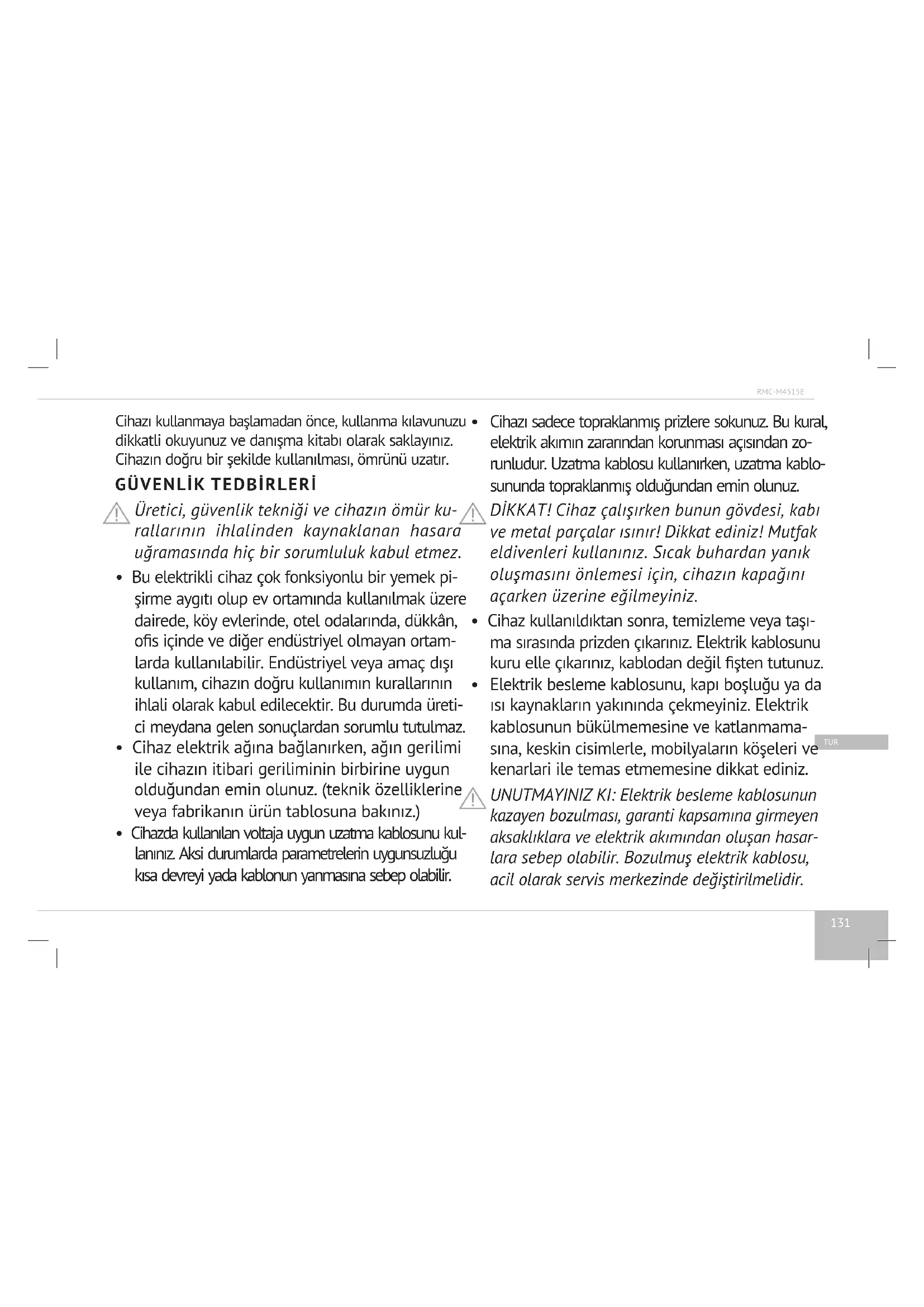 Kurallara uygun kullanım İlk kullanımdan önce kullanma kılavuzunu dikkatlice oku- yunuz. Böylece kendinizi ve cihazınızı olu- şabilecek zararlardan korumuş oluruz. Ciha- zı sadece monte edilmiş vaziyette kullanınız. Ancak bu şekilde elektrik ileten bölümlere temas etme tehlikesi ortadan kalkabilir. Besinlerin özenle hazırlanması sağlığınız açısın- dan çok önemlidir. Bu cihazı kapağı açık olarak kullanmayınız. Evdeki Çocuklar Bu cihaz 8 yaşından büyük çocuklar ve ziksel, duy- gusal ve zihinsel kapasitesinde eksiklik, sorun ve- yahut cihaza dair tecrübe eksikliği olan veyahut133 RMC-M4515E TUR kullanım kitabını okumayacak veyahut anlayama- yacak, güvenlik önlemlerini uygulamayacak kişiler tarafından kesinlikle yalnız başına kullanılmama- lıdır. Yukarıda anılan kişiler ve 8 yaşından büyük çocuklar yanlarında ürünü tanıyan ve güvenlik önlemlerini alabilecek bir refakatçi ile kullanmalı- dır. Çocuklar kesinlikle ürünle veyahut elektrik bağ- lantıları ile oynamamalıdır. 8 yaşın altındaki çocuk- lar kesinlikle cihaza yaklaştırılmamalıdır. Cihazın bakım ve temizliği kesinlikle başlarında refakatçi olmaksızın çocuklar tarafından yapılmamalıdır. Cihaz çalışır iken ısınır ve kapatıldıktan sonra da bir süre sıcak kalır. Yanık tehlikesi açısından soğuyun- caya kadar çocukları ocaktan uzak tutunuz. Çocuk- ların ilgisini çekebilecek eşyaları ürünün üstüne ve arkasına koymayınız. Çünkü çocuklar bunları almak için cihazın üzerine çıkmak isteyecektir. Yanık tehlikesi! Çocukların cihaz ile oynama- sına ve içine açmasına izin vermeyiniz. Amba- laj malzemeleri çocuklar için tehlikeli olabilir (folyo ve stropor gibi). Boğulma tehlikesi! Am- balaj malzemelerini çocuklardan uzak yerler- de saklayınız veya mümkün olduğunca çabuk evden çıkartınız. Artık kullanılmayan cihazın elektrik bağlantısı evde oynayan çocuklar için bir tehlike yaratmaması açısından sökülmeli ve tüm kablolar ortadan kaldırılmalıdır. Diğer Tehlikelerden Korunma Cihaz yakınındaki bir prizden faydalanırken, kablonun sıcak cihaza temas etmemesine dikkat ediniz. Kablo izolasyonu zarar görebilir. Cereyan çarpma tehlikesi.