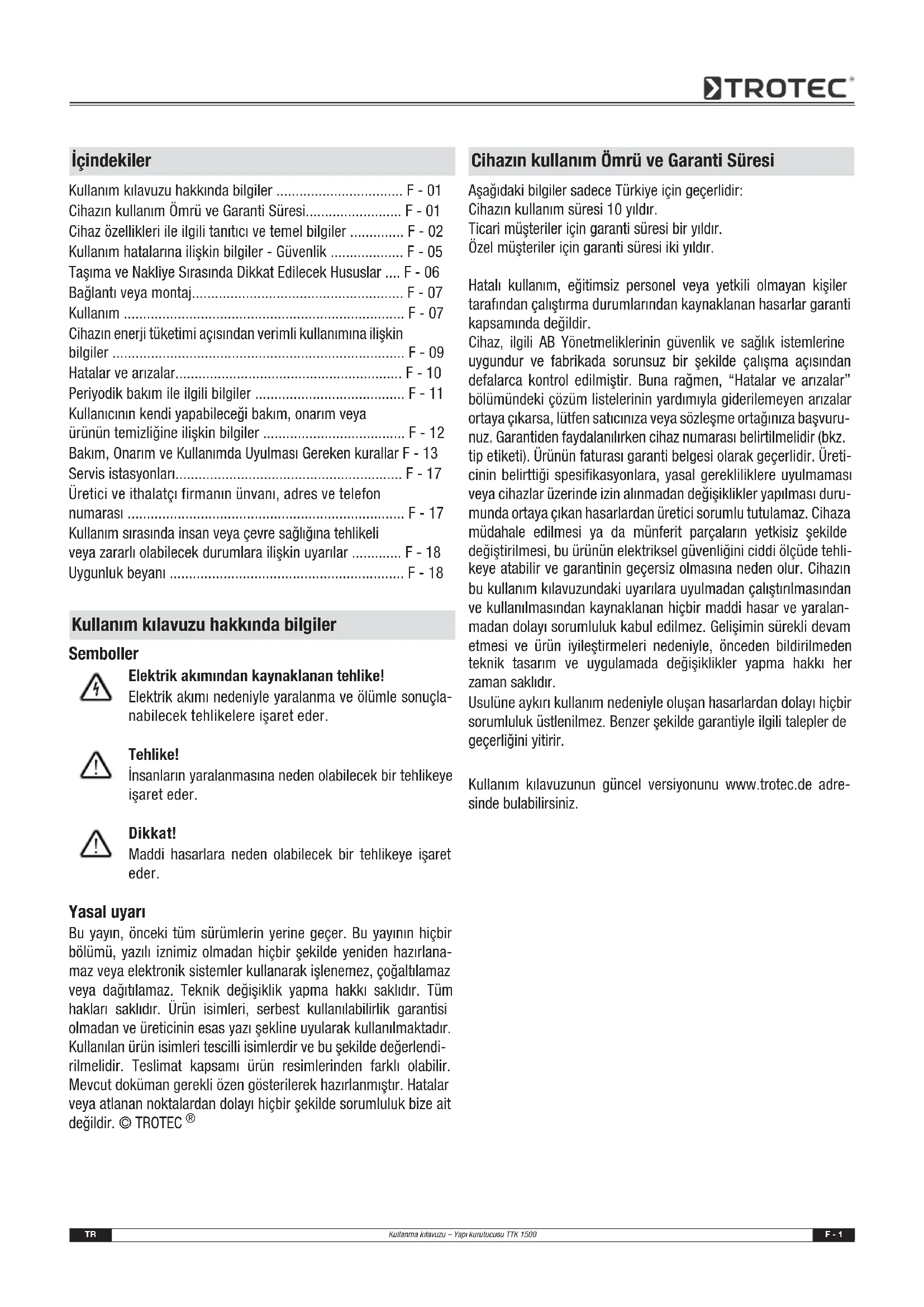IEC 62233:2005 De -markering vindt u op het typeplaatje van het apparaat. Fabrikant: Trotec GmbH & Co. KG Grebbener Straße 7 D-52525 Heinsberg Telefoon: +49 2452 962-400 Fax: +49 2452 962-200 E-mail: info@trotec.de Heinsberg, 30-10-2009 Bedrijfsleider: Detlef von der Lieck Recycling ConformiteitsverklaringTR Kullanma kılavuzu – Yapı kurutucusu TTK 1500 F - 1 Semboller Elektrik akımından kaynaklanan tehlike! Elektrik akımı nedeniyle yaralanma ve ölümle sonuçla- nabilecek tehlikelere işaret eder. Tehlike! İnsanların yaralanmasına neden olabilecek bir tehlikeye işaret eder. Dikkat! Maddi hasarlara neden olabilecek bir tehlikeye işaret eder. Yasal uyarı Bu yayın, önceki tüm sürümlerin yerine geçer. Bu yayının hiçbir bölümü, yazılı iznimiz olmadan hiçbir şekilde yeniden hazırlana- maz veya elektronik sistemler kullanarak işlenemez, çoğaltılamaz veya dağıtılamaz. Teknik değişiklik yapma hakkı saklıdır. Tüm hakları saklıdır. Ürün isimleri, serbest kullanılabilirlik garantisi olmadan ve üreticinin esas yazı şekline uyularak kullanılmaktadır. Kullanılan ürün isimleri tescilli isimlerdir ve bu şekilde değerlendi- rilmelidir. Teslimat kapsamı ürün resimlerinden farklı olabilir. Mevcut doküman gerekli özen gösterilerek hazırlanmıştır. Hatalar veya atlanan noktalardan dolayı hiçbir şekilde sorumluluk bize ait değildir. © TROTEC