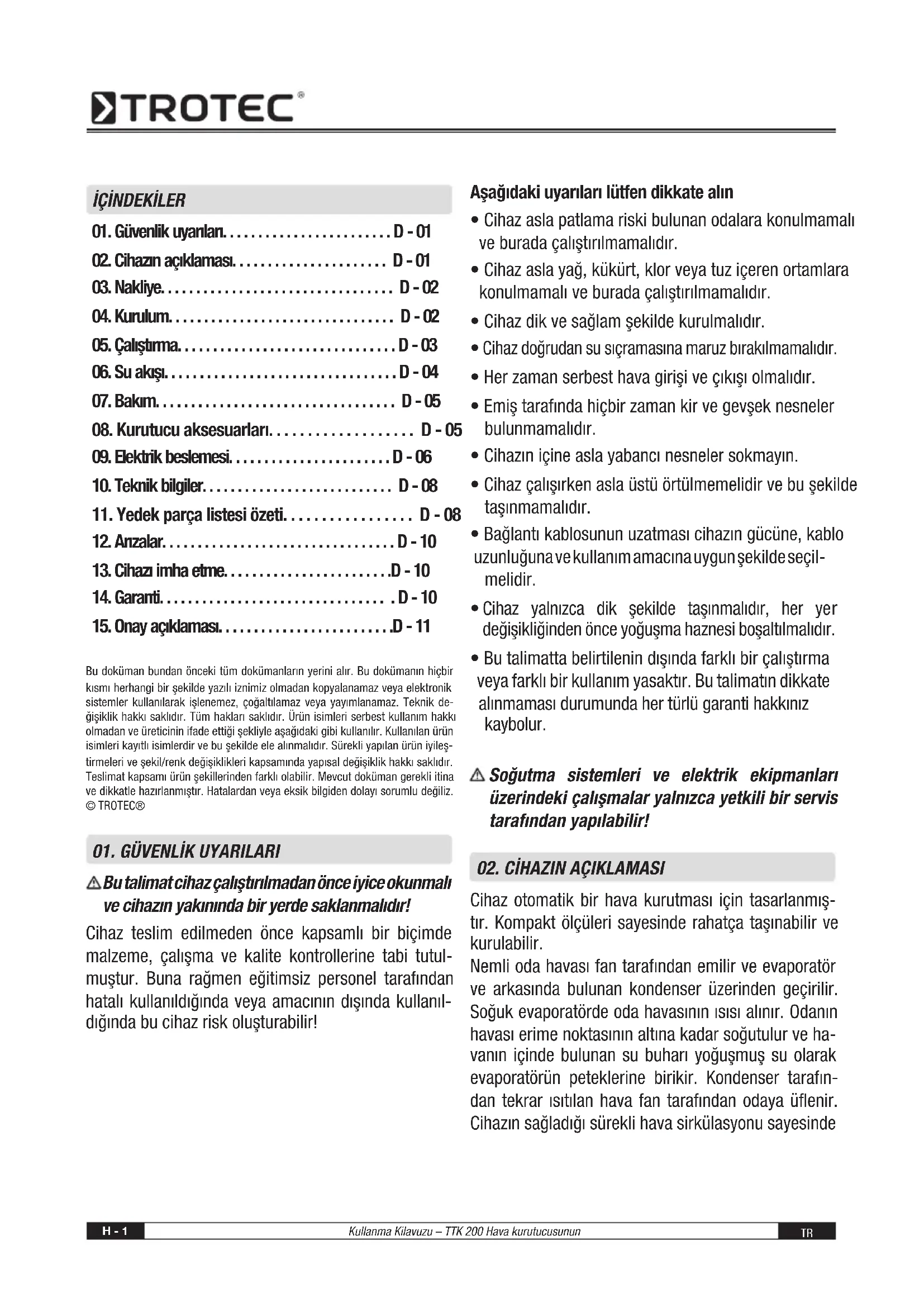 AKullanma Kilavuzu – TTK 200 Hava kurutucusunun H - 3