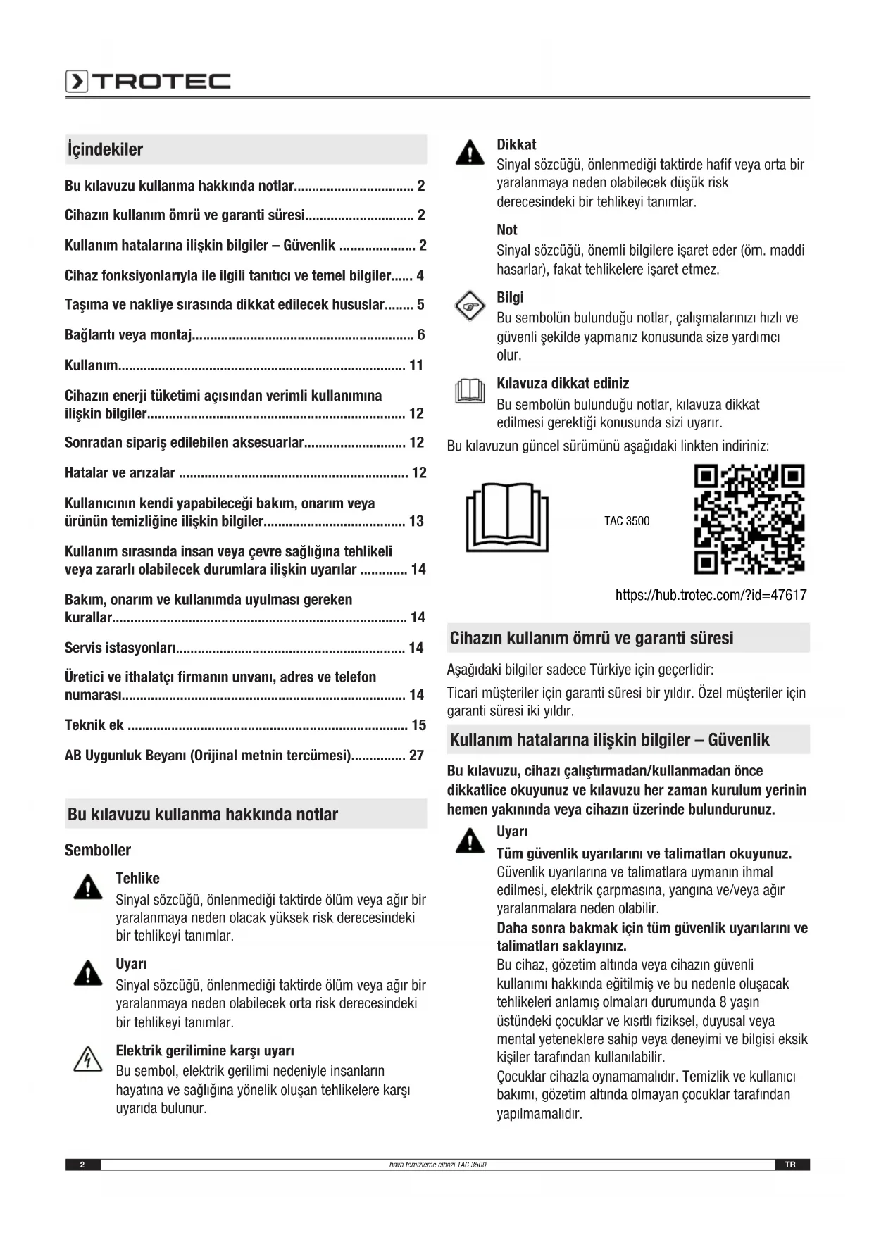 - AB Uygunluk Beyanı (Orijinal metnin tercümesi) Bu kılavuzu kullanma hakkında notlar Semboller Tehlike Sinyal sözcüğü, önlenmediği taktirde ölüm veya ağır bir yaralanmaya neden olacak yüksek risk derecesindeki bir tehlikeyi tanımlar. Uyarı Sinyal sözcüğü, önlenmediği taktirde ölüm veya ağır bir yaralanmaya neden olabilecek orta risk derecesindeki bir tehlikeyi tanımlar. Elektrik gerilimine karşı uyarı Bu sembol, elektrik gerilimi nedeniyle insanların hayatına ve sağlığına yönelik oluşan tehlikelere karşı uyarıda bulunur. Dikkat Sinyal sözcüğü, önlenmediği taktirde hafif veya orta bir yaralanmaya neden olabilecek düşük risk derecesindeki bir tehlikeyi tanımlar. Not Sinyal sözcüğü, önemli bilgilere işaret eder (örn. maddi hasarlar), fakat tehlikelere işaret etmez. Bilgi Bu sembolün bulunduğu notlar, çalışmalarınızı hızlı ve güvenli şekilde yapmanız konusunda size yardımcı olur. Kılavuza dikkat ediniz Bu sembolün bulunduğu notlar, kılavuza dikkat edilmesi gerektiği konusunda sizi uyarır. Bu kılavuzun güncel sürümünü aşağıdaki linkten indiriniz: TAC 3500 https://hub.trotec.com/?id=47617 Cihazın kullanım ömrü ve garanti süresi Aşağıdaki bilgiler sadece Türkiye için geçerlidir: Ticari müşteriler için garanti süresi bir yıldır. Özel müşteriler için garanti süresi iki yıldır. Kullanım hatalarına ilişkin bilgiler – Güvenlik Bu kılavuzu, cihazı çalıştırmadan/kullanmadan önce dikkatlice okuyunuz ve kılavuzu her zaman kurulum yerinin hemen yakınında veya cihazın üzerinde bulundurunuz. Uyarı Tüm güvenlik uyarılarını ve talimatları okuyunuz. Güvenlik uyarılarına ve talimatlara uymanın ihmal edilmesi, elektrik çarpmasına, yangına ve/veya ağır yaralanmalara neden olabilir. Daha sonra bakmak için tüm güvenlik uyarılarını ve talimatları saklayınız. Bu cihaz, gözetim altında veya cihazın güvenli kullanımı hakkında eğitilmiş ve bu nedenle oluşacak tehlikeleri anlamış olmaları durumunda 8 yaşın üstündeki çocuklar ve kısıtlı fiziksel, duyusal veya mental yeteneklere sahip veya deneyimi ve bilgisi eksik kişiler tarafından kullanılabilir. Çocuklar cihazla oynamamalıdır. Temizlik ve kullanıcı bakımı, gözetim altında olmayan çocuklar tarafından yapılmamalıdır.TR 3 hava temizleme cihazı TAC 3500 p. 27
